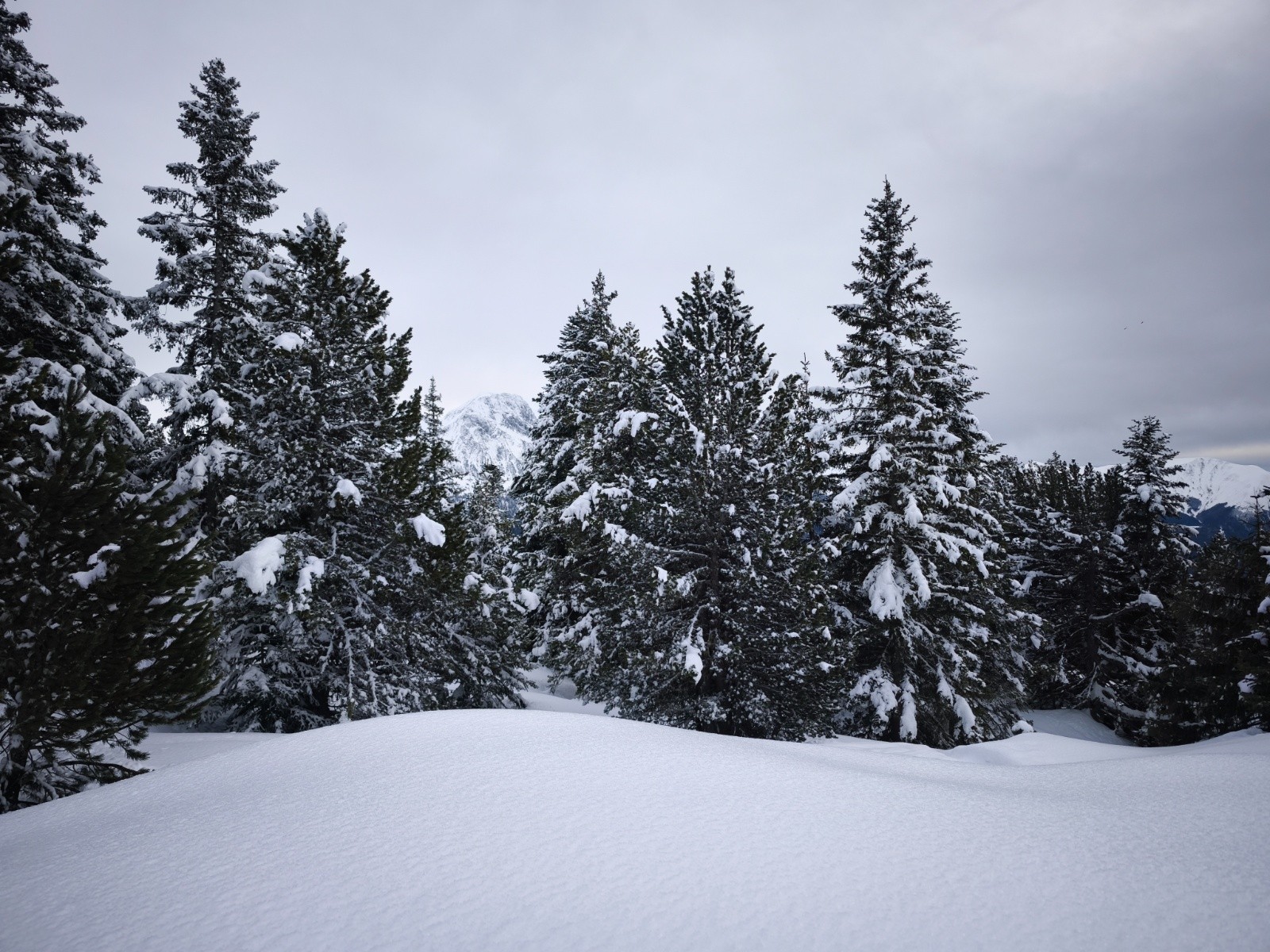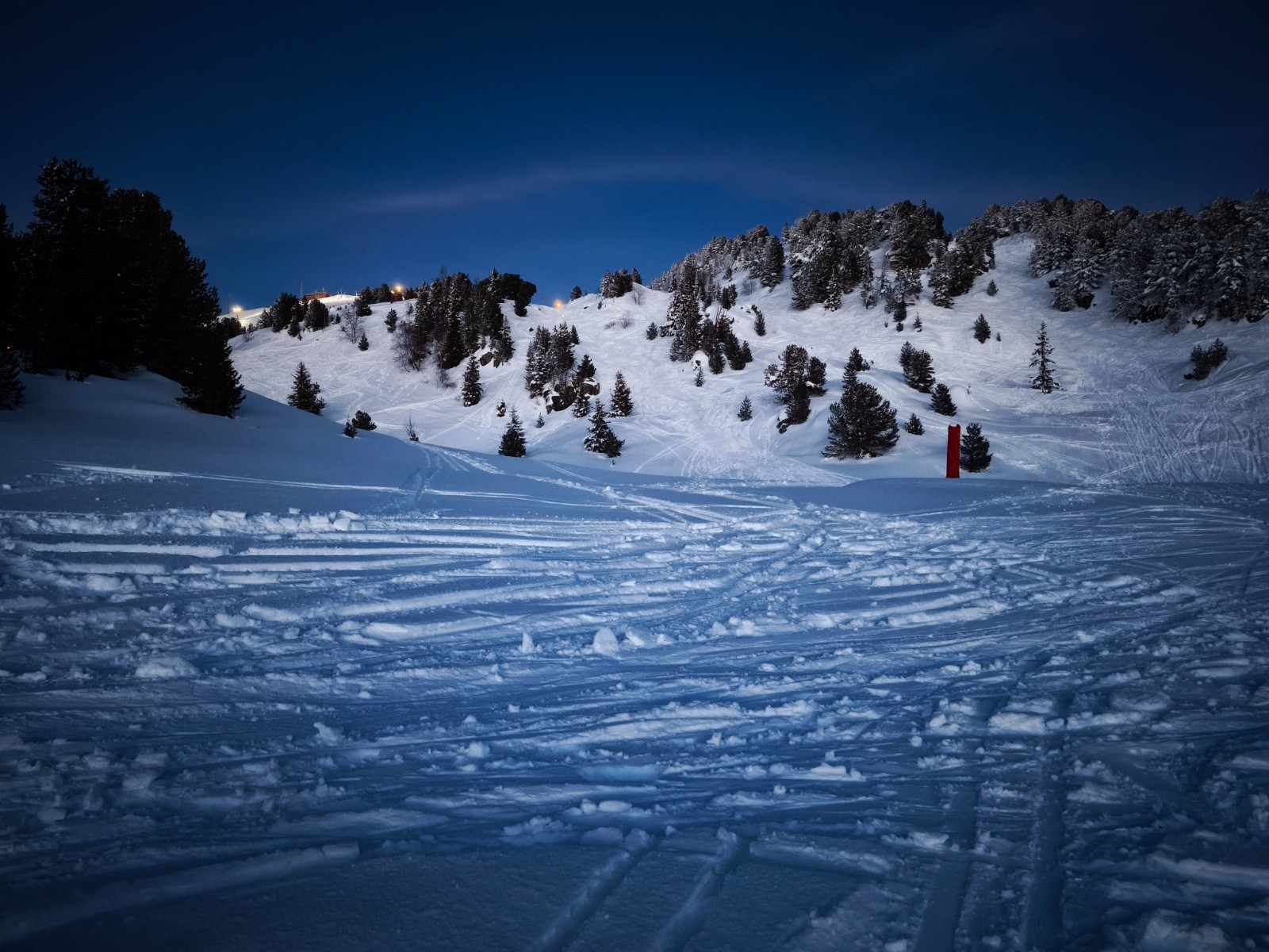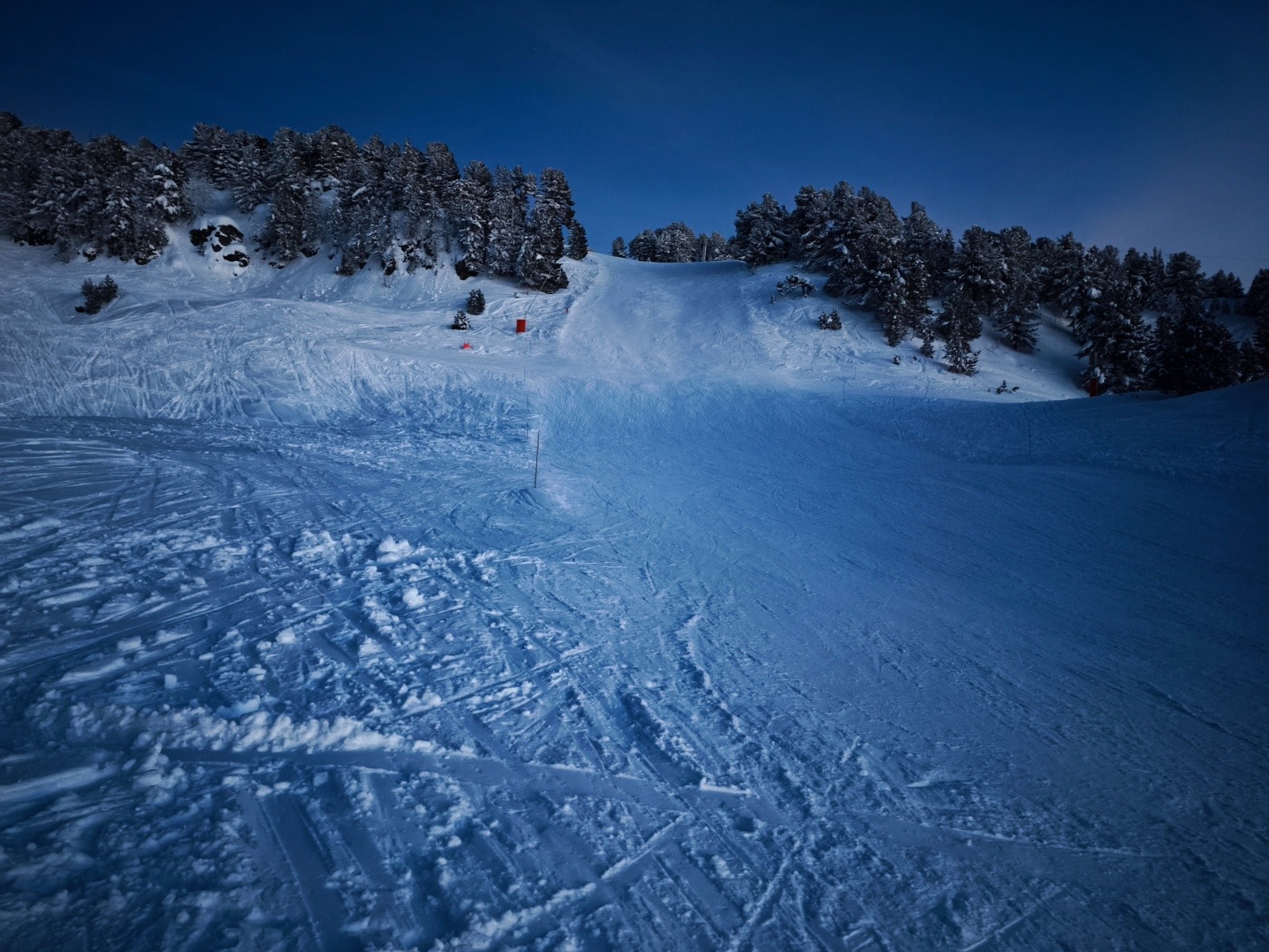 Conditions pour le ski : Correcte ( on va résumé à bonne car la quantité est là ), mais fond dur bien présent sur recoin, plus doux coté Roche Bé où les multiples dérapages des skieurs projettent la neige sur la piste, donc laissant un tapis bien agréable. Entre les pistes, c'est pas fameux, Croute épaisse bien portante, mais pas terrible à skier.