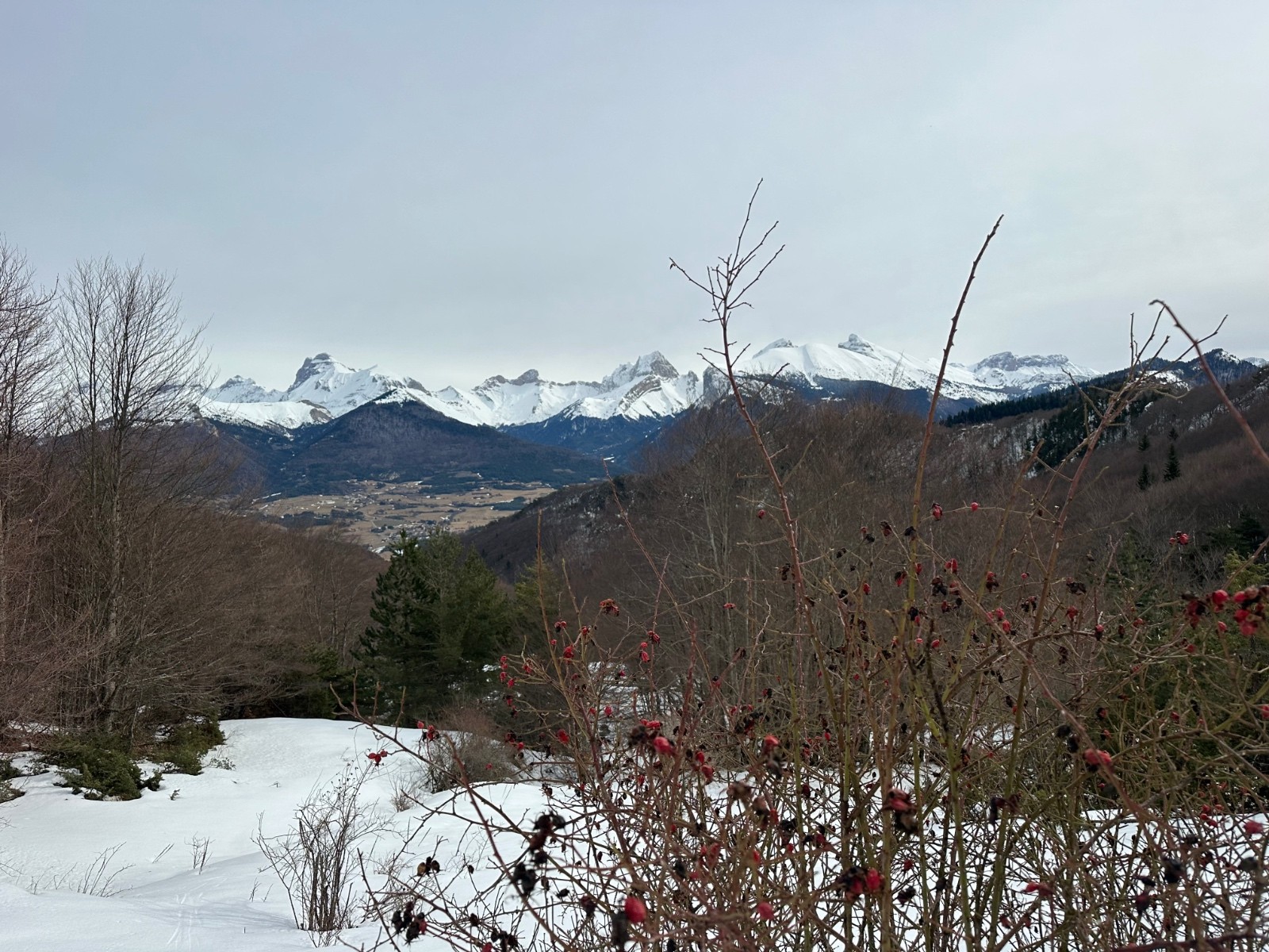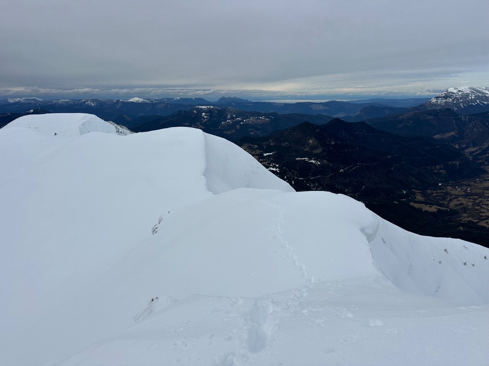 Itinéraire suivi : montée le long du ruisseau de l’étroit, puis des côtes, puis crête sud est, puis arête sud ouest. Nous avons déchaussé 20 m sous le sommet et fini à pied. Attention à la corniche ! La descente en cinq parties : 1- le haut ( jusqu’à 1770 m environ, excellent en neige dure couverte de quelques centimètres de poudreuse. Remarque : nous avons cherché l’exposition sud, en neige bien transformée. 2- Puis une croûte vraiment difficile à skier, agrémentée de vaguelettes jusqu’à 1630 m; 3- puis à nouveau neige dure sur la croupe. 4- Et enfin nous nous sommes régalés dans la forêt : une neige décaillée, parfaite ! 5- Pour conclure, le chemin enneigé jusqu’en bas, avec quelques cailloux et une ou deux interruptions…
