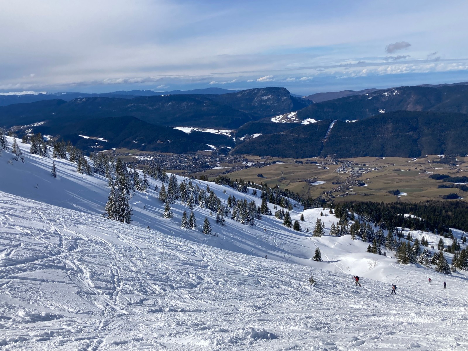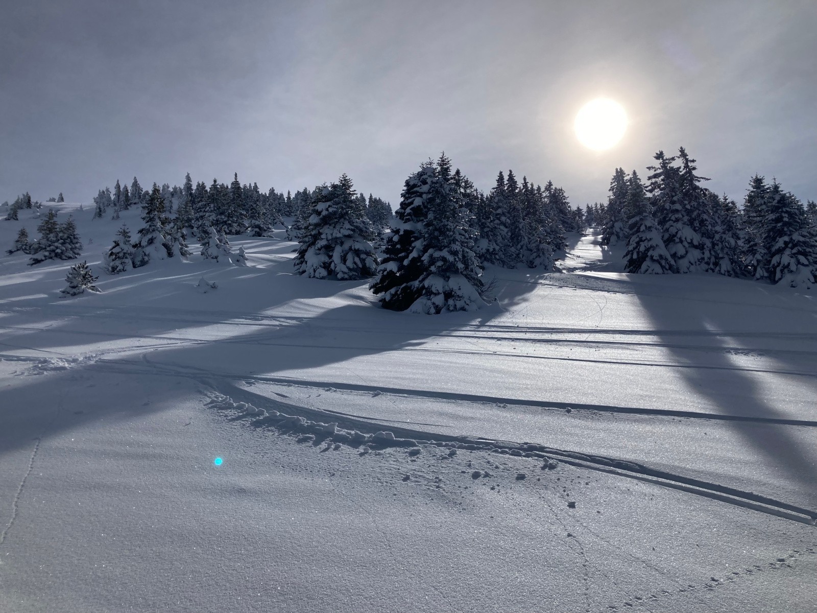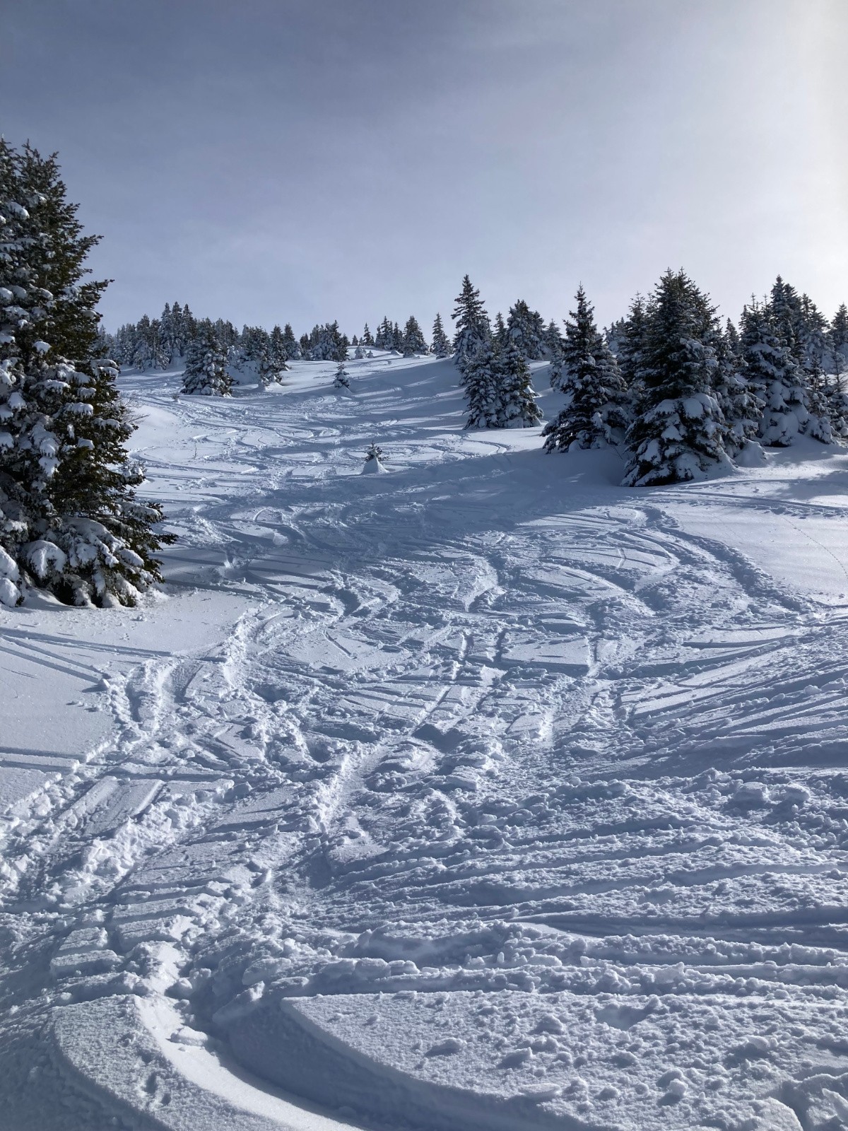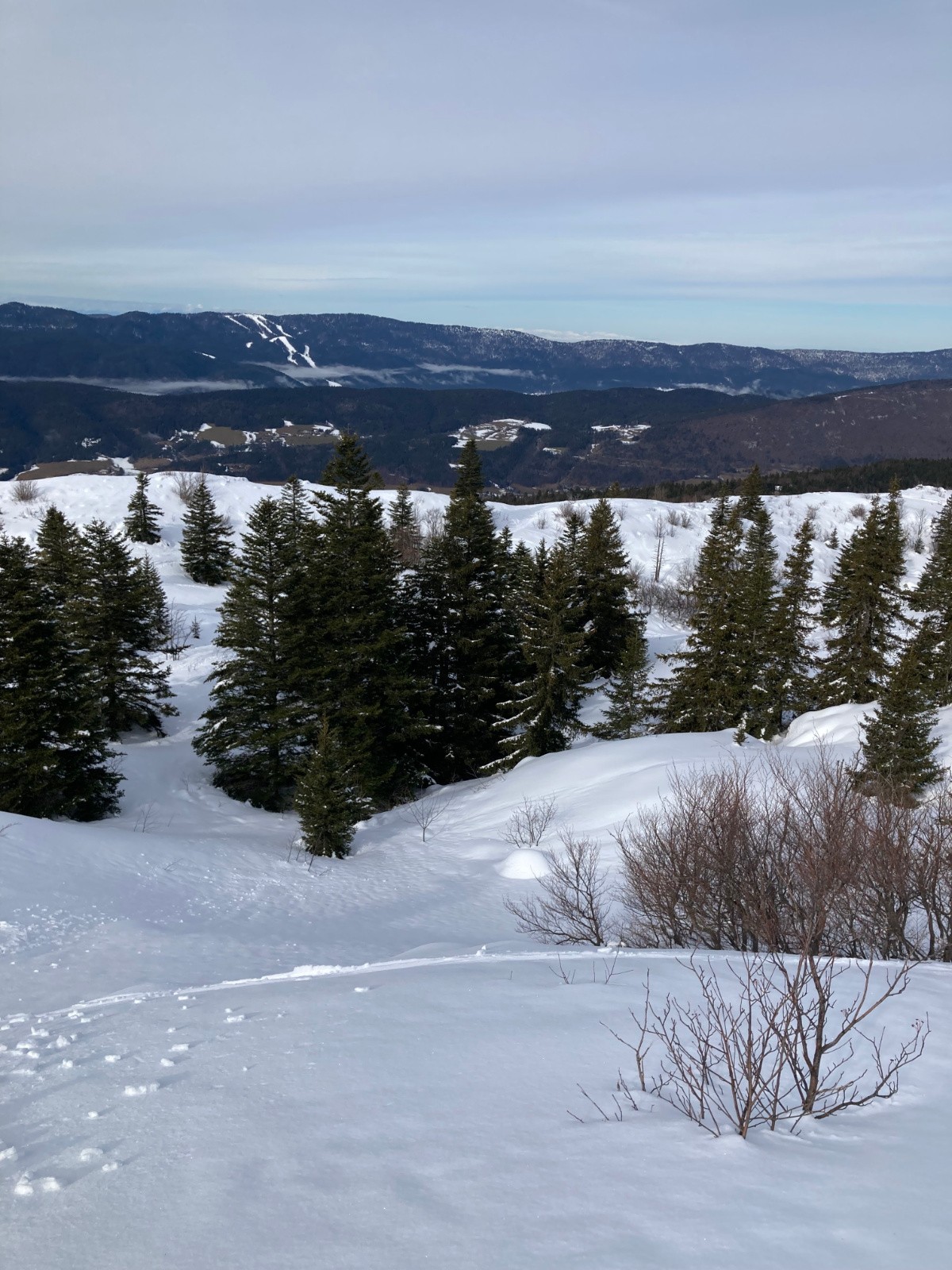Conditions pour le ski : Très bonnes au-dessus de 1600m ; neige poudreuse dense très agréable à skier, en particulier dans les expositions nord. Neige bien meilleure que prévu, et très peu croutée. Sentier dans la forêt en neige dure à la montée, descente de la forêt en neige bien revenue à 15h. Border final entre l'auberge et le parking en neige dure.