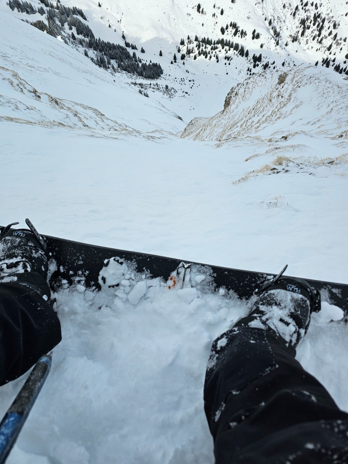 Je rentre en plein milieu du cône en effectuant un travers comme d'habitude pour tester la stabilité, pas besoin d'appuyer beaucoup toute la neige sans cohésion part d'un coup ! Il reste quand même la neige tassée dessous sauf de la croûte en rive droite au rétrécissement avant la traversée