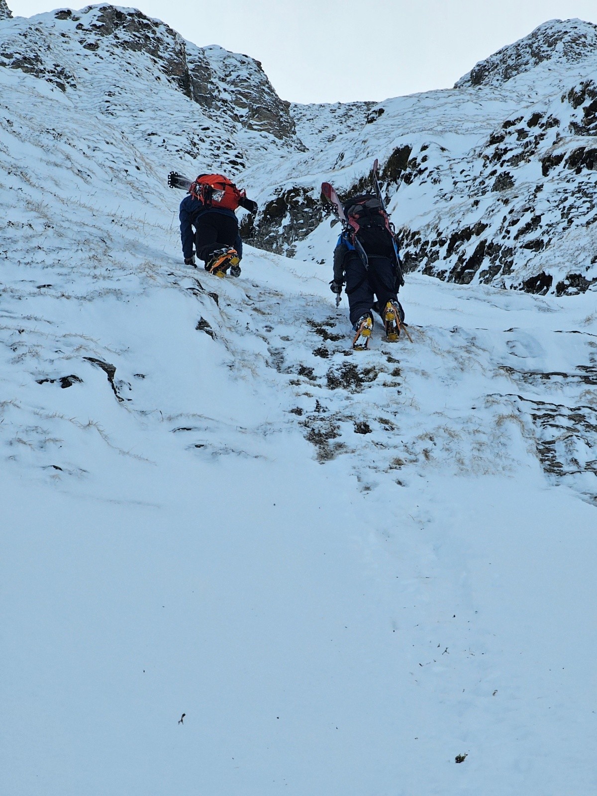 Arrêt au dessus du ressaut pour le désescalader en crampons , je voulais le sauter mais la purge a bien fait partir la poudreuse en dessous et il est trop long et pas assez vertical , surtout sans élan