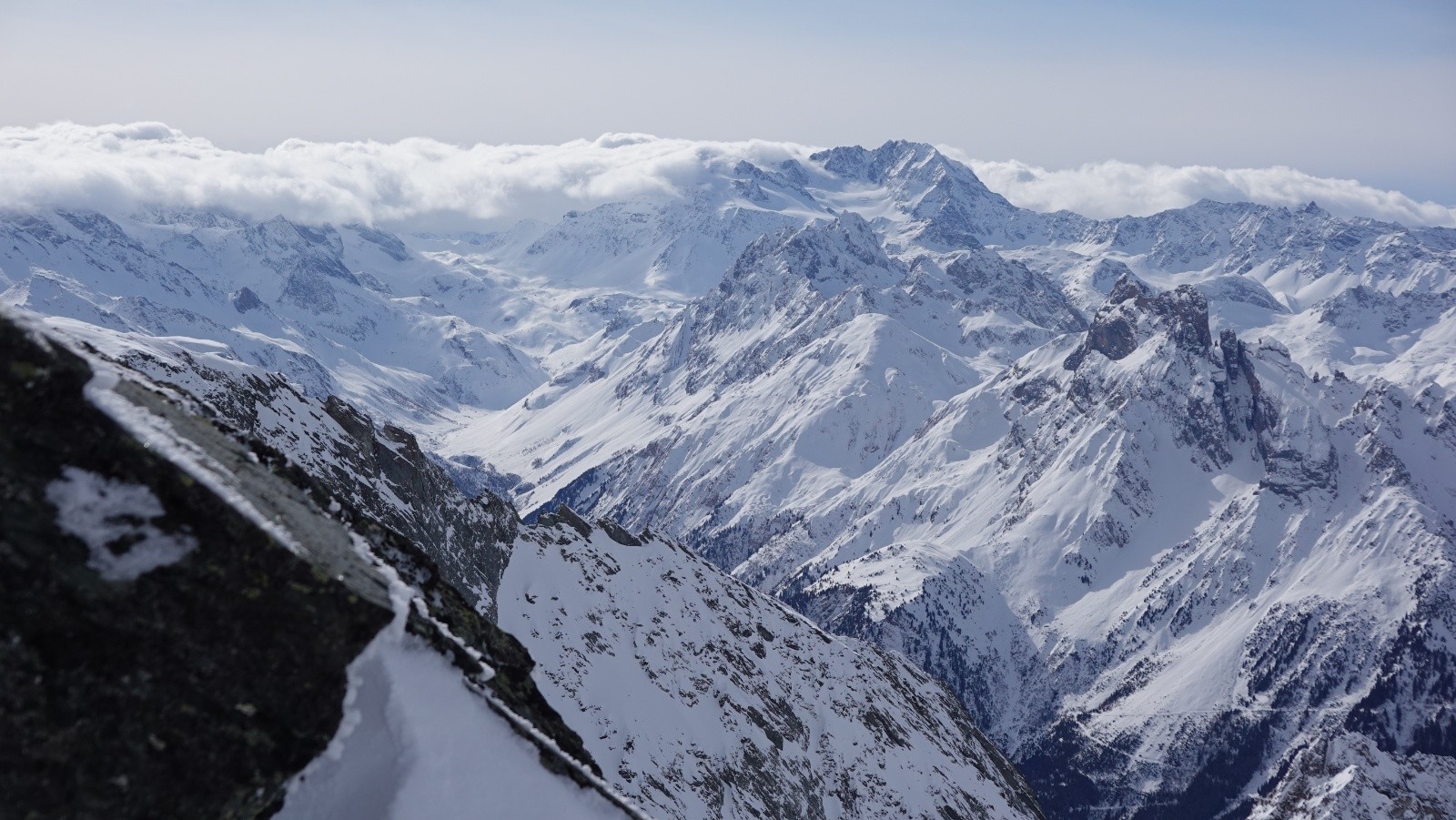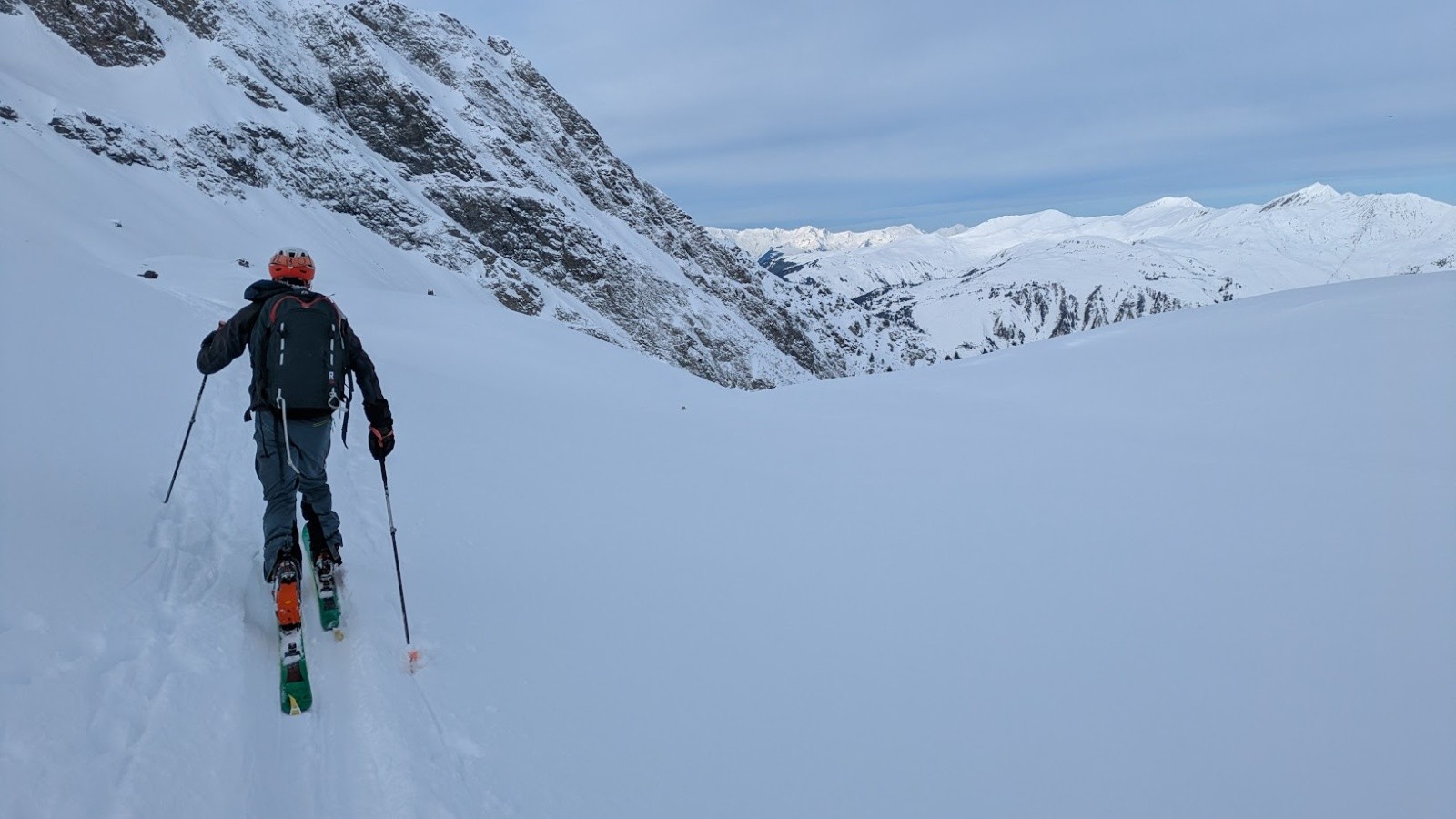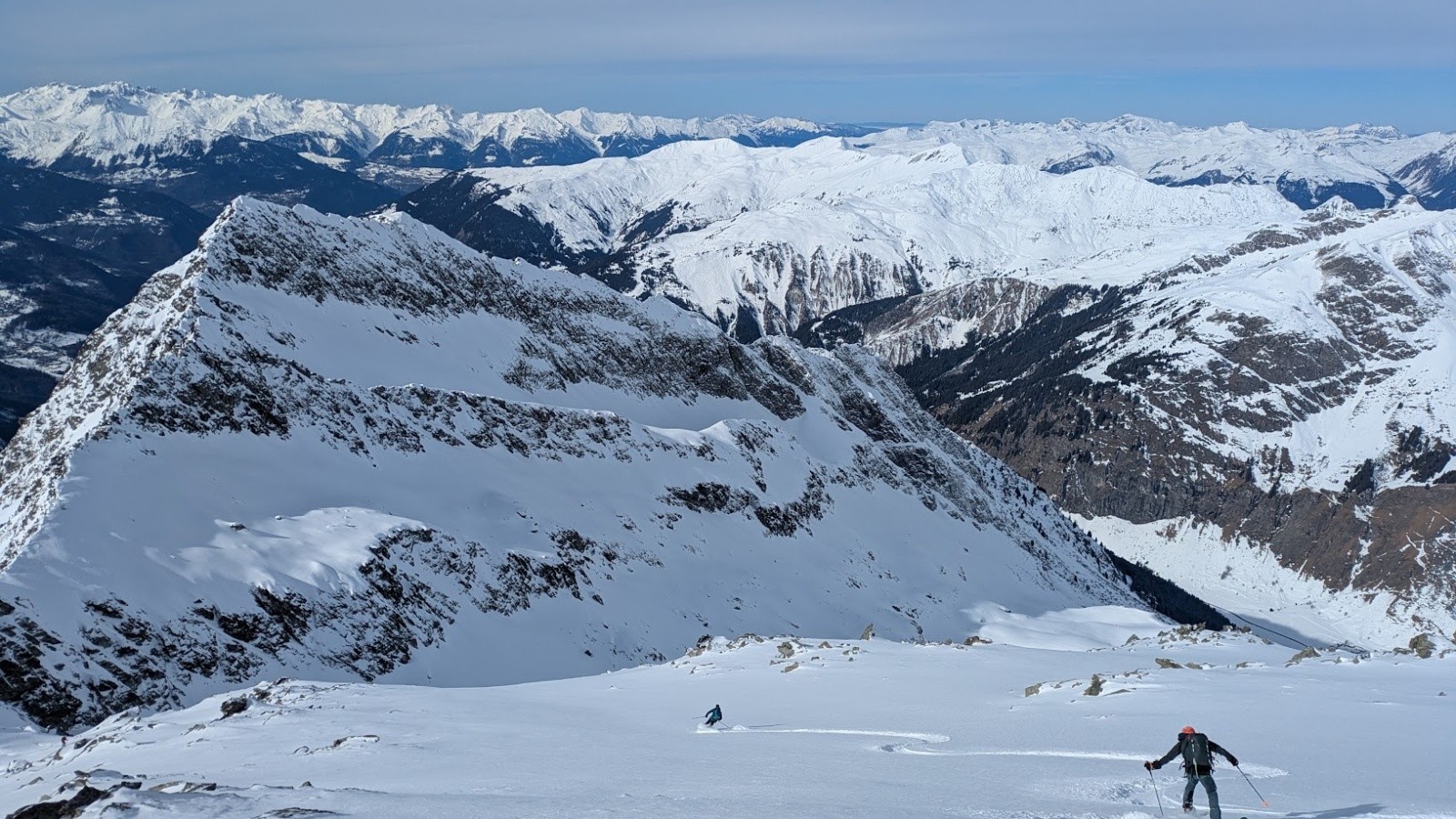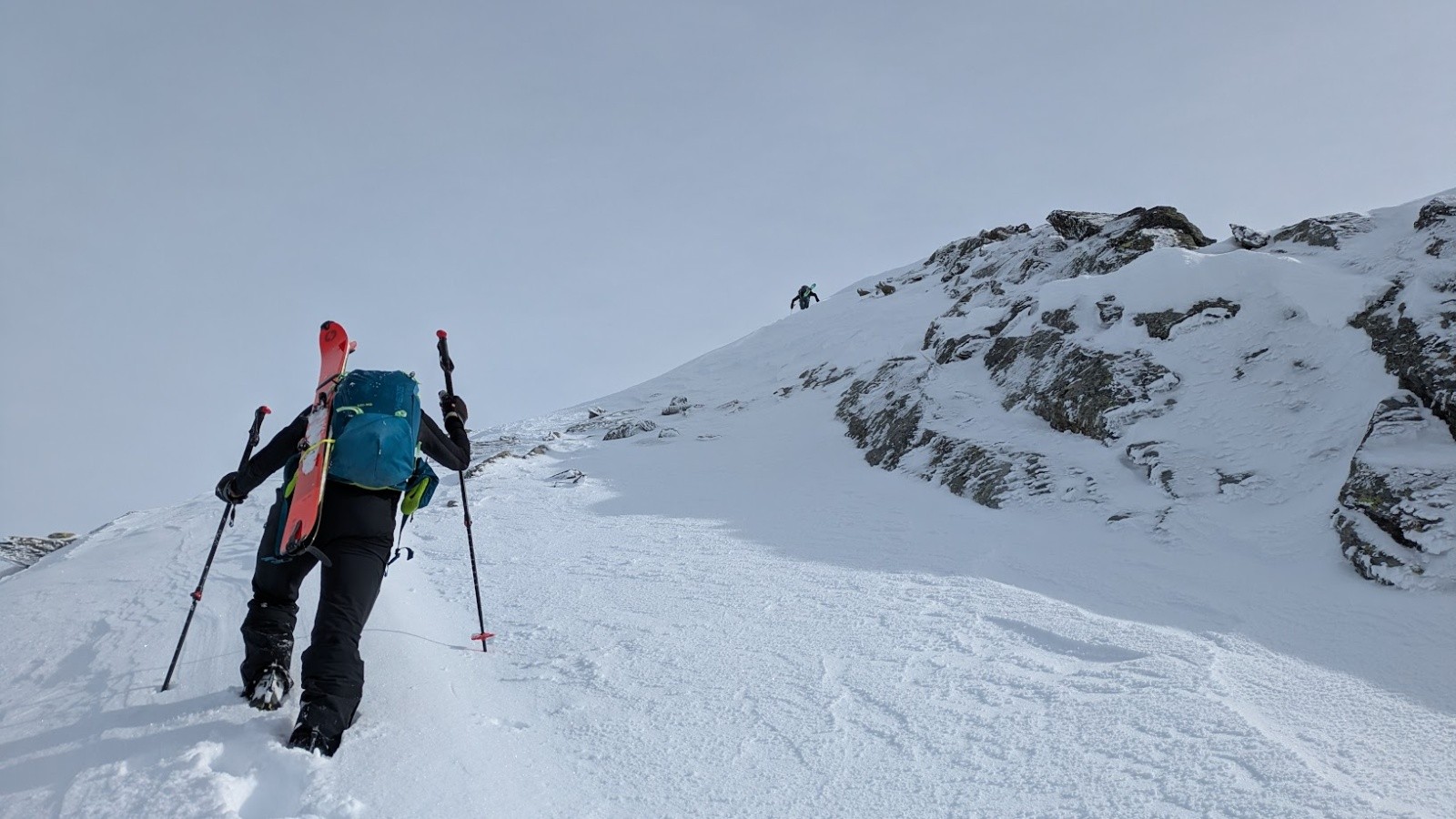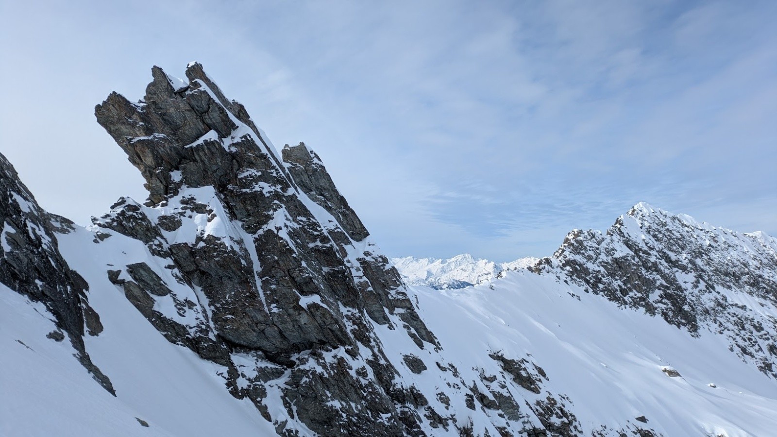 Conditions nivo et activité avalancheuse : Environ 20 cm de poudre sur un fond dur au début absent puis peu présent puis bien régulier à partir de la partie raide (plus on monte plus le fond dure semble présent, sauf la pente sommitale ou il était parfois plus variable). On a fait de régulier sondages au bâton et creusé plusieurs fois à la main entre 2650 et 2800 : Poudre sur fond dure d'épaisseur variable entre 5 et 10 cm le tout sur la couche fragile (10 à 20 cm). On s'est senti en "sécurité" sur cette couche dure ce qui peut-être/probablement/je ne sais pas ... une connerie ...