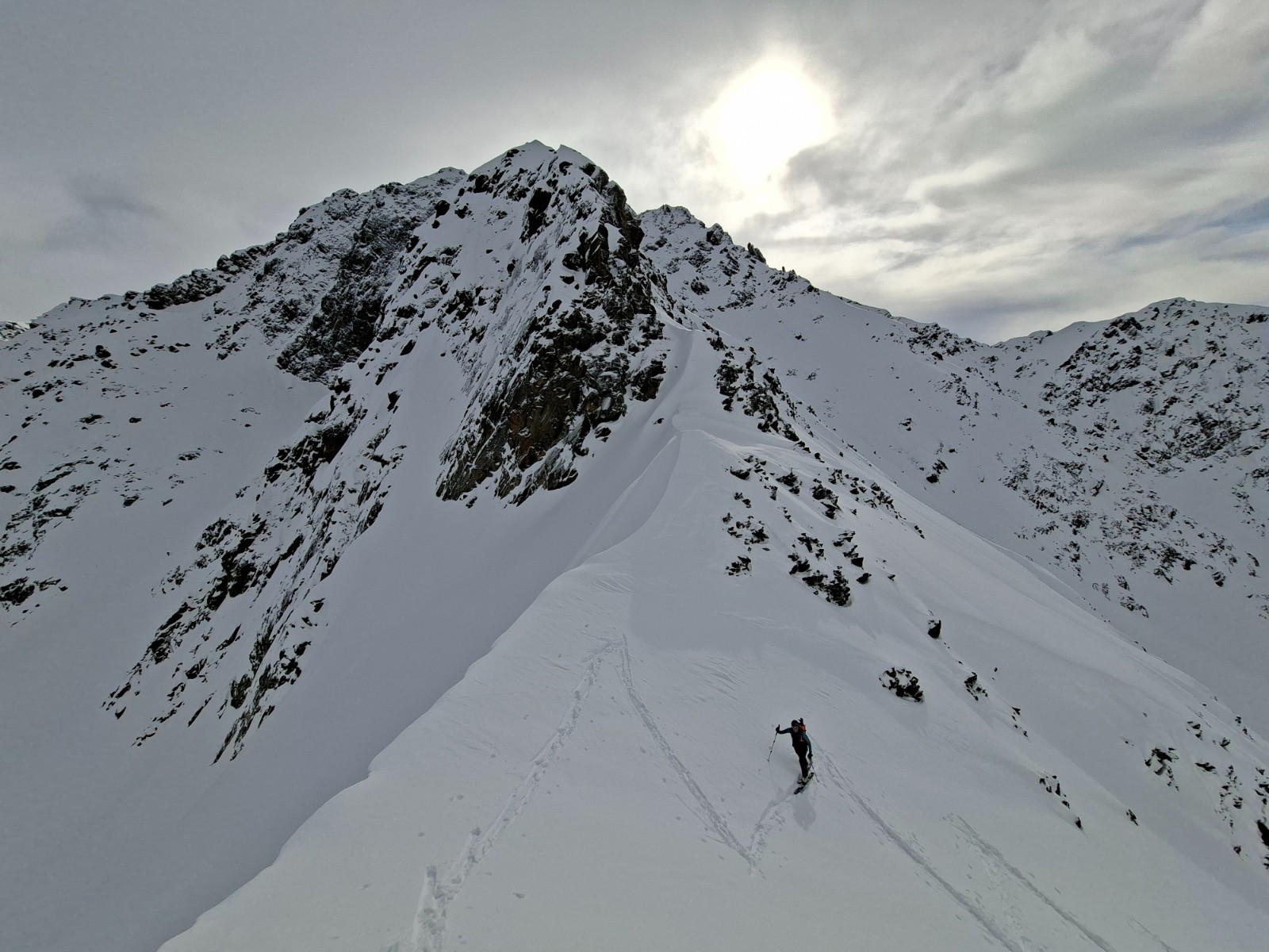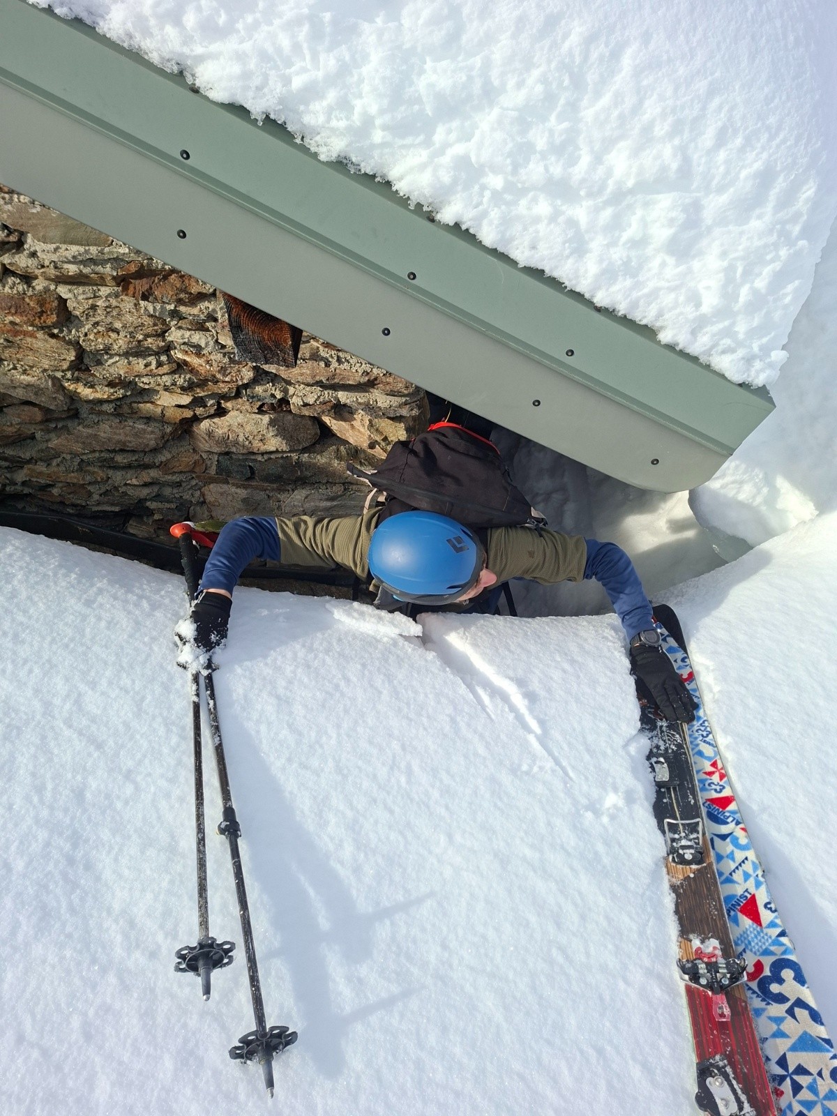 Conditions nivo et activité avalancheuse : une petite purge de rocher au soleil sous le col qui a bousculer un cafiste lors de notre seconde montée.