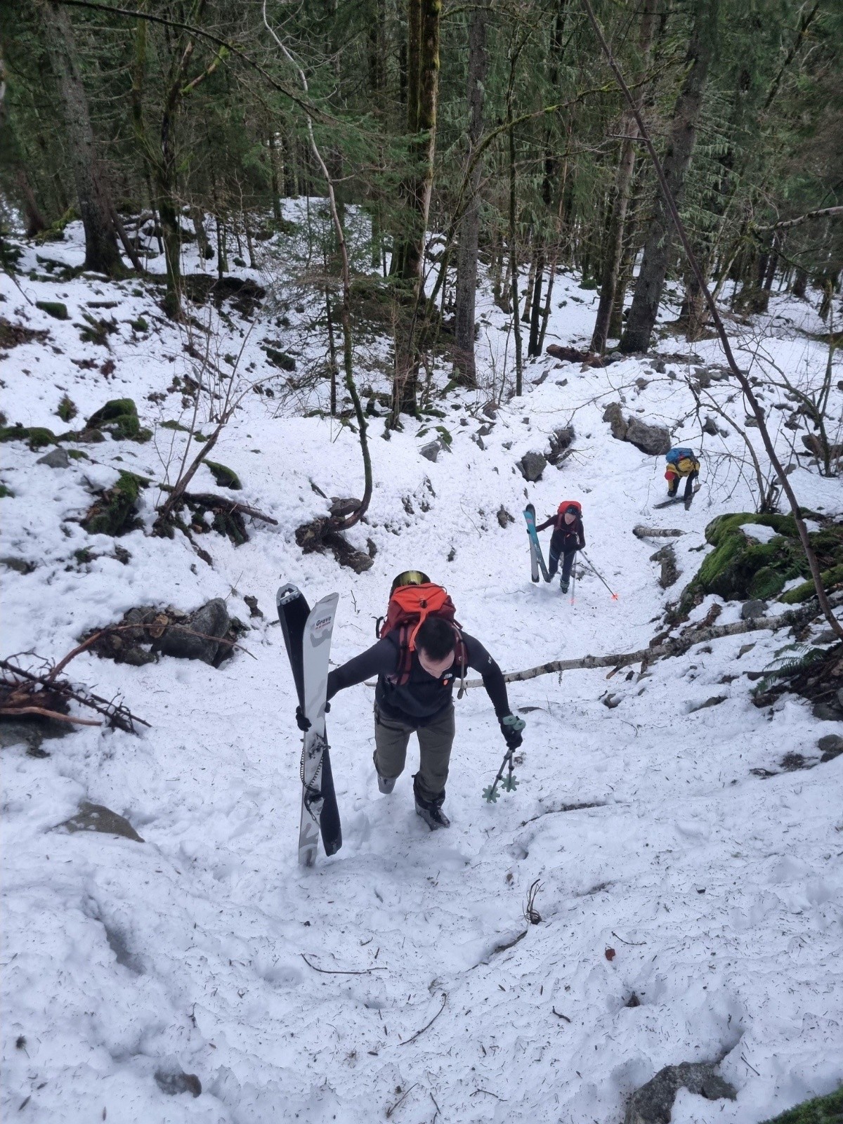 Altitude de chaussage/déchaussage : première tentative de chaussage juste au-dessus du parking, mais nous avons rapidement déchanté dans la forêt. Portage ensuite jusqu'à 1250m environ. Grosses plaques de verglas dans la forêt, des cailloux, un beau parcours de cross !