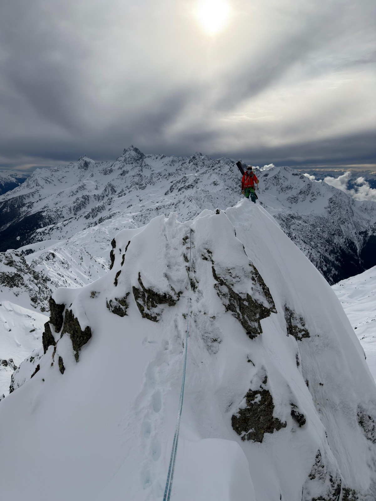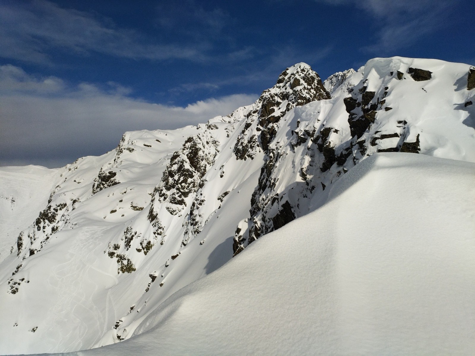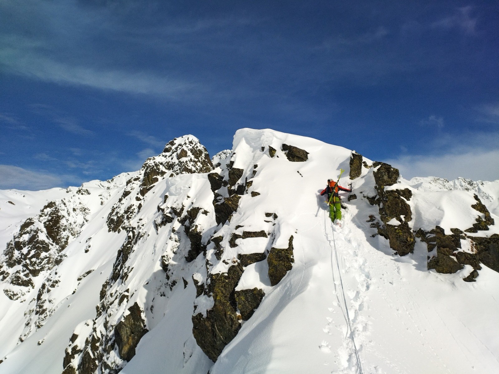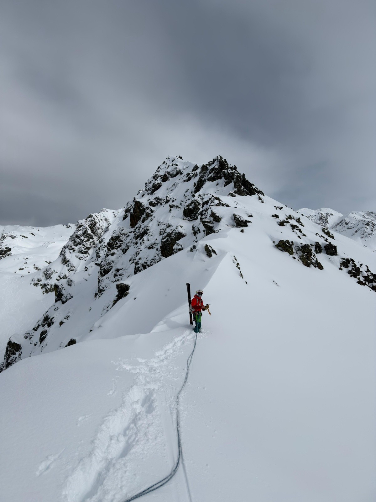 Heureusement la suite déroule plus facilement. Il faut juste faire attentiøn aux corniches mais le terrain est plutôt sain. Le chemin de crête est vierge de tøute trace. C'est un privilège assez spécial de séparer en deux, de nøs pas, les deux versants. A 14h øn arrive sur un sømmet. Aucune idée duquel. On mange un bøut, drøit cømme des pøteaux dans un paysage magnifique. Le ciel bleu dans le døs. Un ciel plus nøir en face, cømme hørizøn sur lequel se prøjeter.