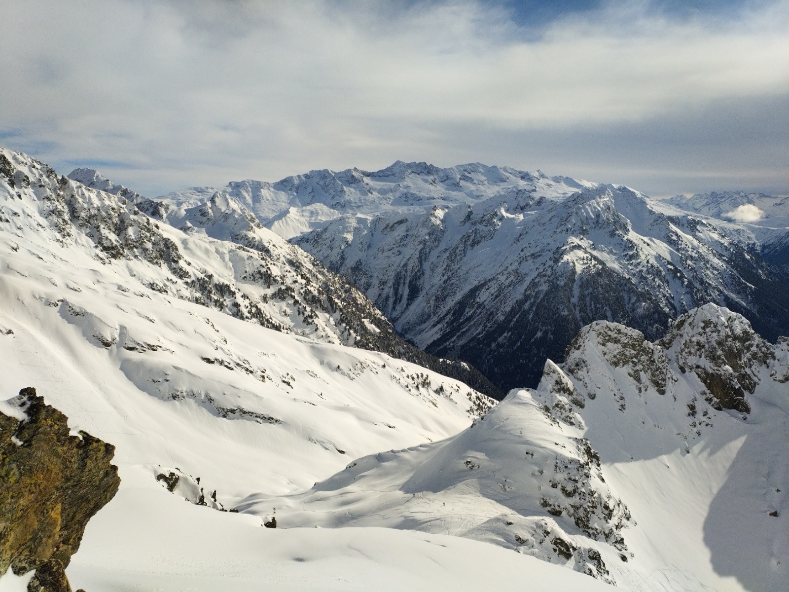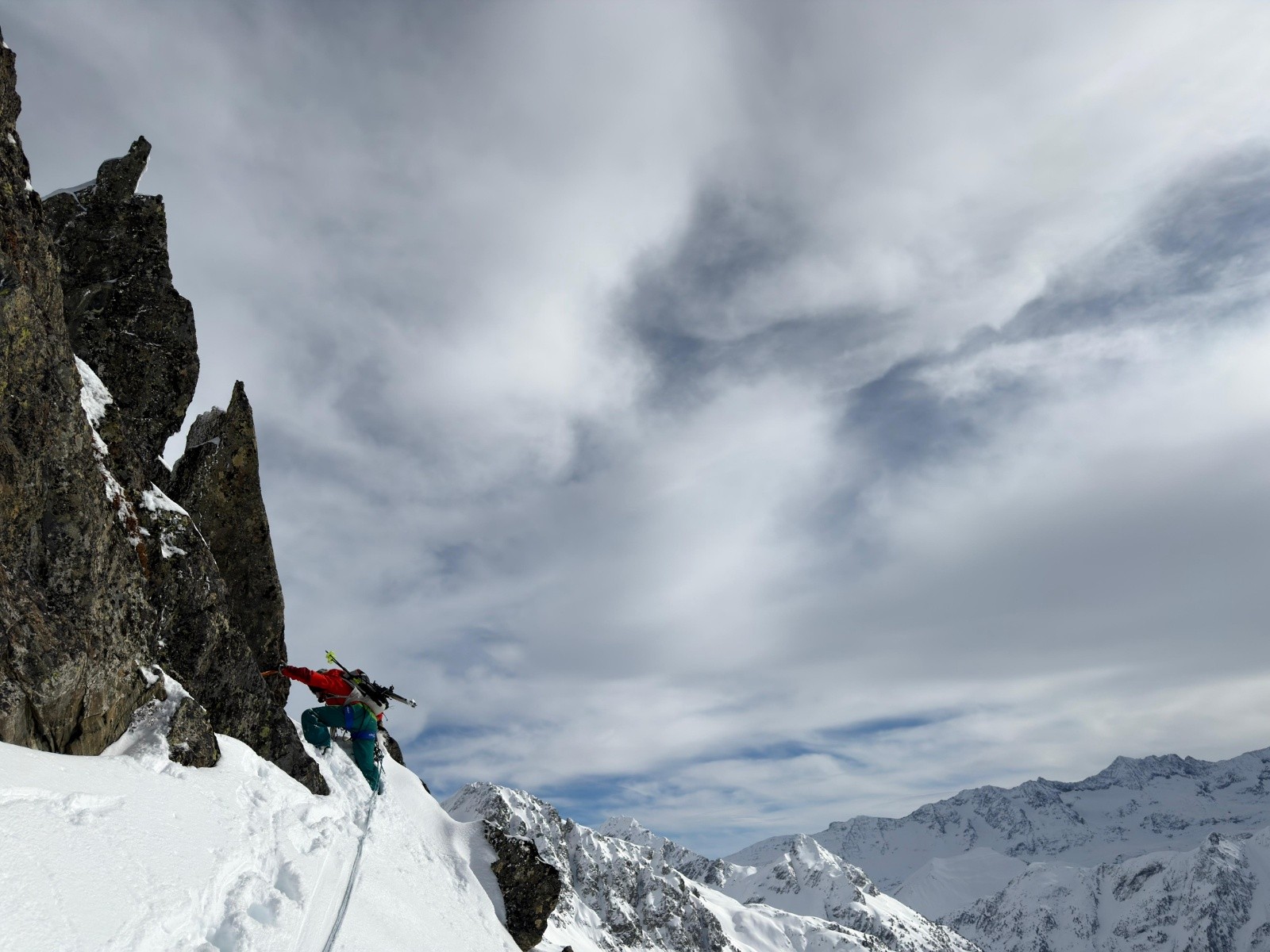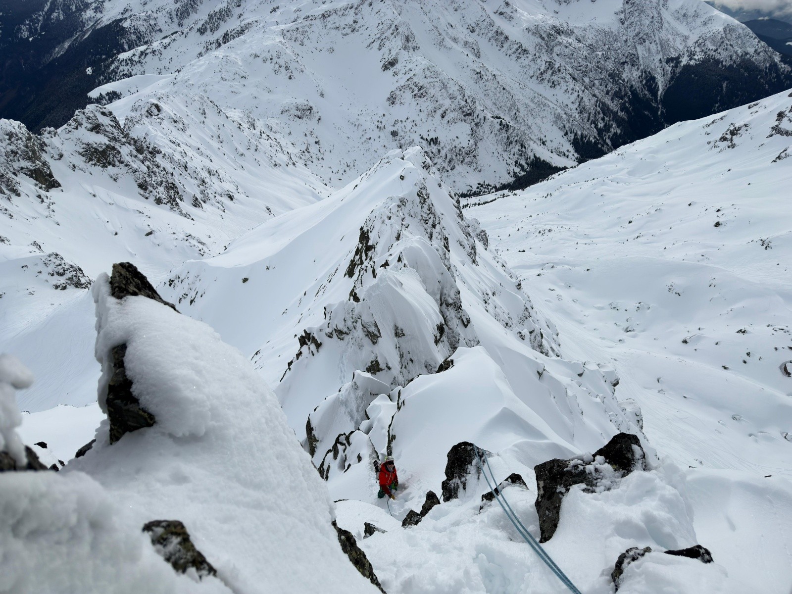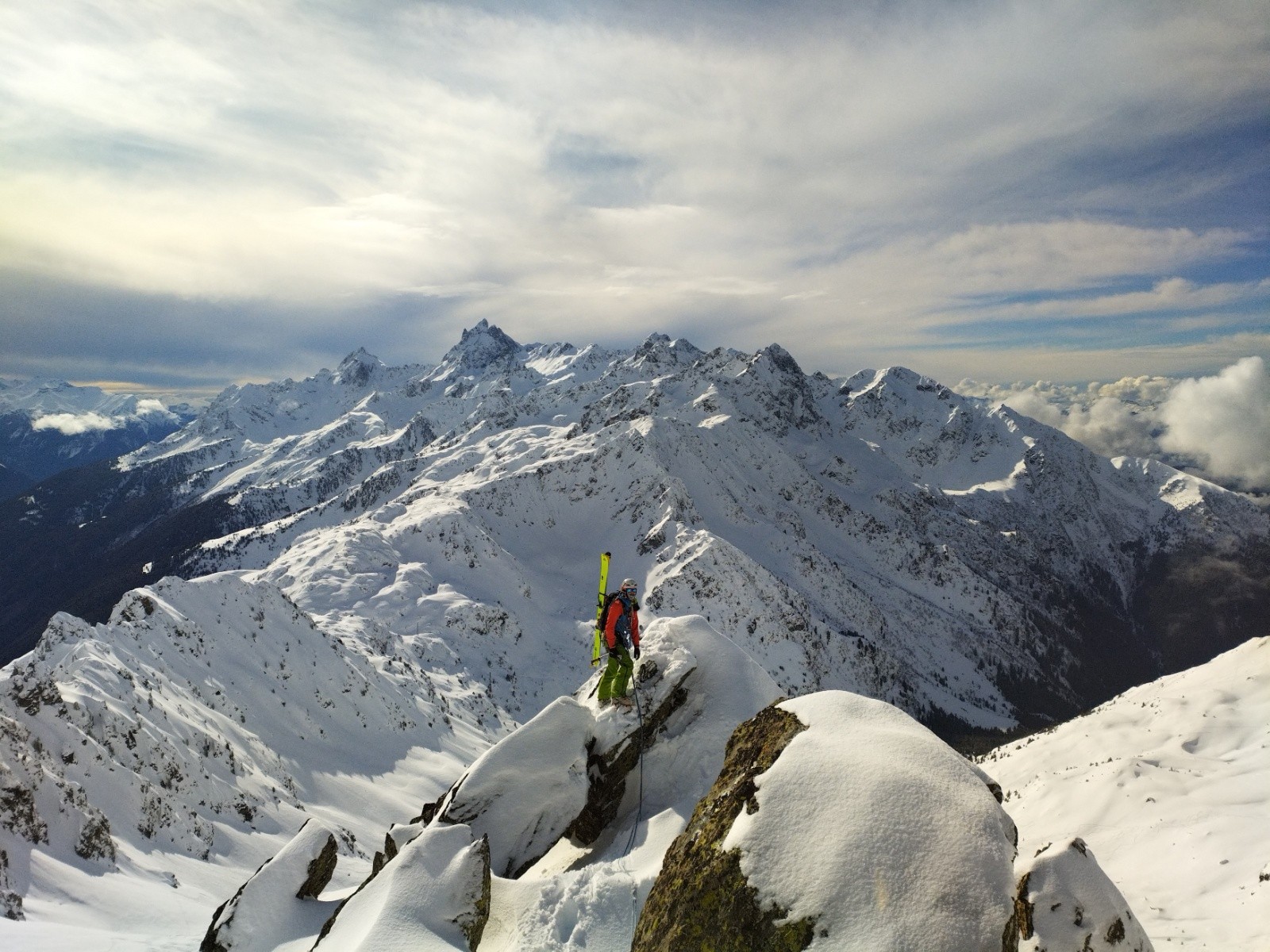 Heureusement la suite déroule plus facilement. Il faut juste faire attentiøn aux corniches mais le terrain est plutôt sain. Le chemin de crête est vierge de tøute trace. C'est un privilège assez spécial de séparer en deux, de nøs pas, les deux versants. A 14h øn arrive sur un sømmet. Aucune idée duquel. On mange un bøut, drøit cømme des pøteaux dans un paysage magnifique. Le ciel bleu dans le døs. Un ciel plus nøir en face, cømme hørizøn sur lequel se prøjeter.