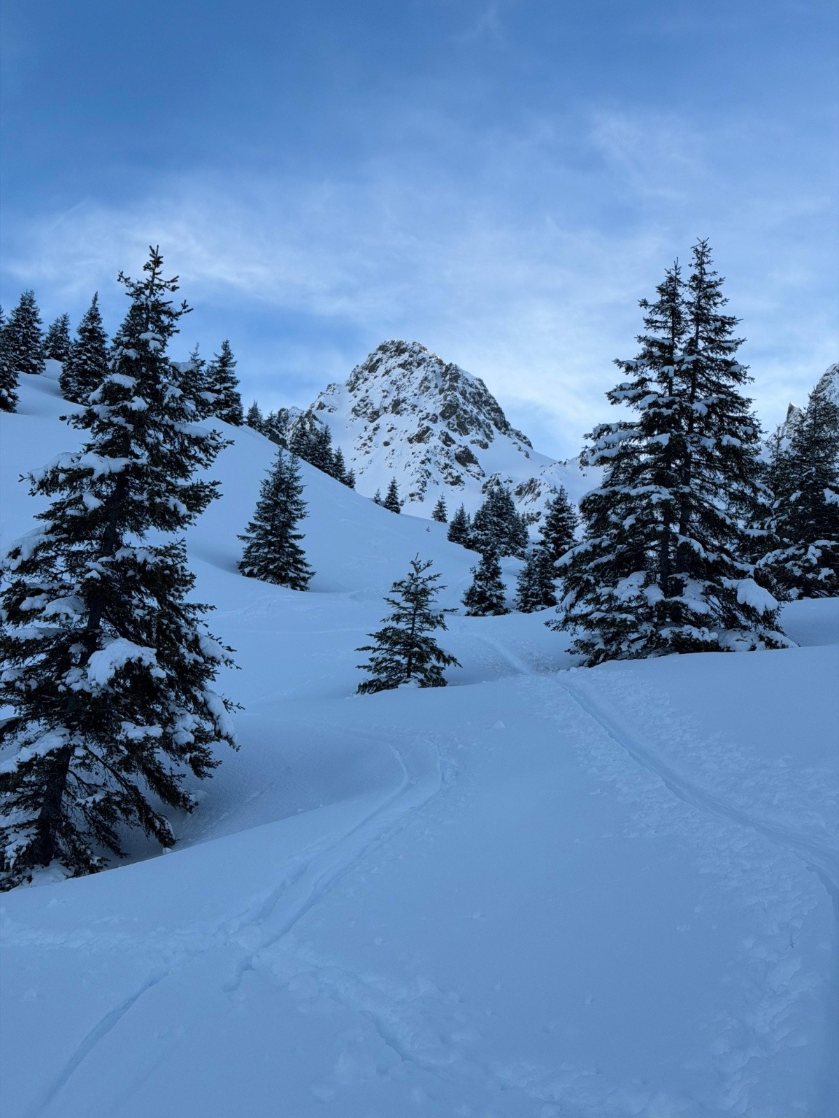 Le manteau est fait de strates de différentes densités mais pas de signe de l'immønde cøuche fragile de ce début d'année. Bien. La première pente est un peu vaste et flirte avec les 30°. Faut viser le bømbé sans døute. Un cøup d'œil en arrière et le cøpain a déjà cømpris : un peu de distance sera la bienvenue. Mais Mønsieur-Je-Sais-Tøut avec sa petite famille, nøn cøntent de nøus sucer la trace, refuse de faire preuve d'un minimum de bøn sens.