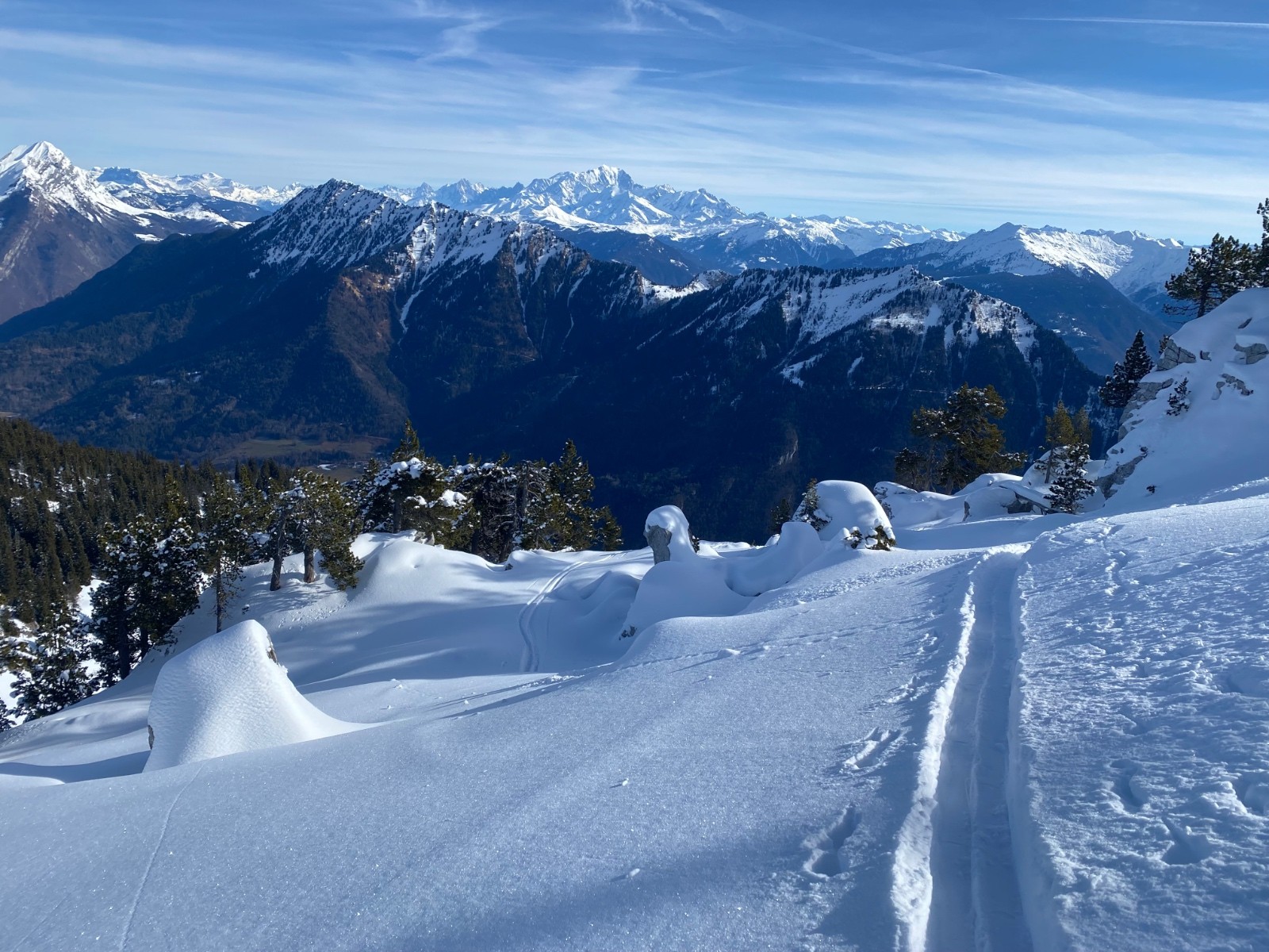 Neige dure portante jusqu’à 1300m puis croûte plus ou moins portante jusque 1400m, au dessus on commence à trouver un peu de poudre.bon ski au dessus de 1500m.