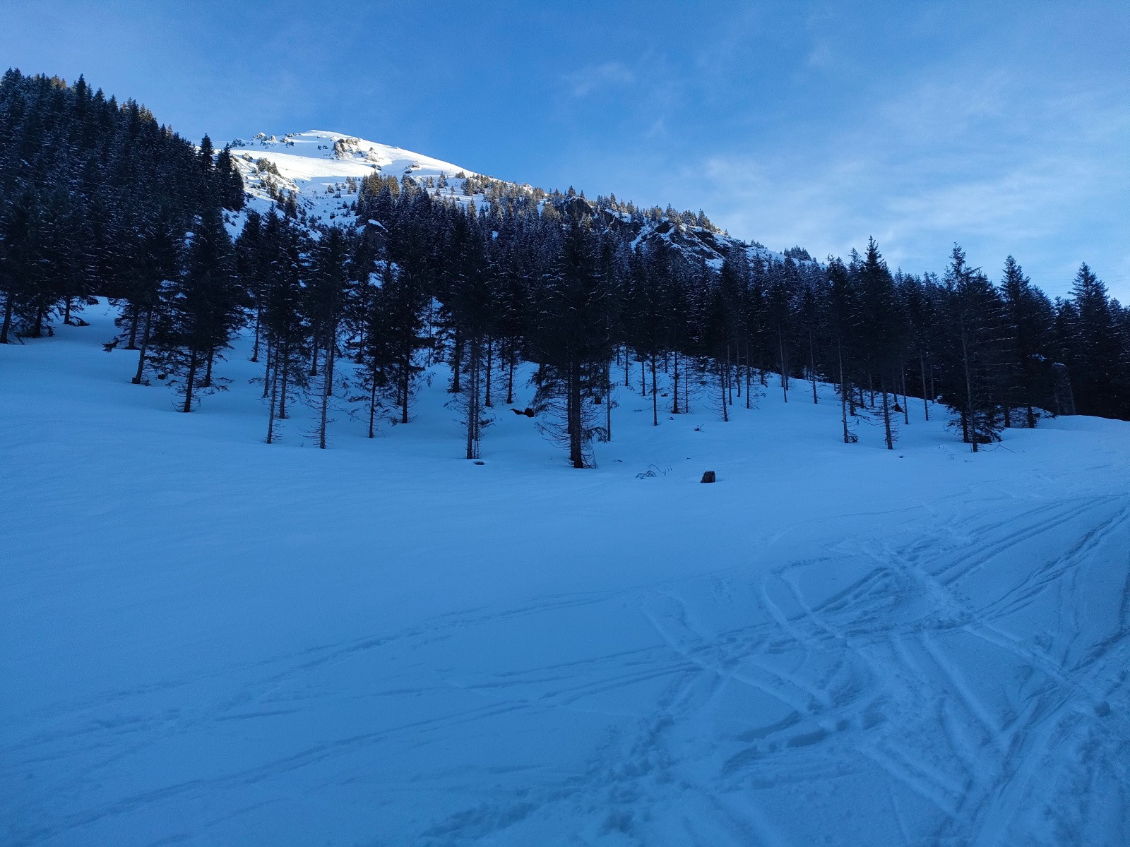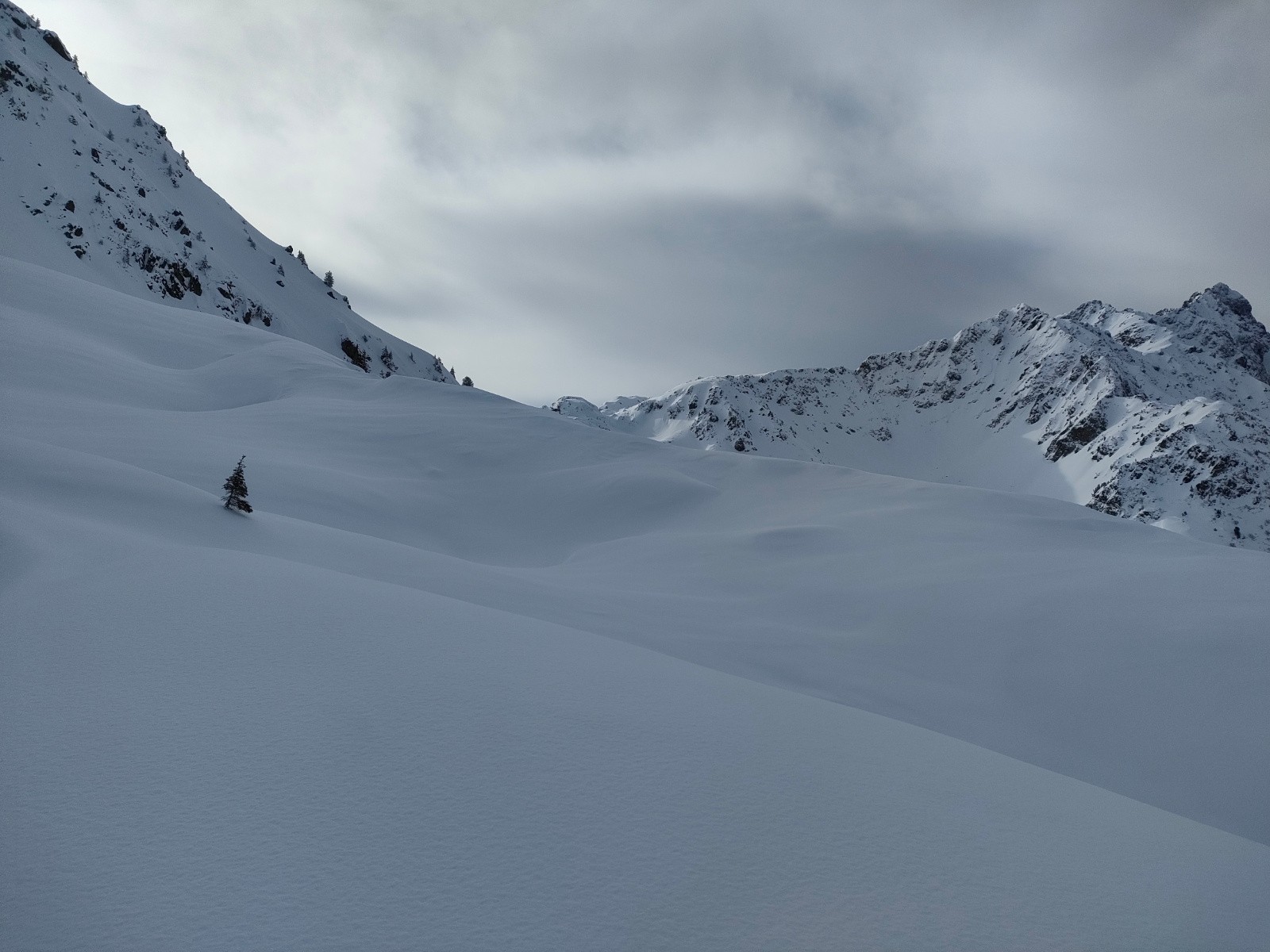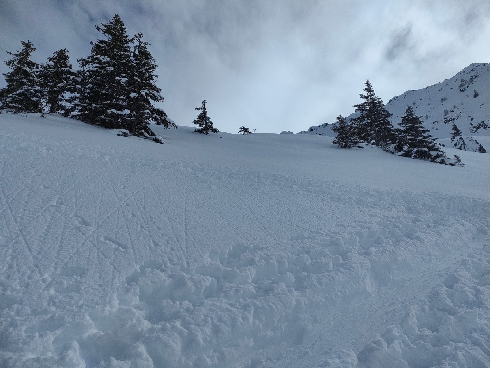 Et on descend à 14h, on a raté le créneau poudreuse, la neige est devenue humide et des petites coulées parsèment le trajet qui commence raide.