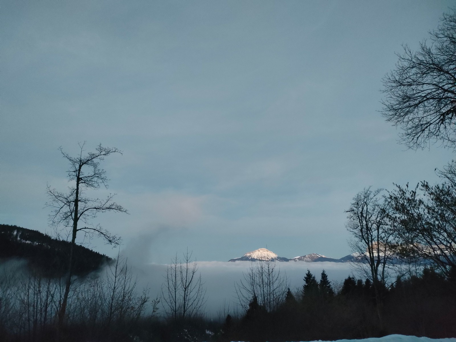 L'ambiance est très bonne, on se traîne agréablement comme de dignes contemplatifs et on prend des photos par-ci par là. La neige est praticable tant que l'on reste sur la route, dans les sentiers forestiers indiqués par les panneaux (qu'il faut ignorer) c'est horrible, neige blanche, rare et cailloux noirs de partout... On dirait le drapeau breton. Après avoir chuté sur de la glace comme un cheval qui rate une haie, j'ordonne une retraite stratégique sur la route.