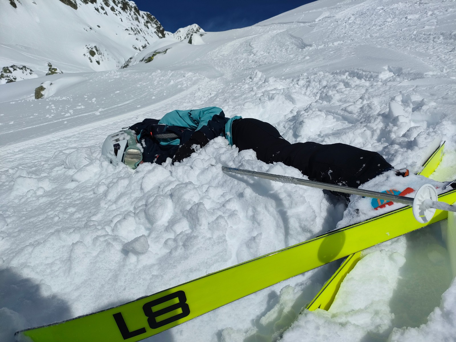 Après 3 ou 4 PAF de plus elle n'en peut plus, elle a l'impression de ne plus savoir skier et d'être revenue au niveau piou-piou. Mais à force de persévérance on avance, mais c'est dur pour elle. Une énième fois elle s'encastre dans la montagne et ne bouge plus du tout. Aïe !
