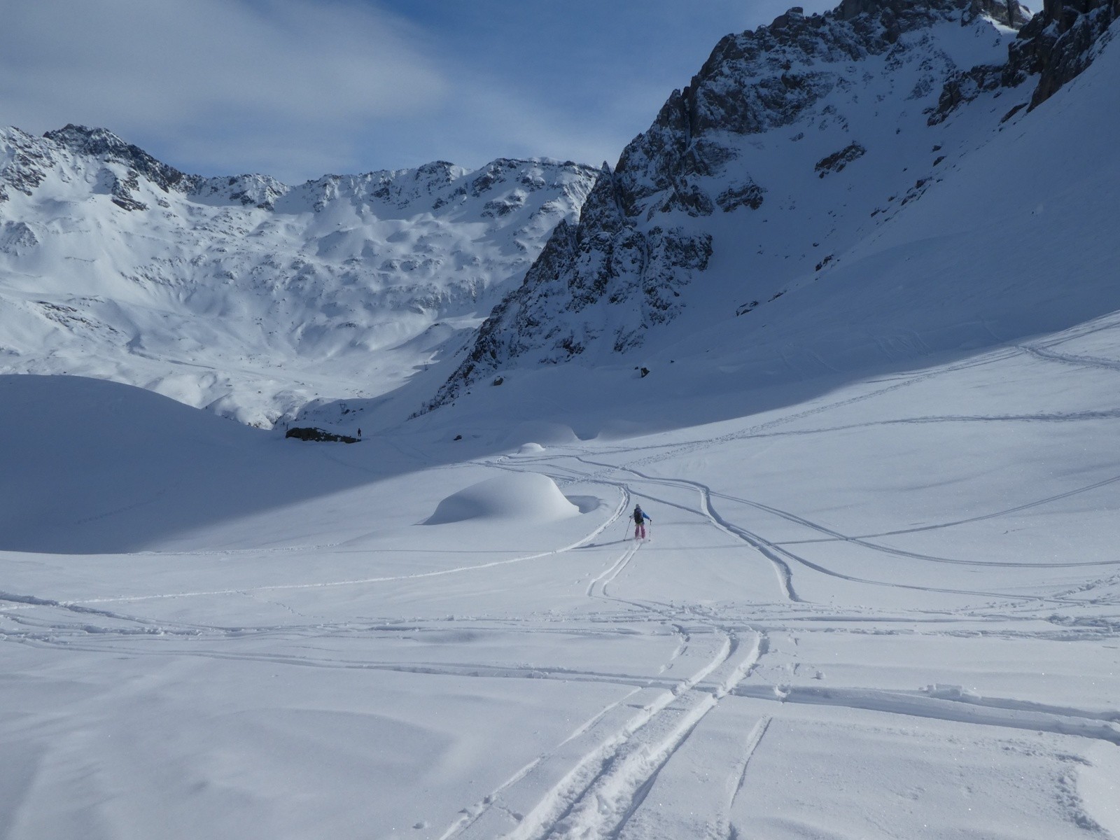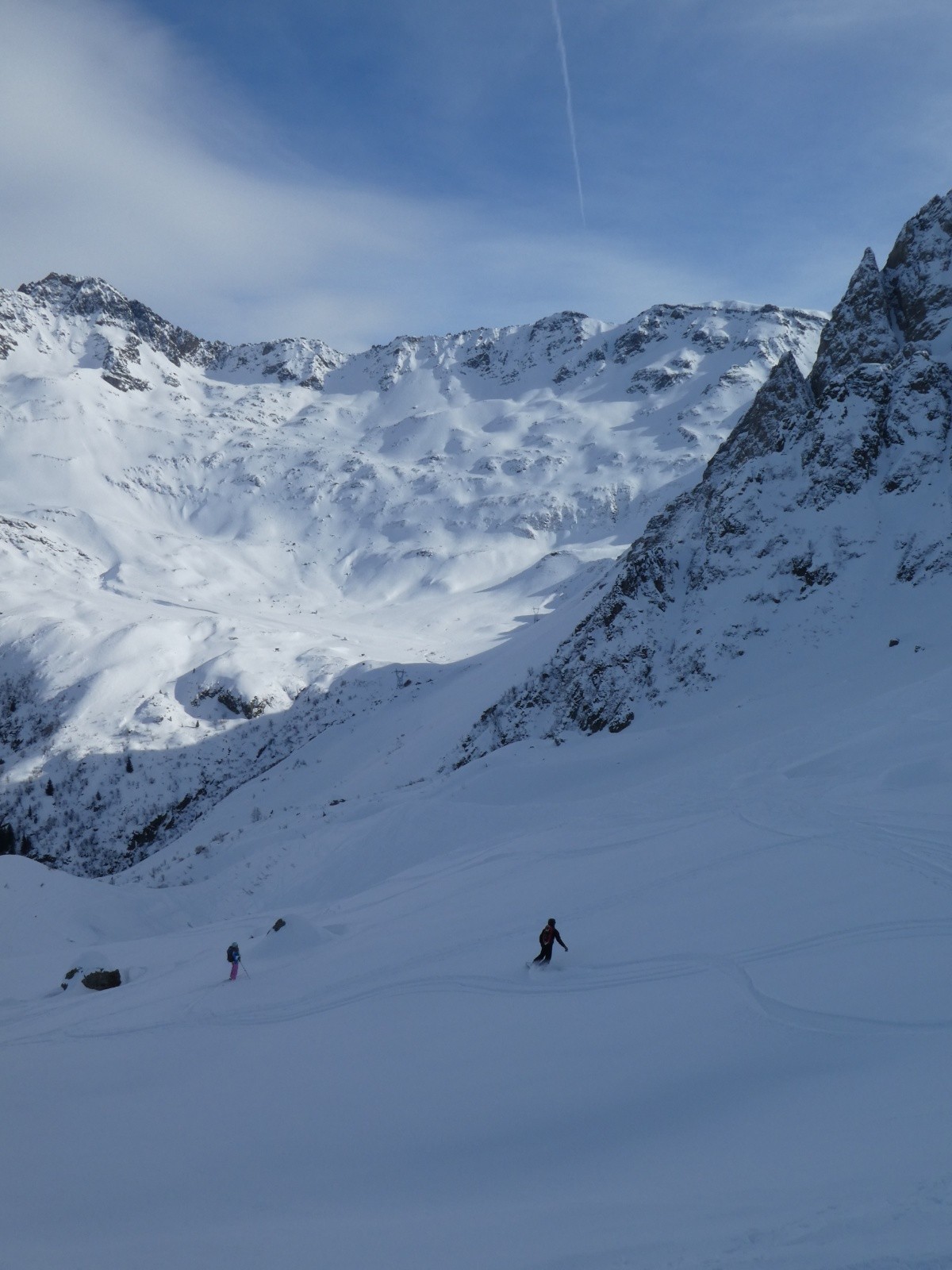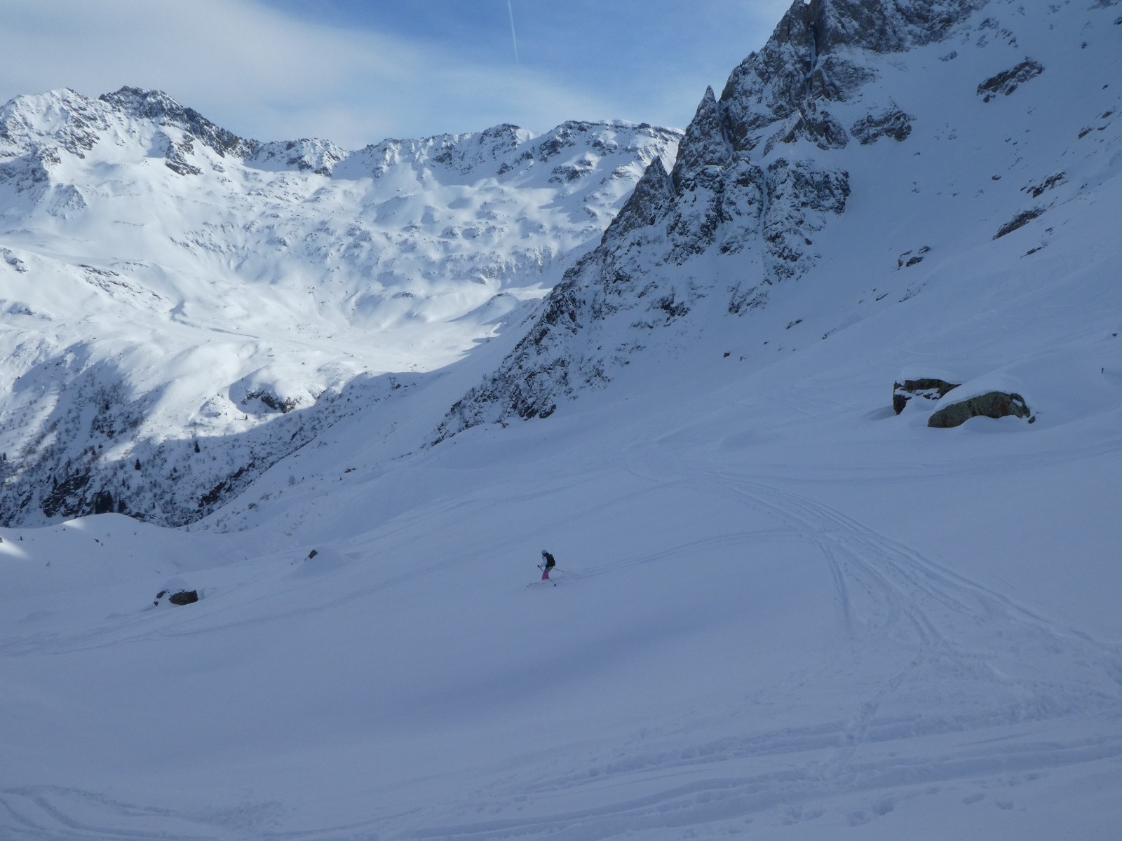 Conditions pour le ski : 15-20cm de poudre trafolée dans les pentes abritées du soleil. En cours de transfo ailleurs. Voie romaine en neige dure en haut puis glace en bas (sous le pont romain et surtout la pente du bas.