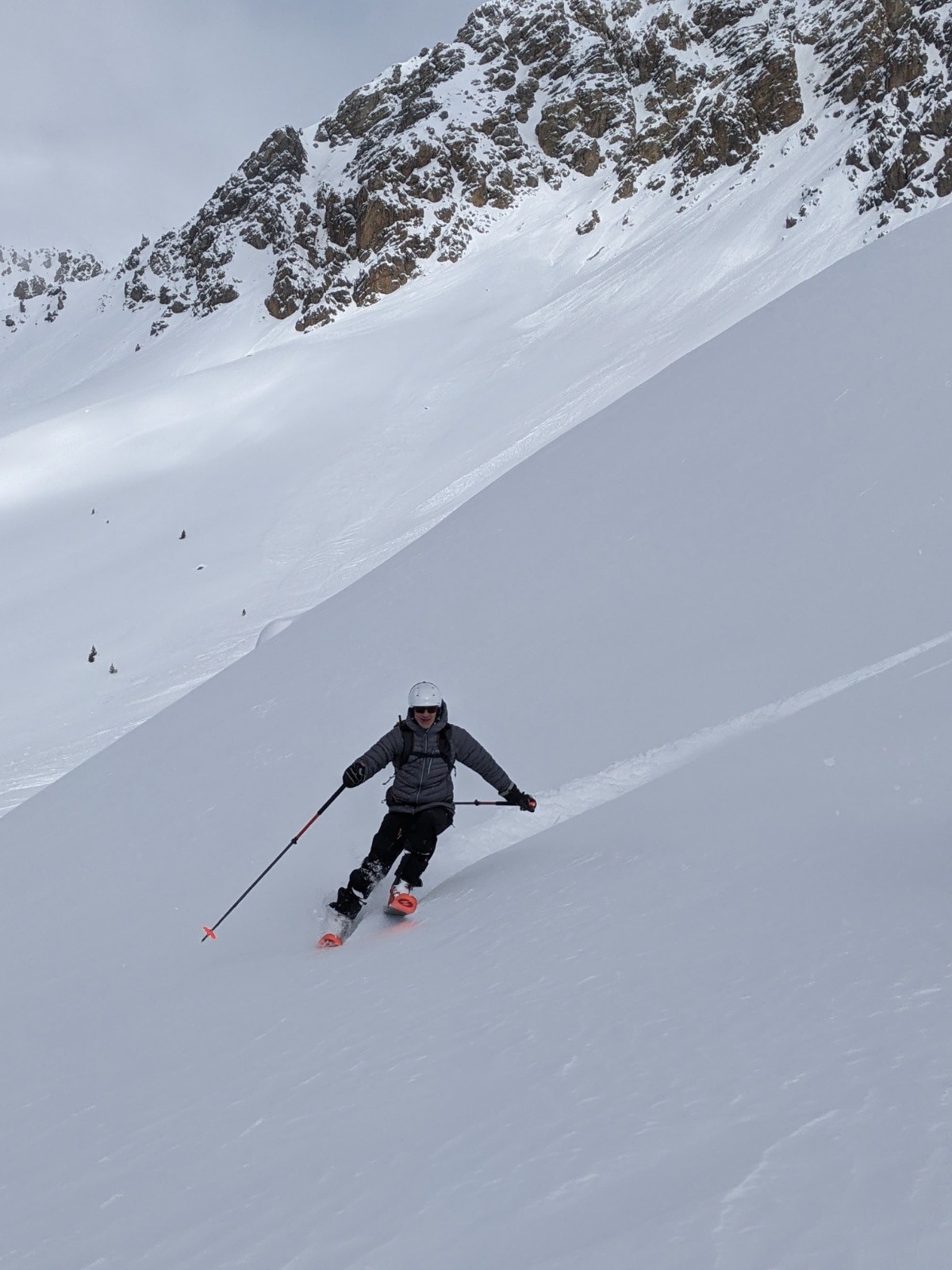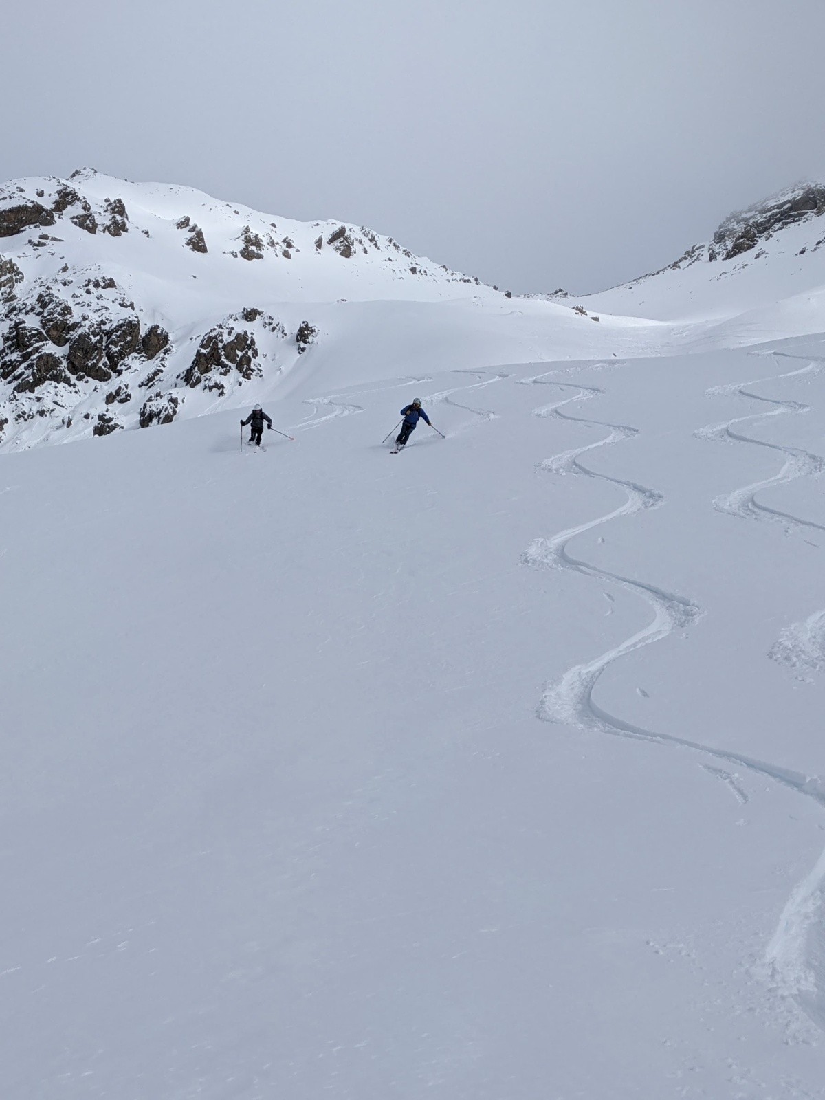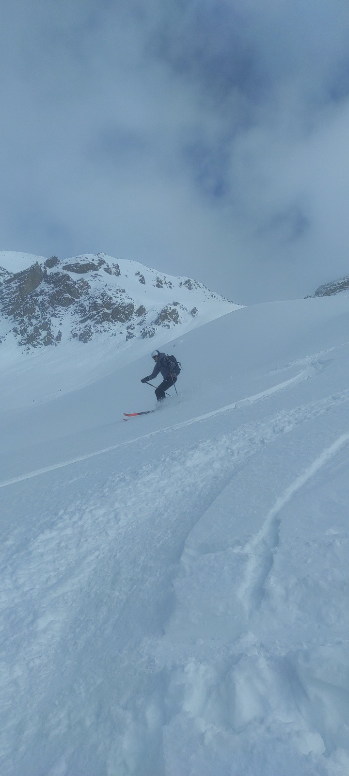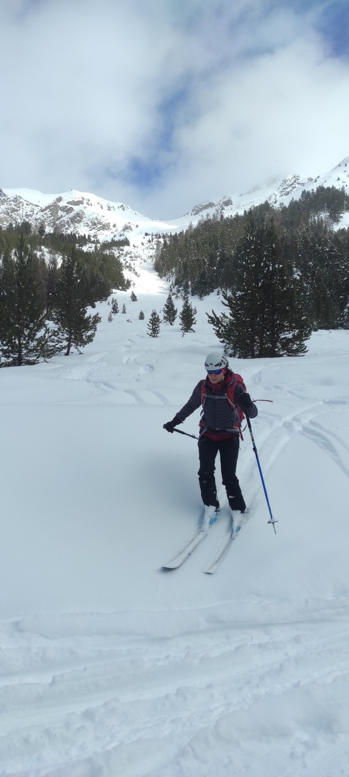 La météo ne s'était pas trompée, après les petites chutes de neige du matin, les éclaircies gagnaient du terrain, justifiant ainsi le choix de notre itinéraire.La trace était belle, le ciel clair et la température plutôt clémente. Nous n'avons pas traîné au sommet, cueilli par un vent bien frais. Le tout début de la descente, dans une belle poudreuse un peu tassée manquait de sérénité du fait de gros requins cachés. Ce fût beaucoup mieux après, avec du grand ski dans une neige un peu lourde mais homogène. Quasi 1000m de poudreuse. Arrivé au Laus, nous avons pris la voiture pour Cervieres où nous avons rechaussé pour un petit couloir sur les pentes du Clapes du Lasseron que nous avions repéré la veille et qui nous faisait envie. Un petit régal.