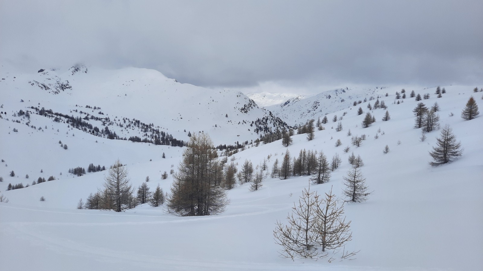 Wooo! Nous atteignons le col pour... ne pas admirer le vallon de Cristol dans les nuages. Descente avec les yeux des orteils dans le jour blanc. Stop à 2230 pour l'éclaircie du jour et l'exercice de recherche collective de victimes d'avalanche.