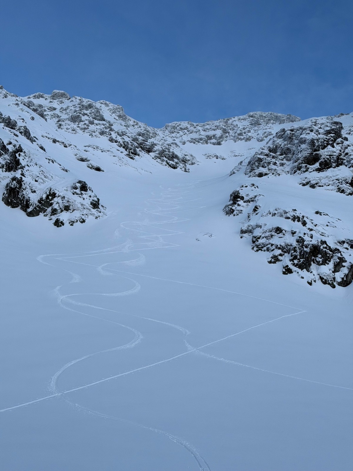 Les signaux du terrain étaient favorables (cf. rubrique conditions). Restaient deux facteurs très négatifs : la présence d’une première trace, nullement gage de sécurité, bien au contraire…, et le sentiment de rareté, évident au vu des conditions, susceptibles d’induire en erreur. En l’absence d’indice terrain défavorable, j’y vais en me disant qu’au moindre signal d’alerte ce serait demi-tour, il n’y en eut aucun. J’ai quand même contourné la pente terminale, qui traverse au dessus des barres, pour passer par un petit collu plus bas, par où passait la trace de montée (passage fréquenté ces derniers jours).