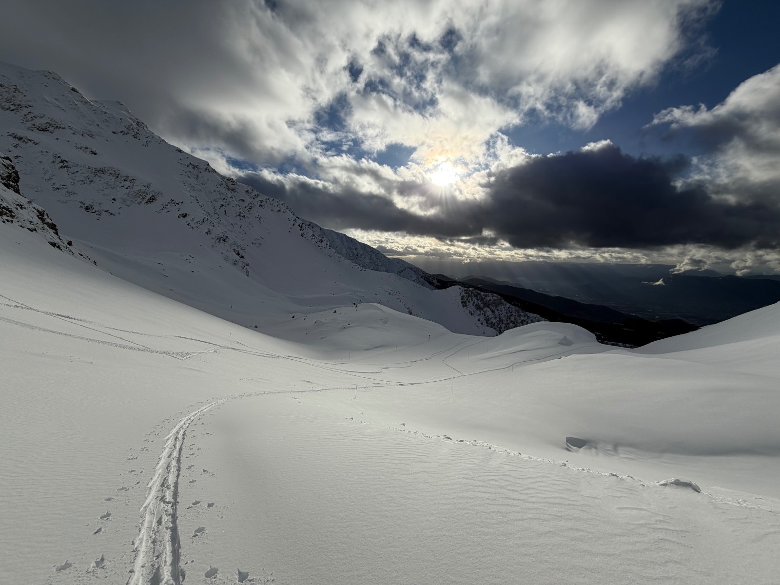 Belle surprise ce jour alors que je m’apprêtais seulement à remonter des pistes, l’accalmie laisse place à une magnifique éclaircie. Après avoir tâté la neige du jour et les conditions une première fois à Pouta (fermé ce jour, les pisteurs enlèvent les sièges en prévention de la tempête), je prends la décision de suivre une première trace faite vers la Jasse par un skieur solo.