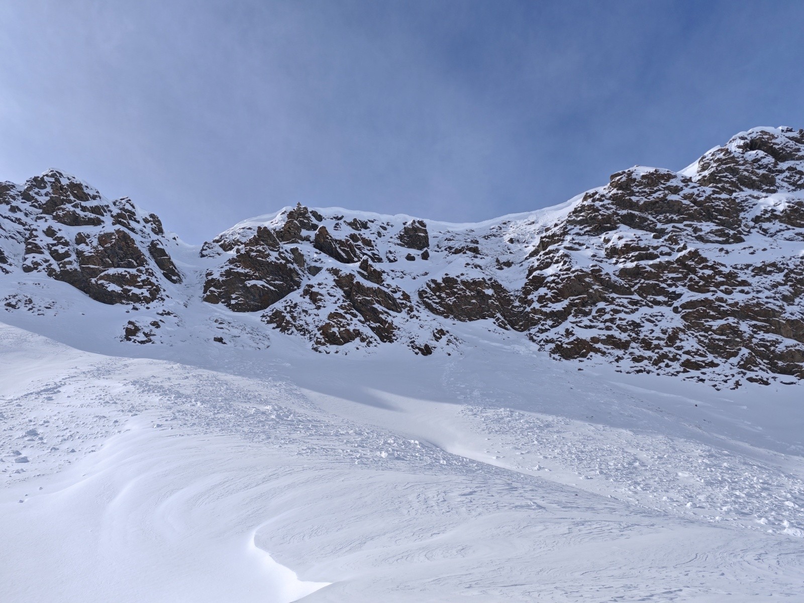 Conditions nivo et activité avalancheuse : Plusieurs coulées dans les couloirs de Château Renard avec de grosses cassures, sûrement parties la veille ; mais le principal n'a pas purgé. Coulée en face vers le talus SW sous Clot Méa.