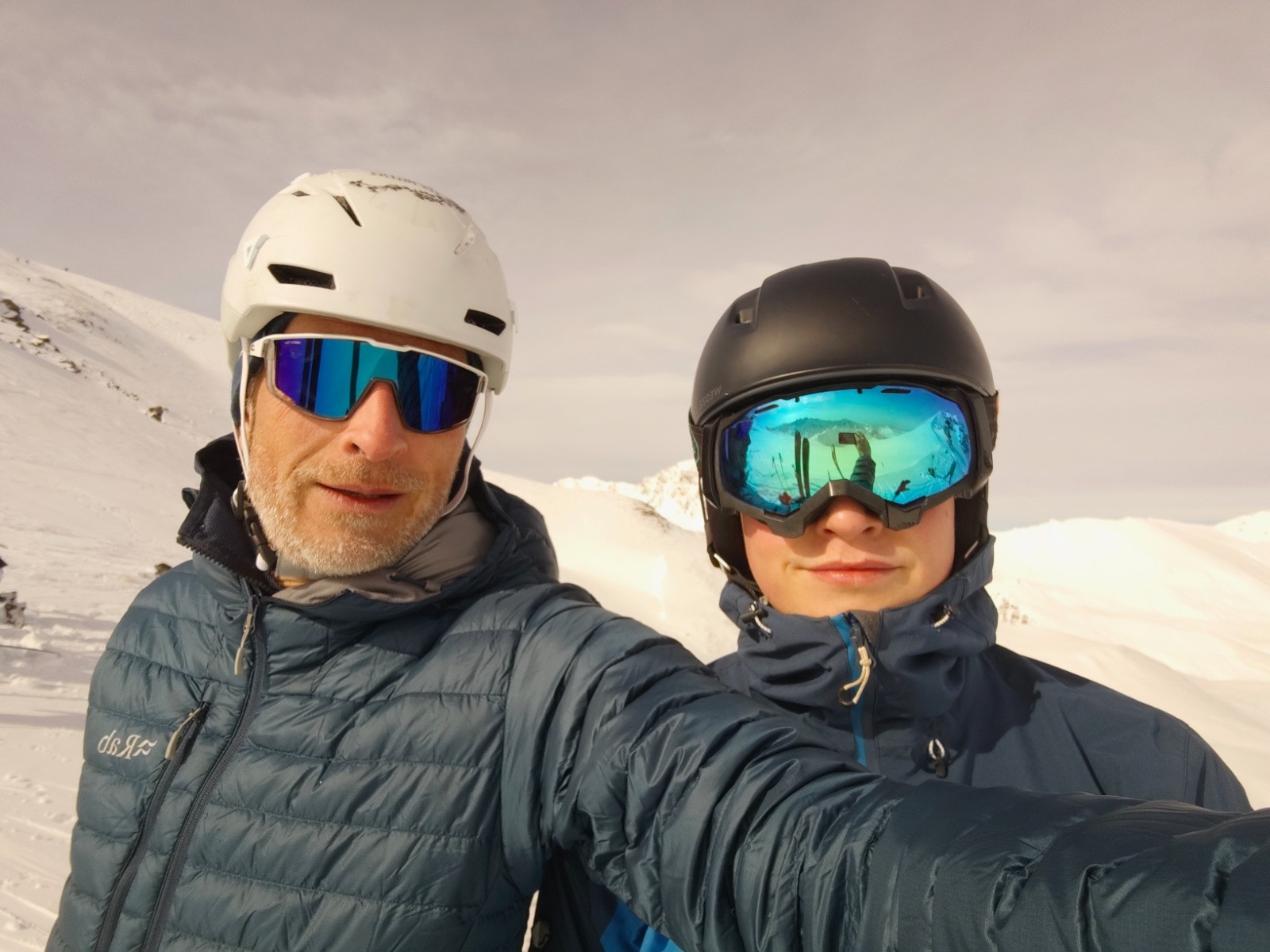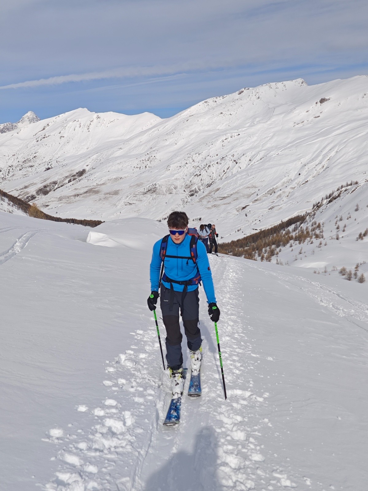 Initiation avec Flo. Du monde sans plus, le vallon est un "refuge"* en risque 4. Très bonnes conditions de ski, de la place à la descente et même un retraçage partiel là où les prédécesseurs tiraient un peu droit et raide.