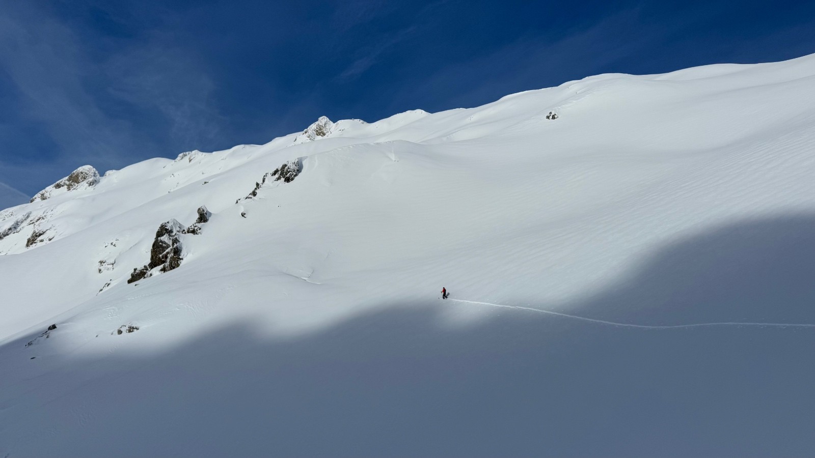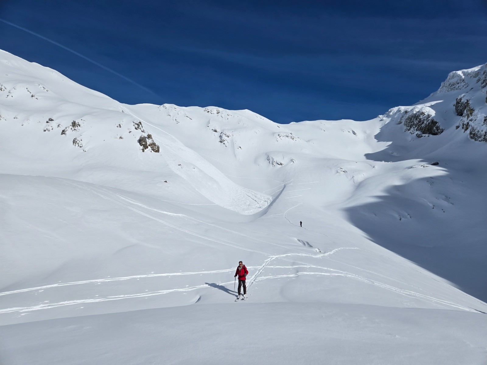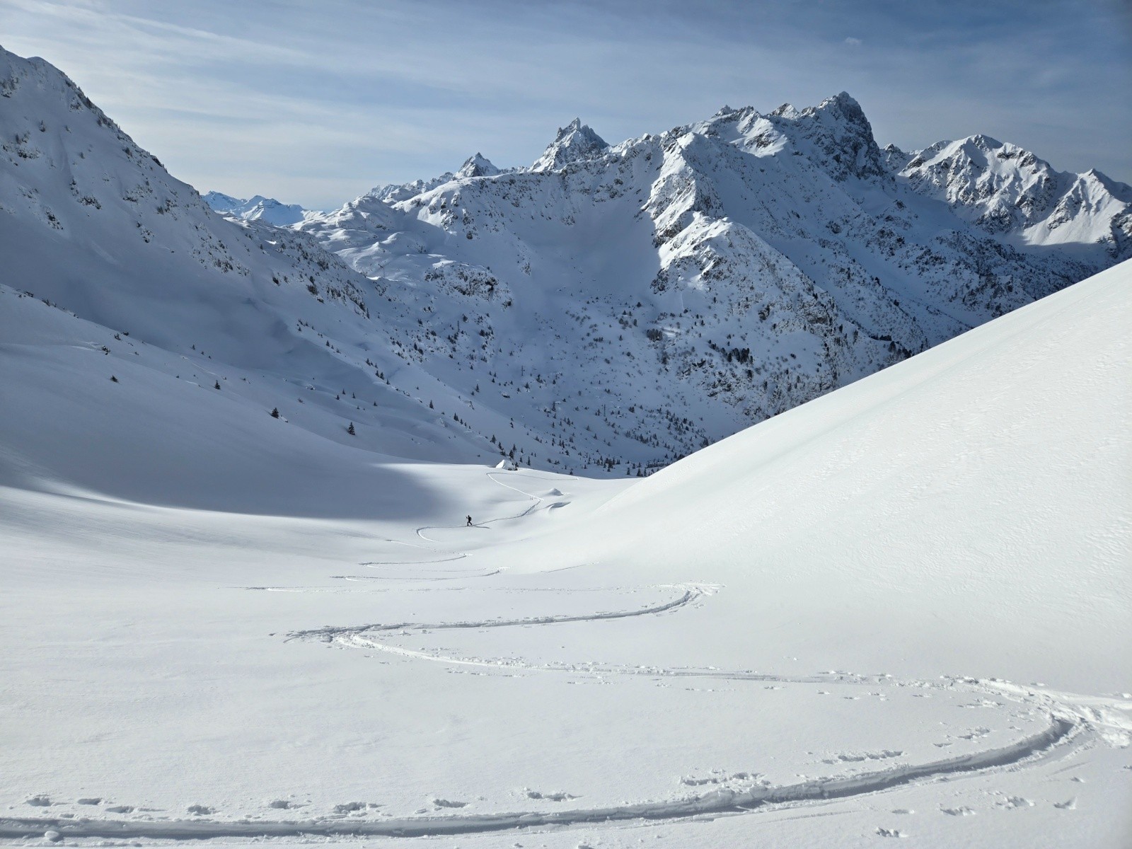Conditions nivo et activité avalancheuse : peu de signes du vent, vallon assez propre a part 2 ou 3 plaques parties pendant la dernière chute sur les raides, proche des rochers.