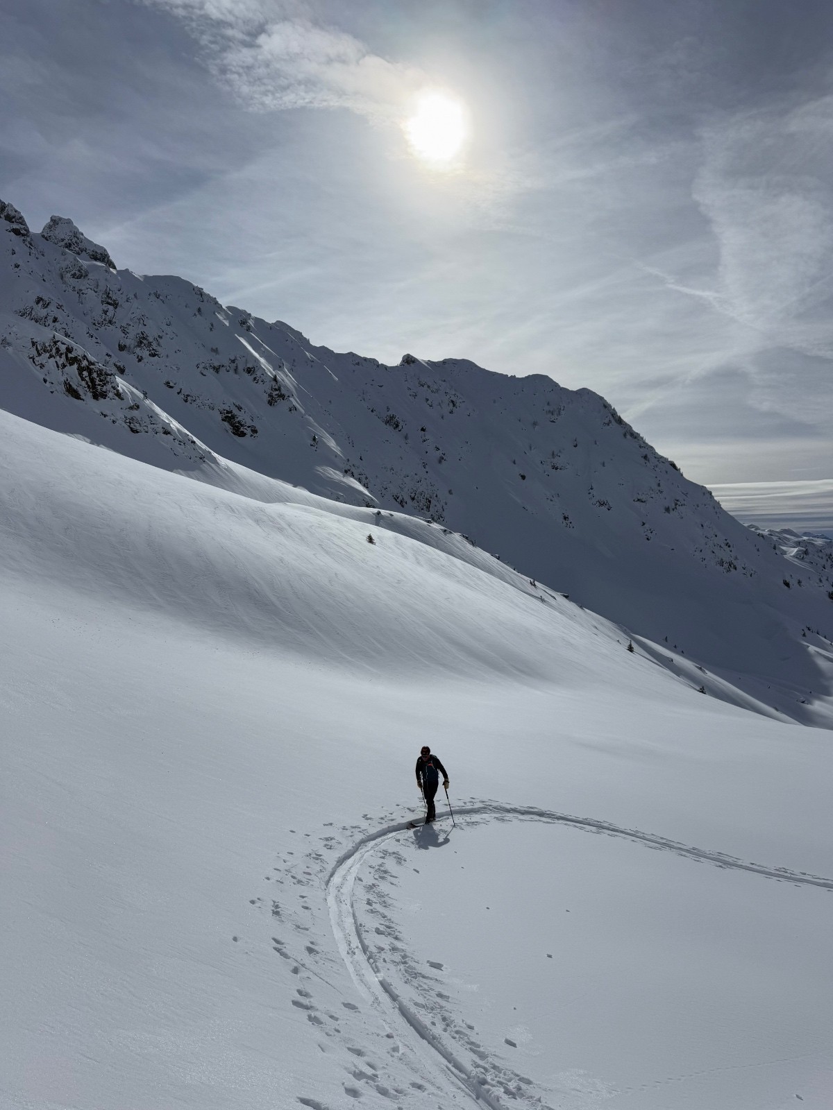 Conditions pour le ski : T.Bonnes. ski facile, poudre déjà un peu tassée. 40 a 50 a 2100.
