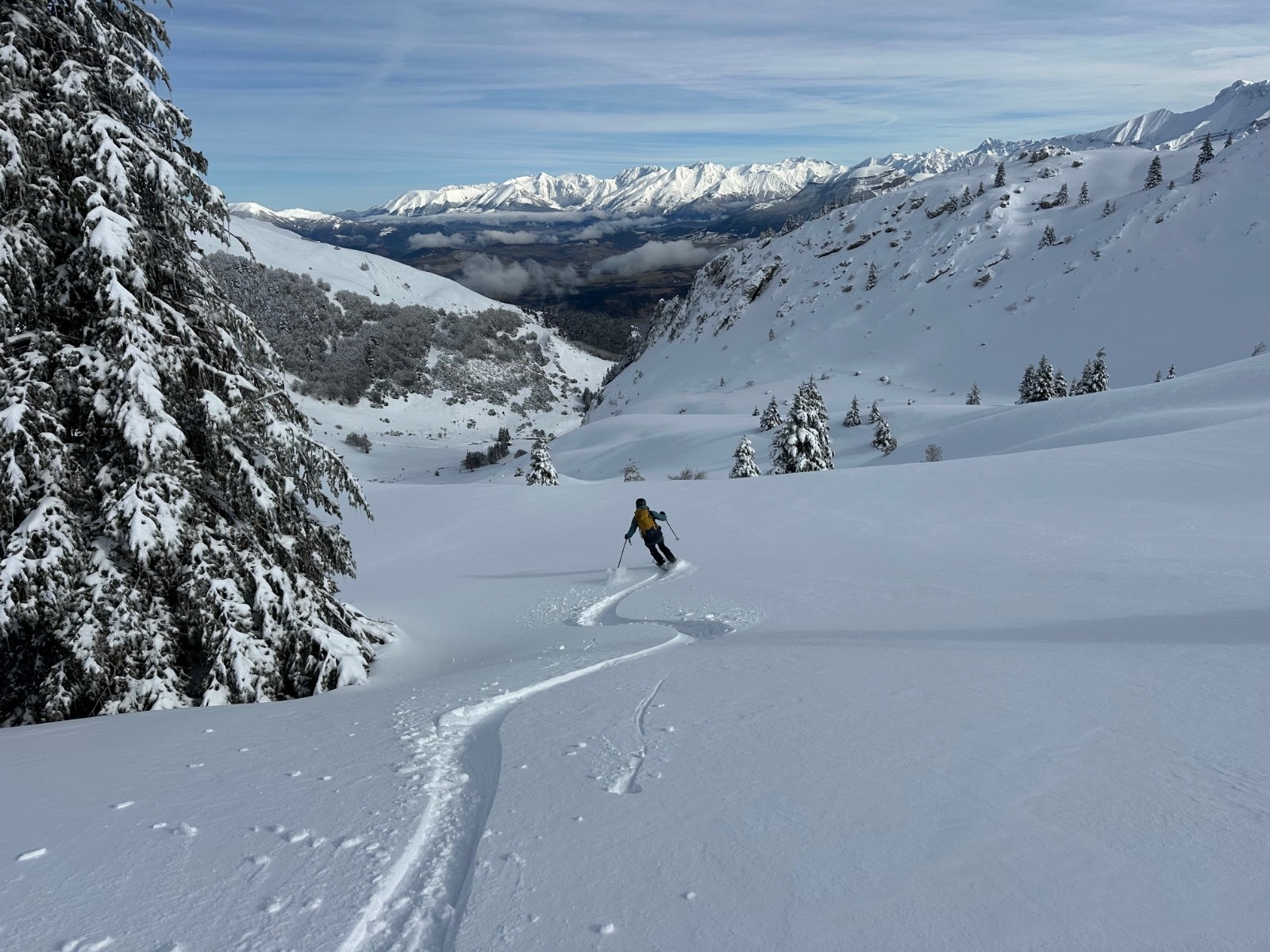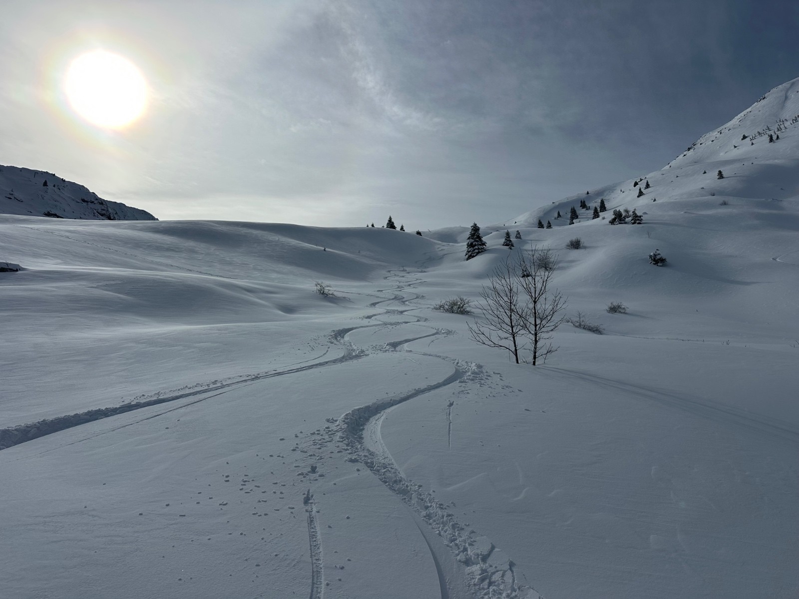 Itinéraire suivi : le risque d’avalanche et la courte fenêtre météo annoncés ( et un réveil tardif, hum)nous font choisir cette rando dans des pentes débonnaires, en évitant d’aller tutoyer les aplombs du Jocou ou du Larchat. Nous montons avec JL par l’ancien chemin, jusqu’à la station, puis le vallon par le milieu. Au Col, peu de neige, durcie par le vent, nous montons jusqu’aux rochers en versant est. La (courte) descente par l’itinéraire de montée est… fabuleuse !