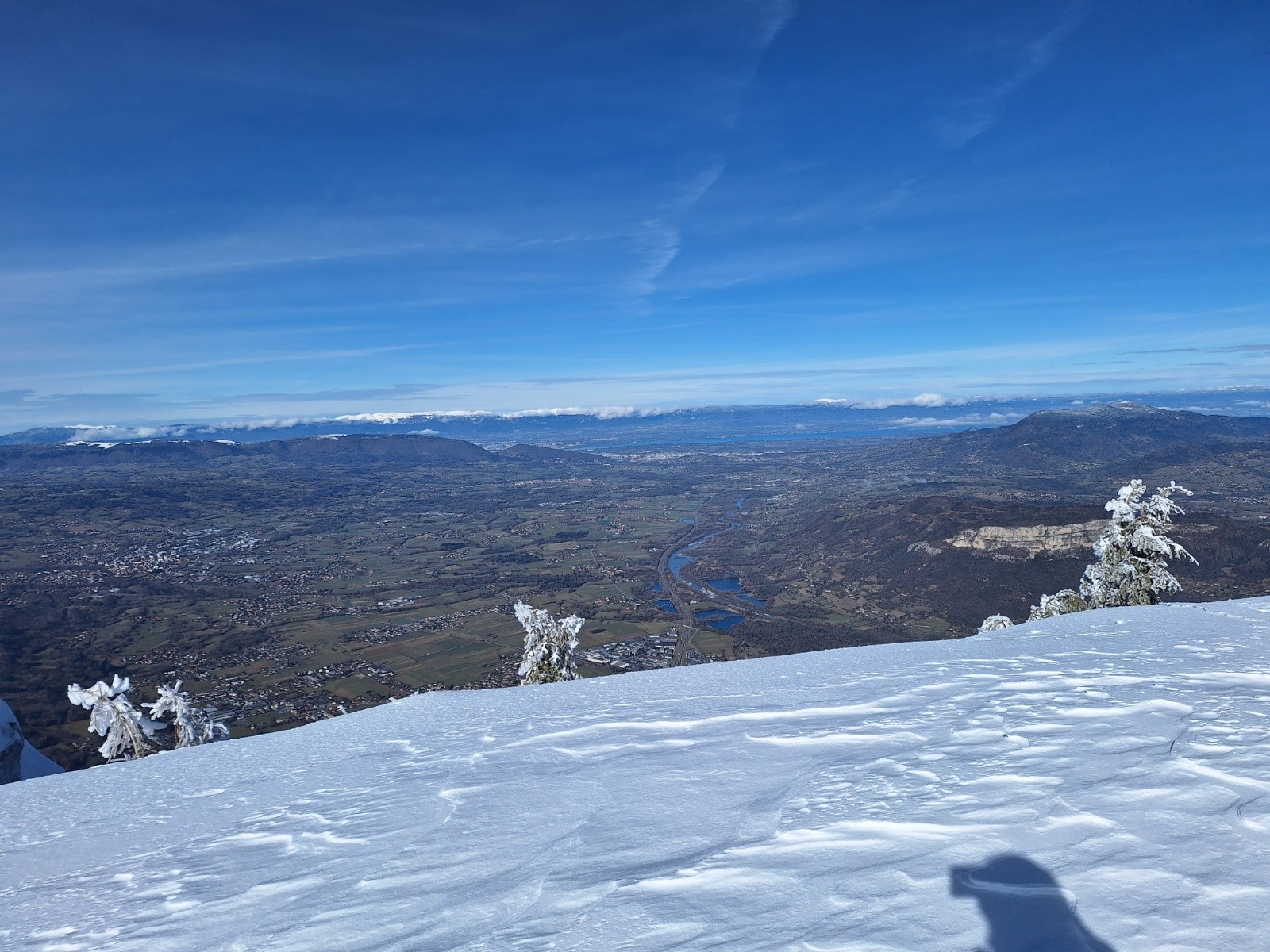 Sommet : neige densifiée par le vent, plus légère proche des sapins, à gauche.
