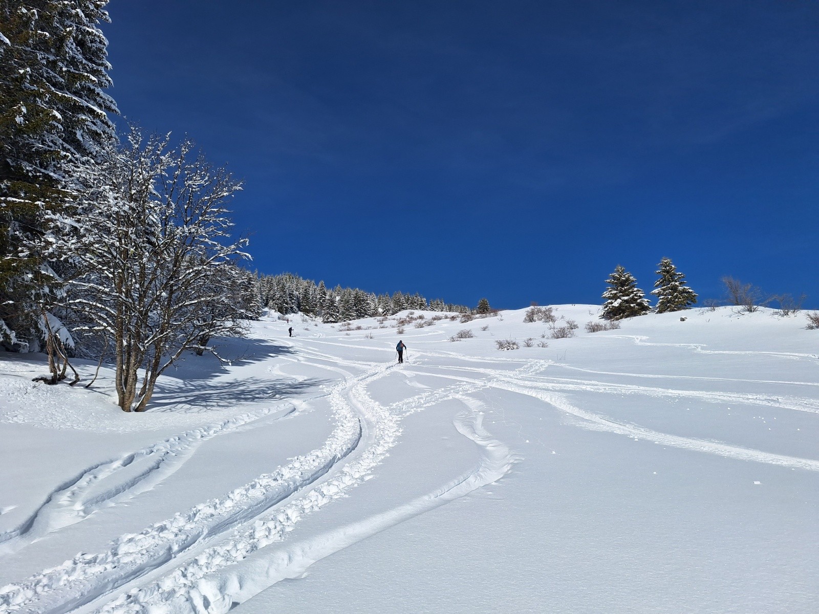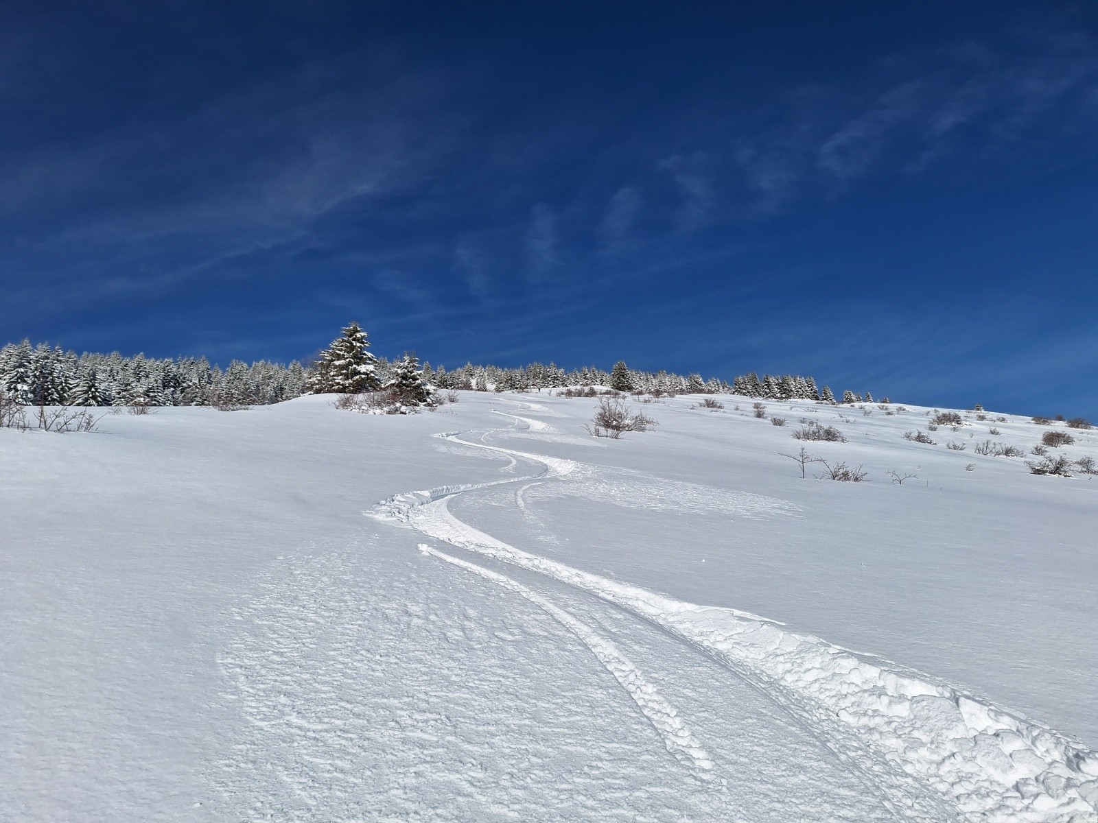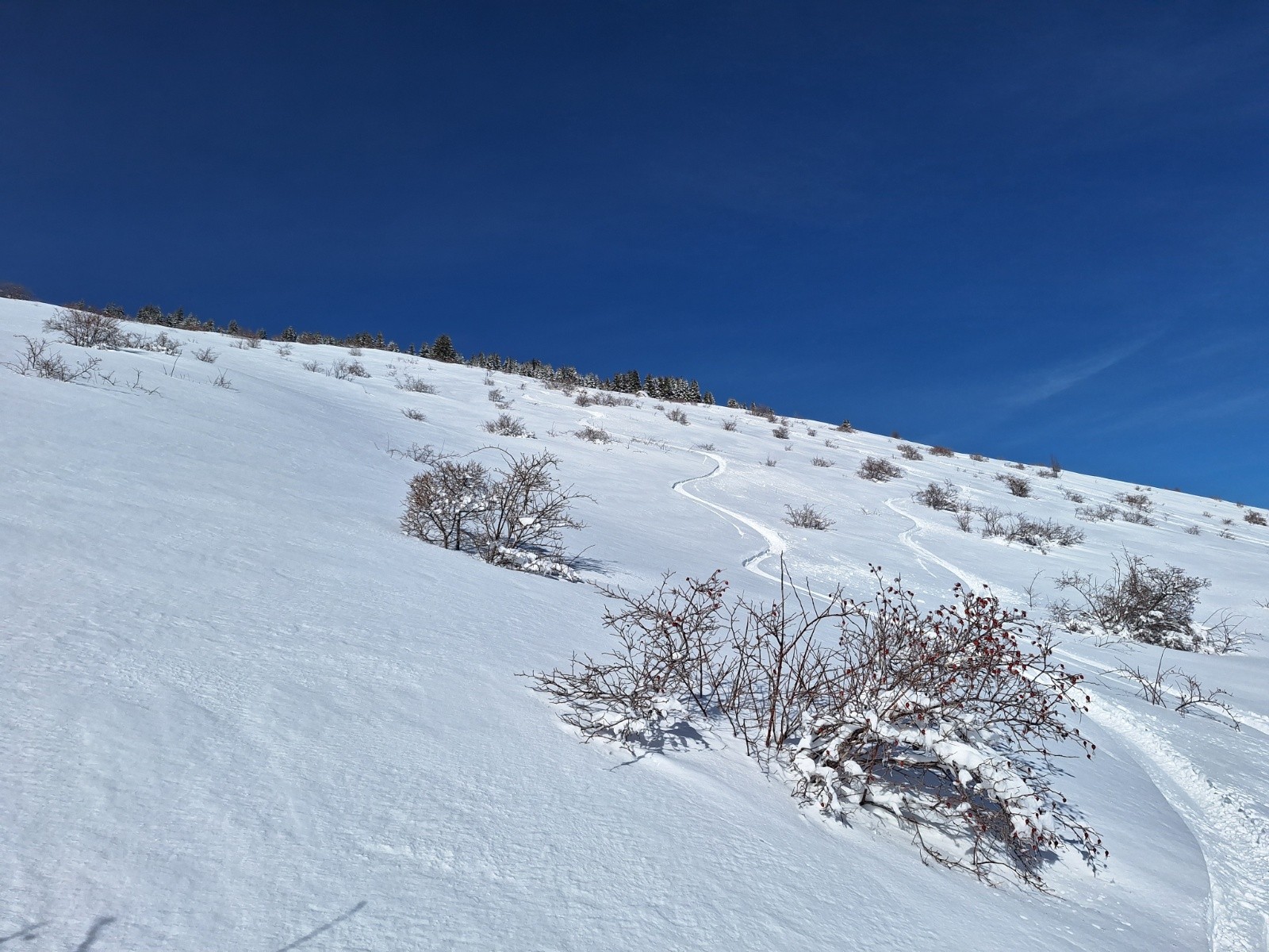 La descente est franchement bonne, même si en haut, sur la droite il faut jouer avec les zones ventées. Ensuite, je prends donc le champ qui m'avait fait de l'œil! La neige est dense mais quel plaisir de zigzaguer au milieu des ronces dans cette pente vierge 😎