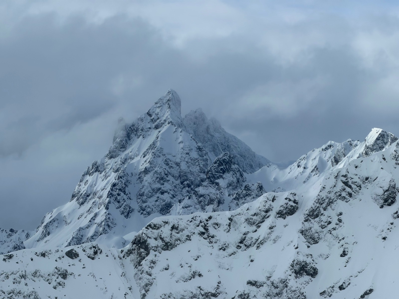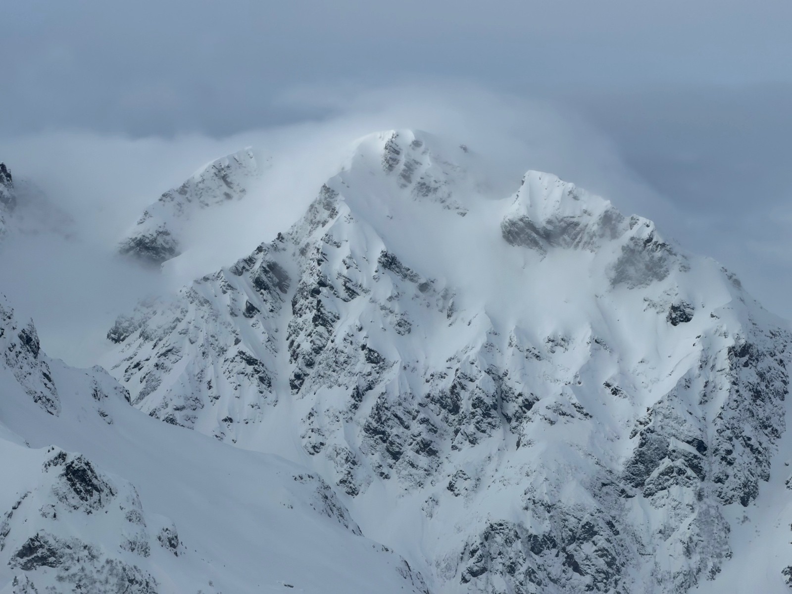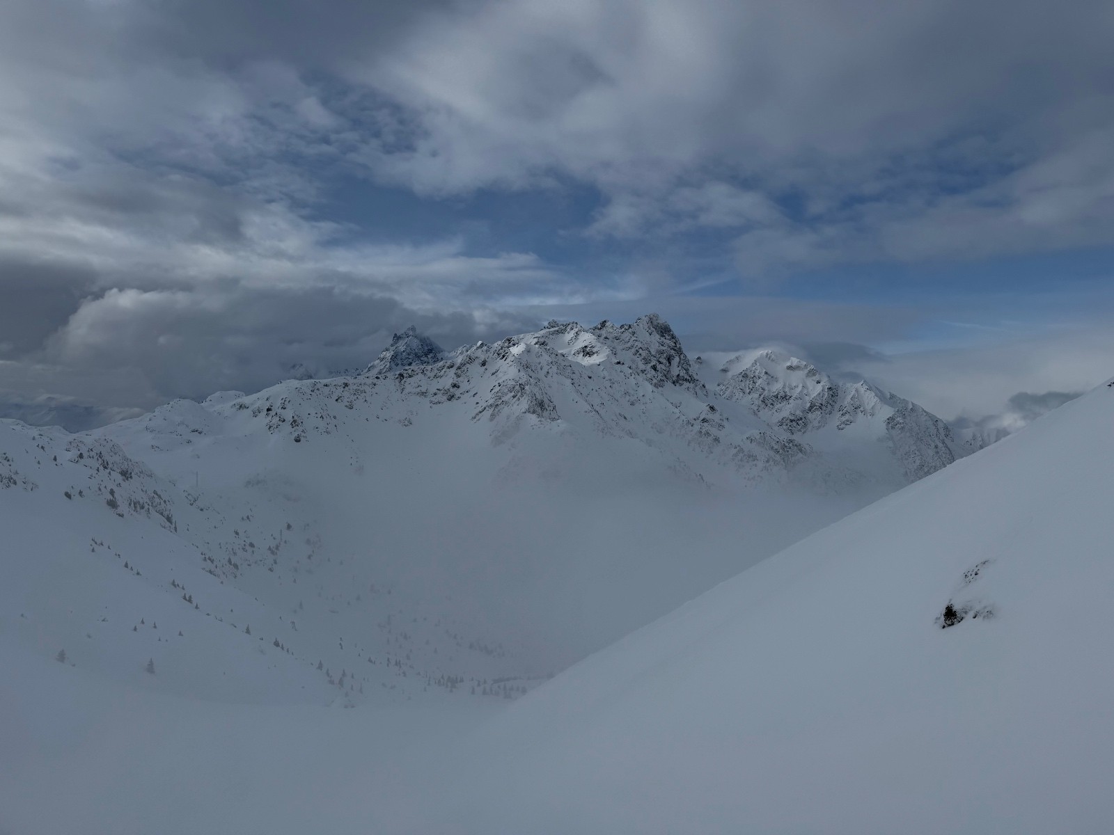 On finit donc par sortir timidement de la forêt, alors que les nuages remontent. Nous étions seuls dans le vallon, à suivre la trace faite hier, astucieuse. Soudain, trois coups vains de PIDA ont retenti, et le rideau s’est levé, au loin, sur un théâtre de brumes et de cimes : Grand pic, Grande lance, Grand Replomb, majestueux…