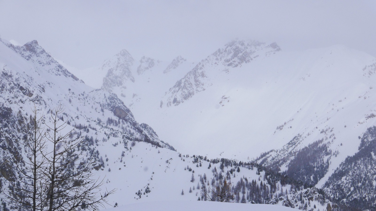 Risque 4 au-dessus de 2 000 m et temps maussade; cela devient compliquer de skier au-dessus des bois.