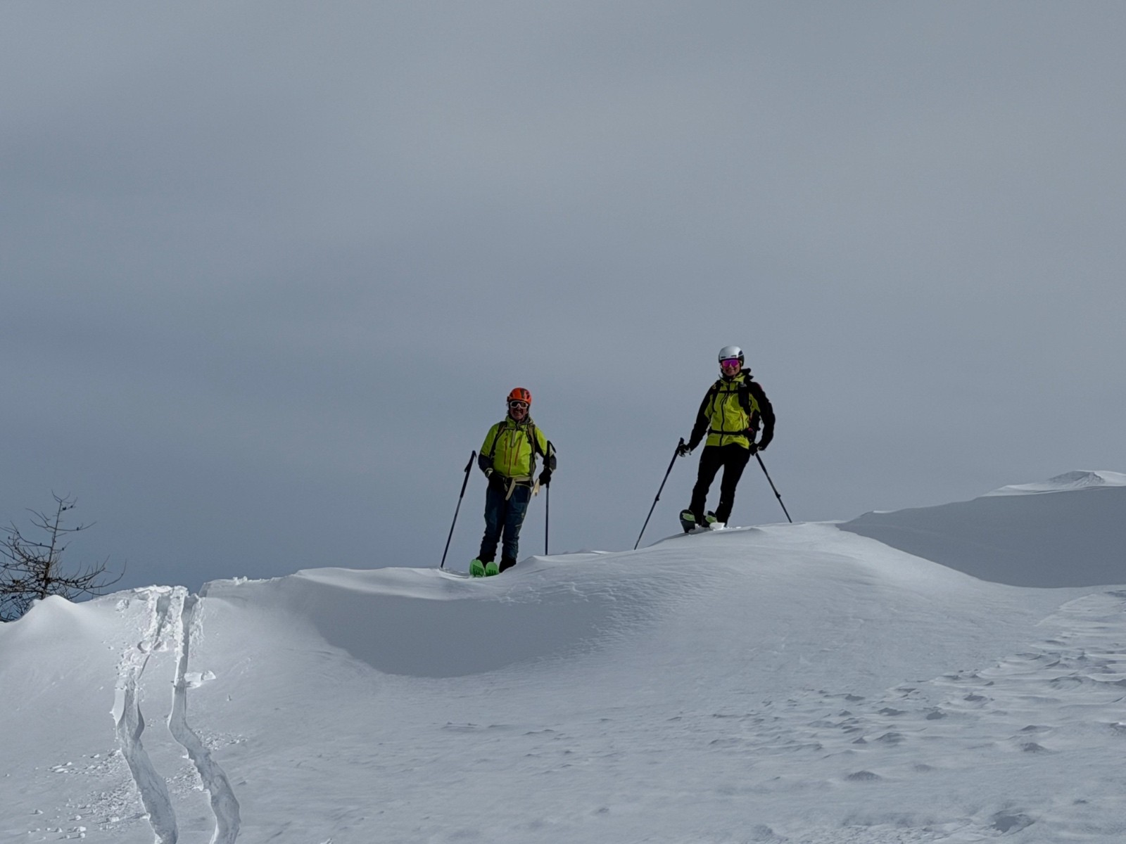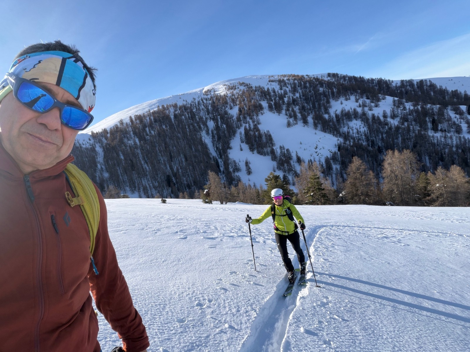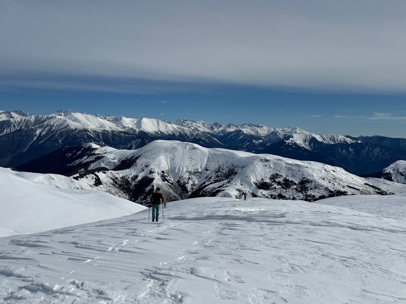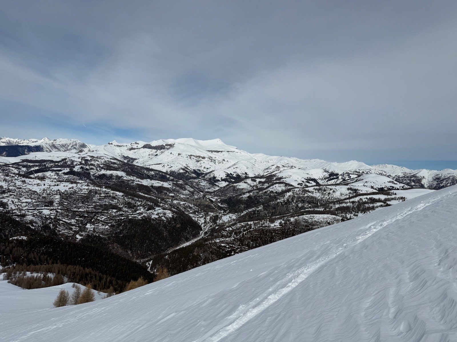 Conditions pour le ski : la forêt est bien remplie de neige mais l’altitude la transforme vite sur le bas. En haut pas mal ventée, soufflée, parfois croutée parfois poudre. On a réussi à trouver quelques filons notamment dans la descente NordOuest du Giarons.