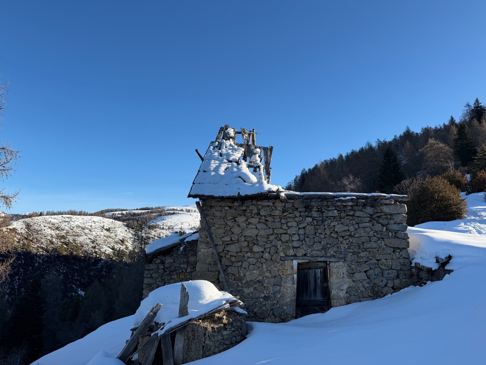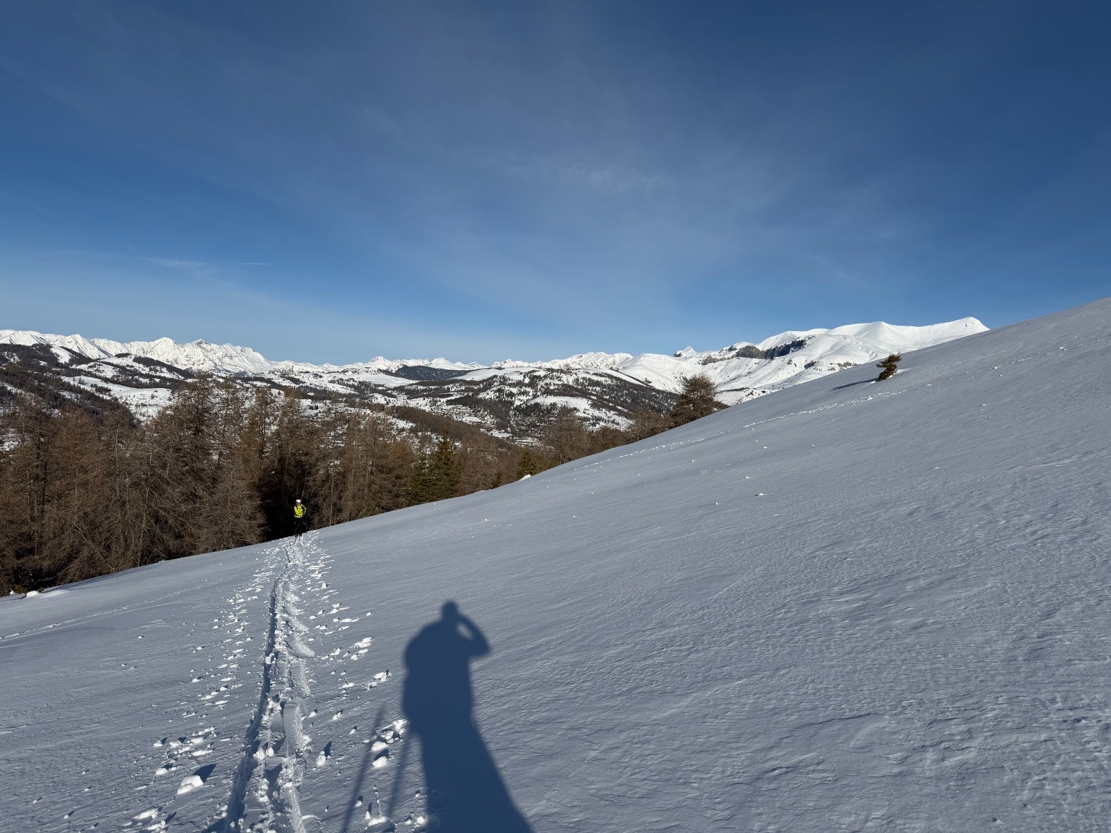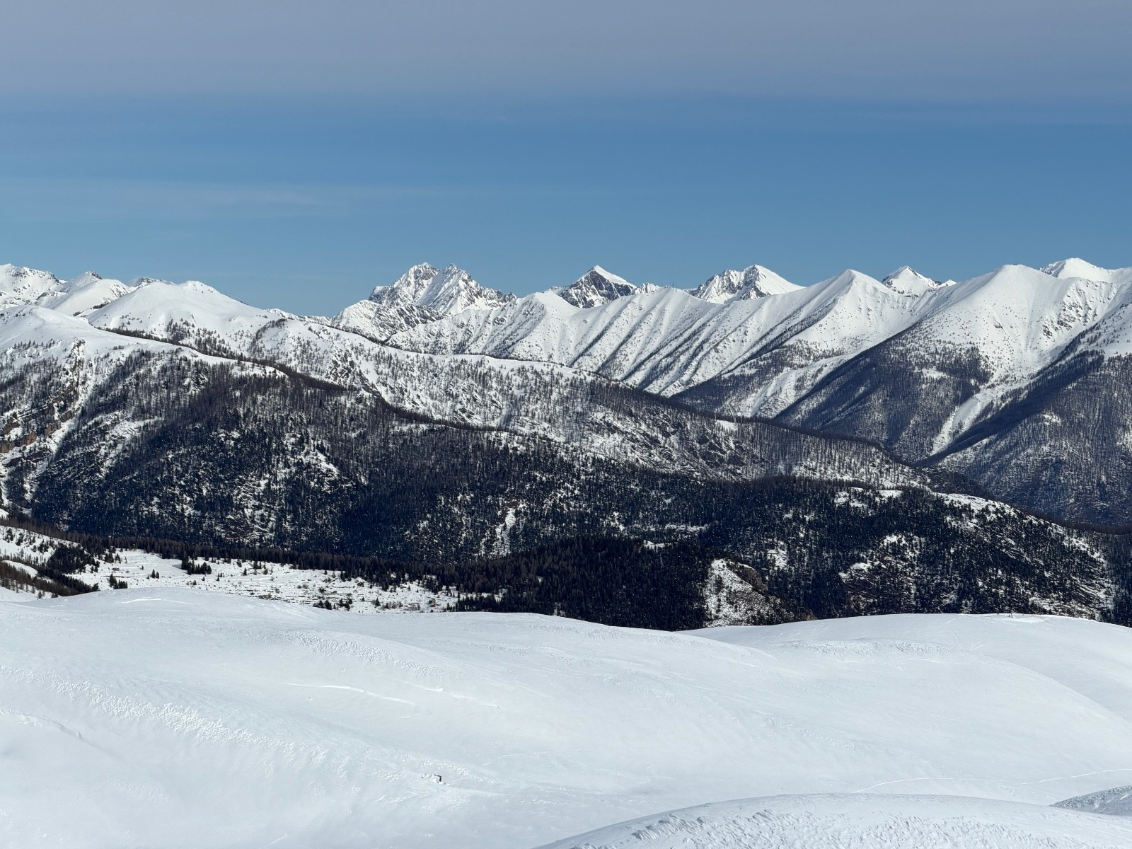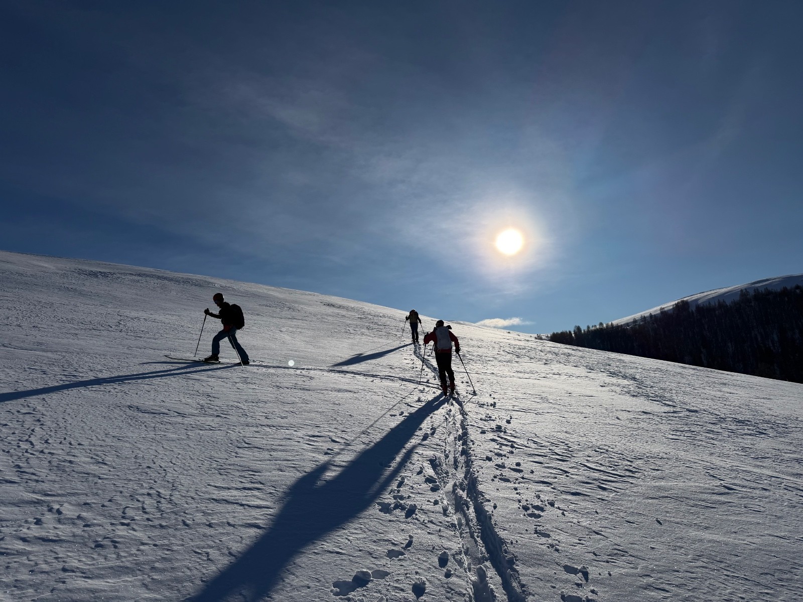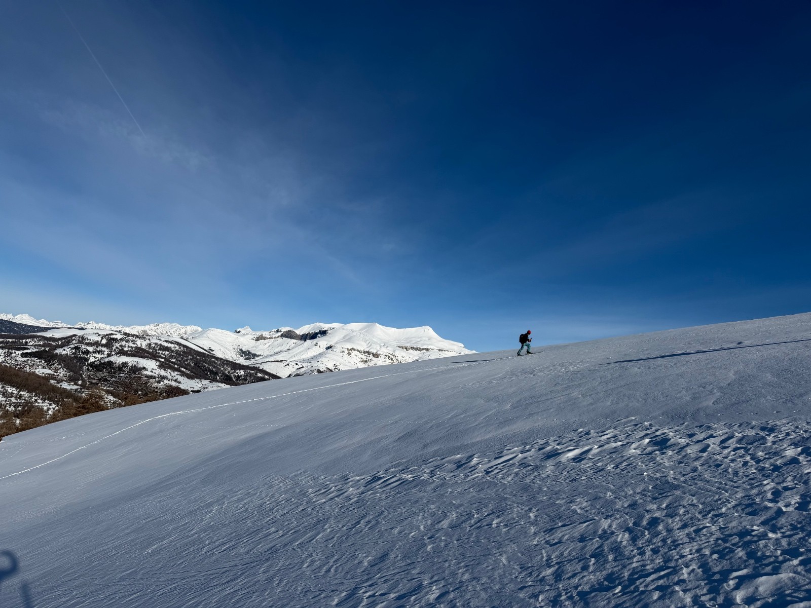 Conditions pour le ski : la forêt est bien remplie de neige mais l’altitude la transforme vite sur le bas. En haut pas mal ventée, soufflée, parfois croutée parfois poudre. On a réussi à trouver quelques filons notamment dans la descente NordOuest du Giarons.