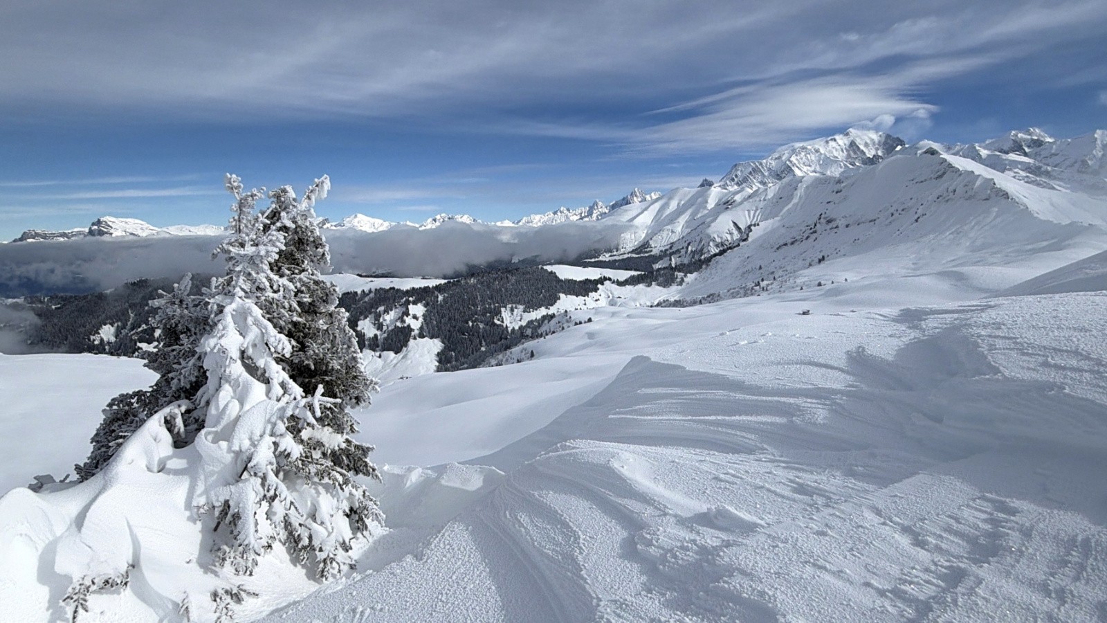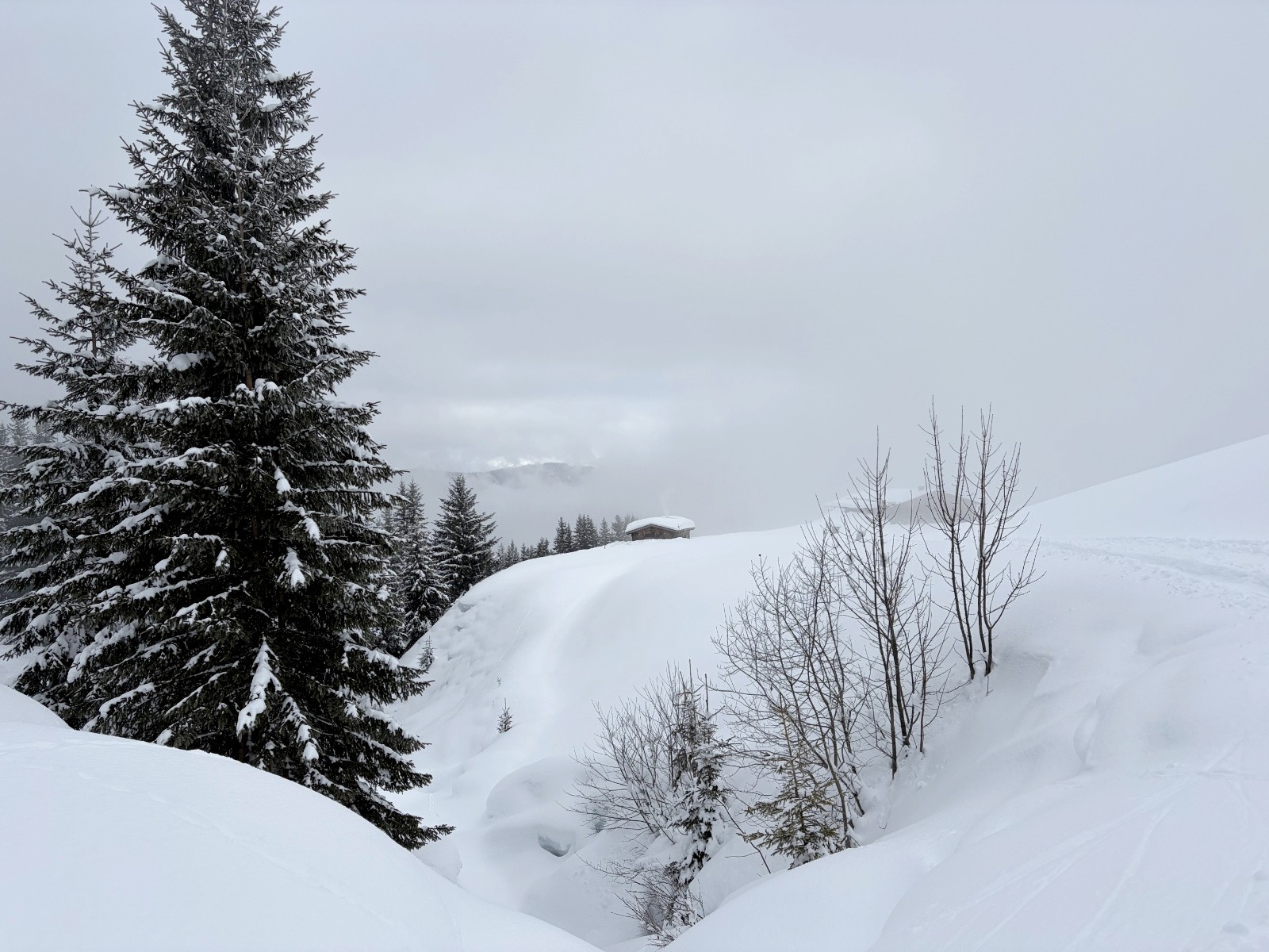 Conditions pour le ski : 20cm de poudreuse puis piste (inévitable malheureusement) pour finir en neige croutée en cours de transformation au dessous de 1500m