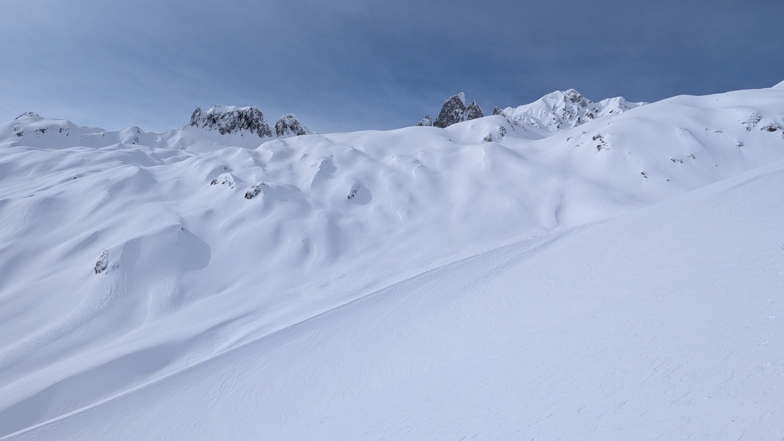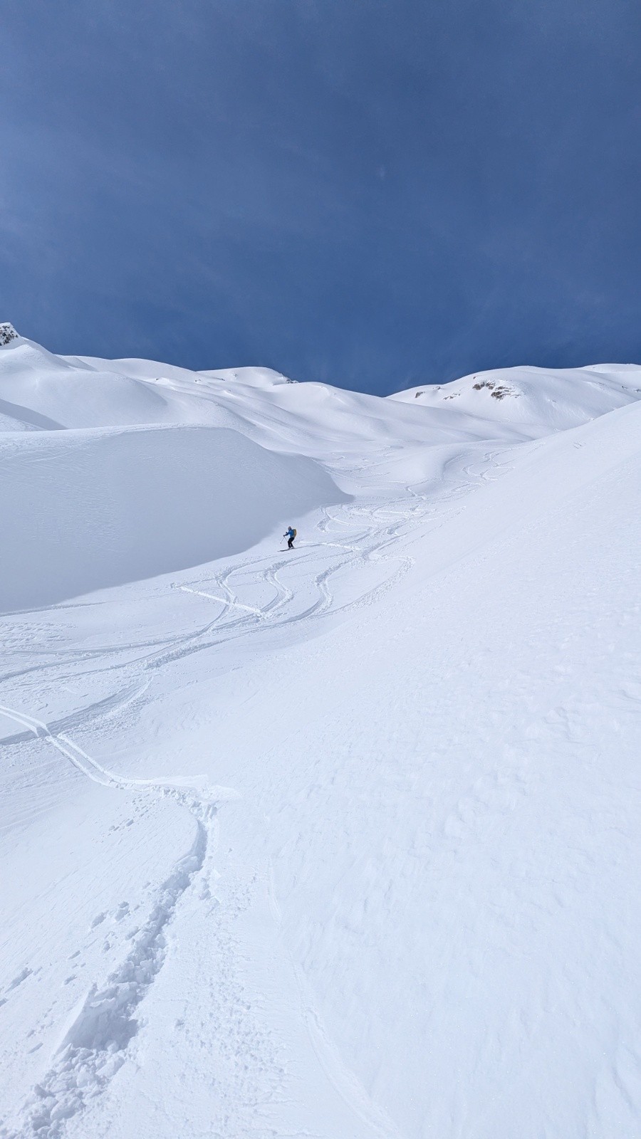 Conditions pour le ski : Changeante sur la montée (carton, poudre tassée), poudre tassée au dessus de 2000 puis de moins en moins tassée, mais de plus en plus lourde sous 1700m.