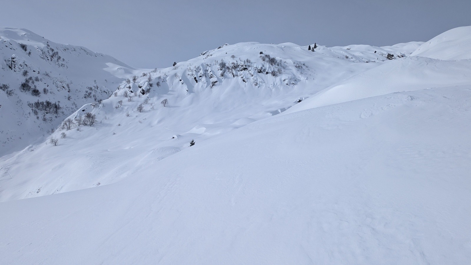 Conditions nivo et activité avalancheuse : Avalanches de fond (anciennes) en bas, une belle cassure vers le sommet du Rognolet, des vieux dépôt. Passage sur une croupe de 10m pour éviter une pente à 35, ça partait sous les skis sur 15cm.