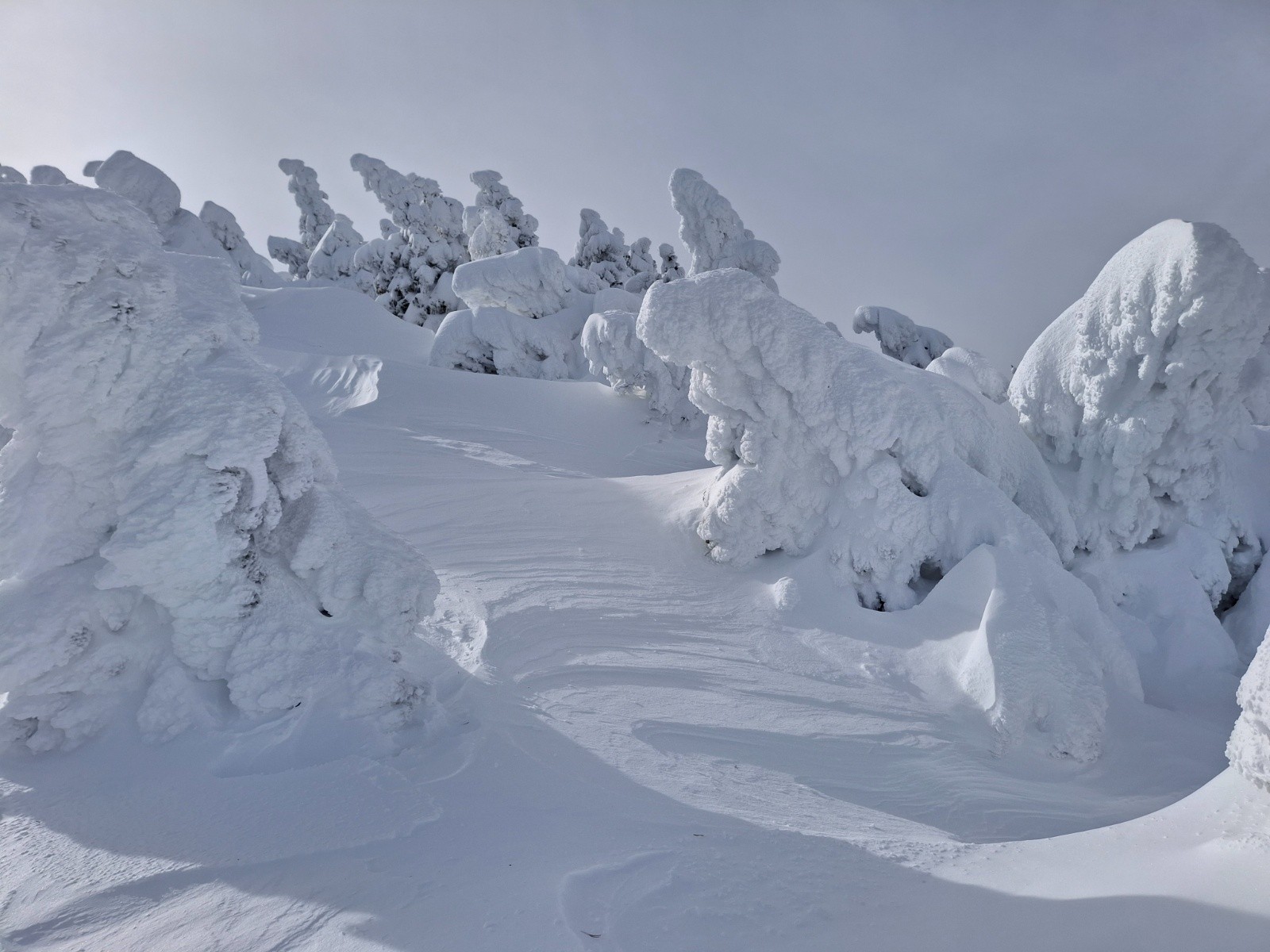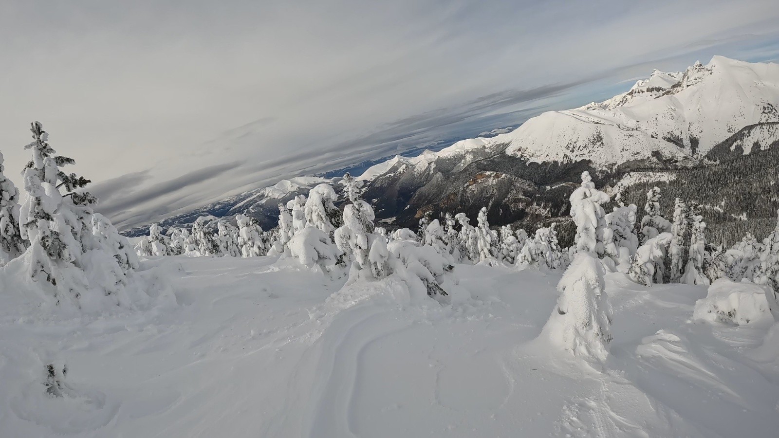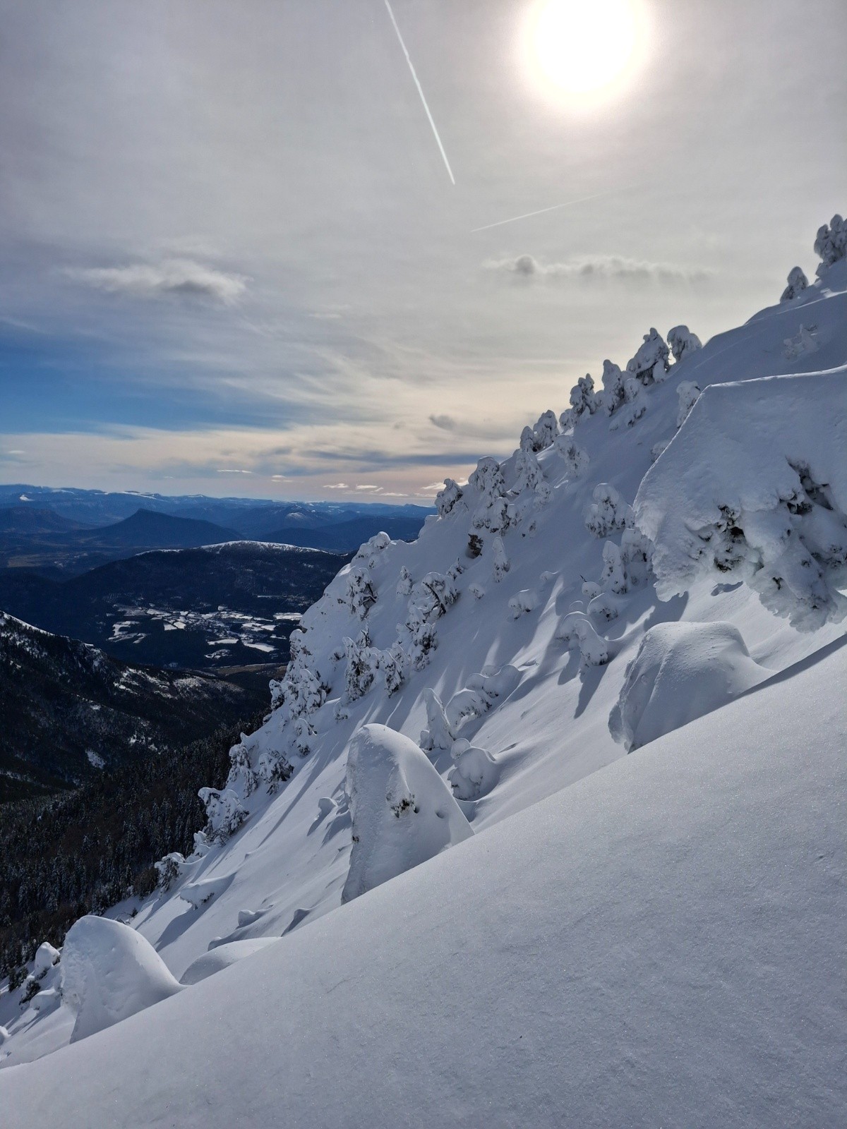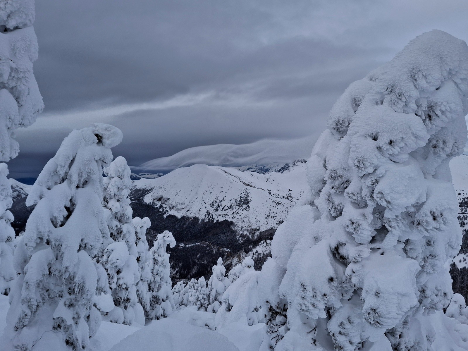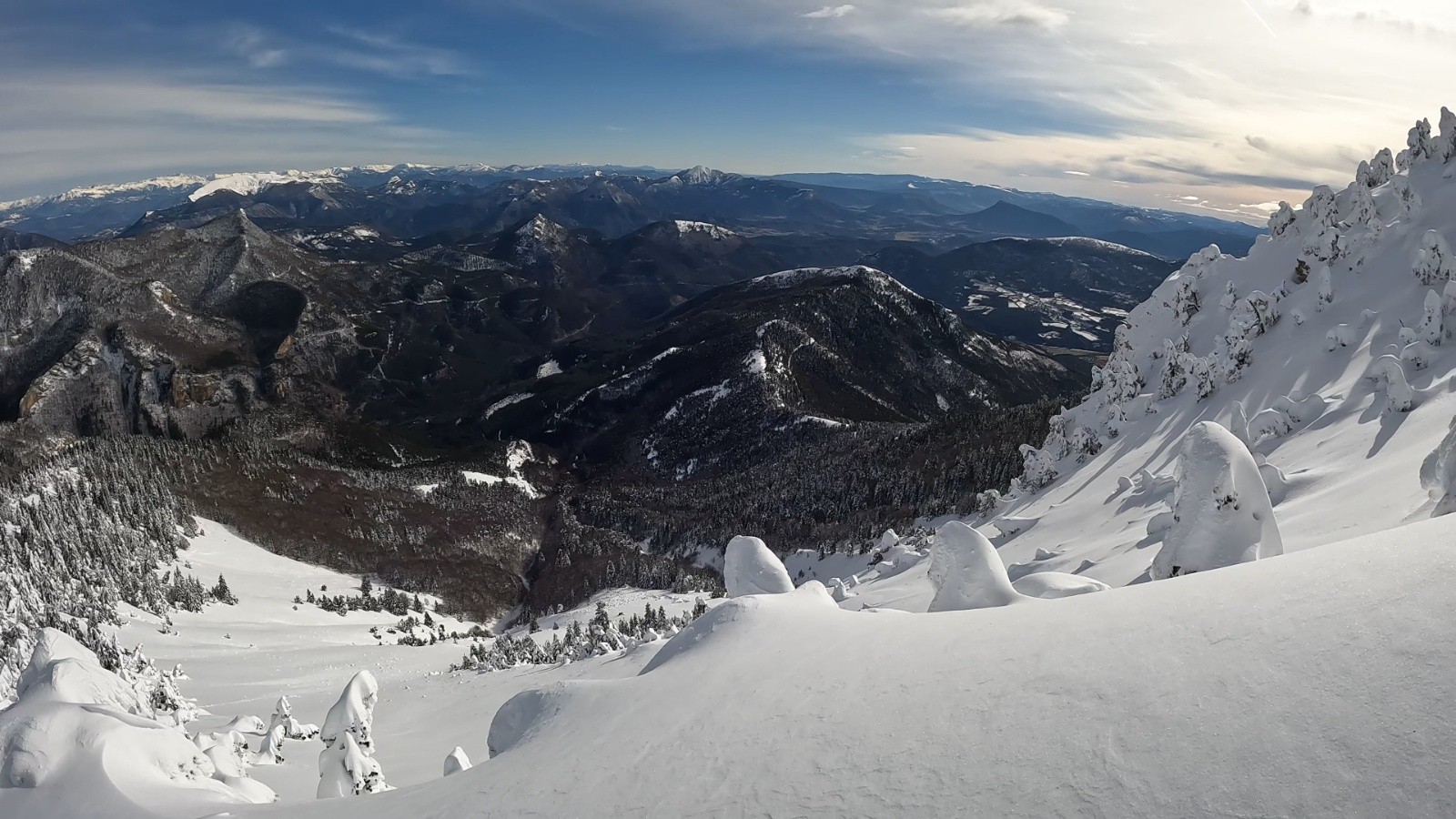 Sommet très esthétique, sous une épaisse carapace de givre et neige gelée. Mais pas si bon à skier, grosses congères entres les arbres, cartonnée par le vent ou en givre. Devient très bon, sous 1800m, la ou la tempête à moins fait de ravages.
