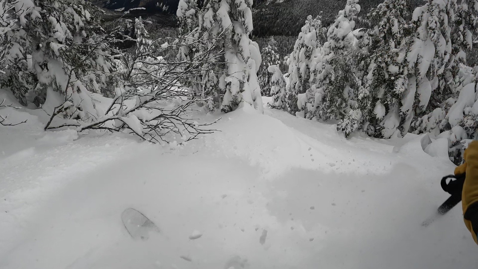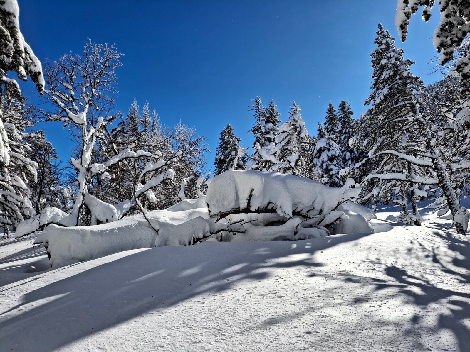 Pas mal de "tas" de neige gelée dans la foret, grosses accumulations humides sur les arbres tombée puis regelée. Quelques arbres cassés très récemment également...
