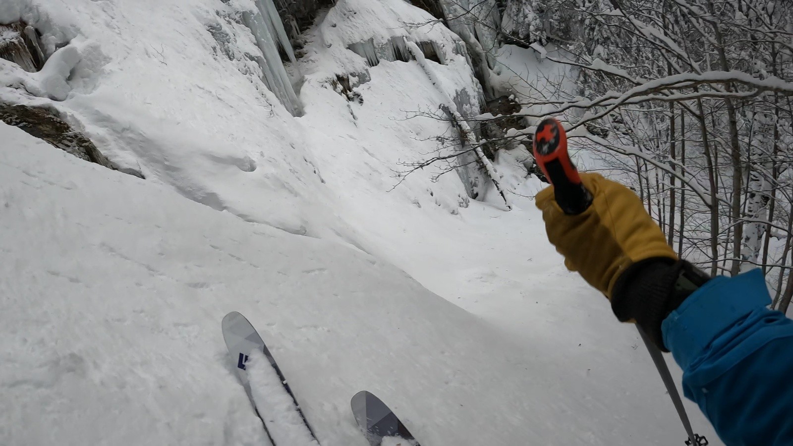 Une première descente sympa, mais pas autant qu'espérée car je n'arrive pas à retomber dans une des trouées de la forêt. Remontée laborieuse sous un ciel qui se couvre à vitesse grand V, mais seconde descente très bonne avec cette fois un peu de place entre les arbres. Je poursuis la descente par l'Eschau pour du ski gentiment sanglier arboricole (une cascade vers 1550m à contourner par la droite, mentionnée sur IGN), puis la ravine retombant dans le ravin des avalanches, bien remplie (avec quelques boulettes), dont le fond correspond quasiment pile à l'altitude du "beaucoup moins de neige".