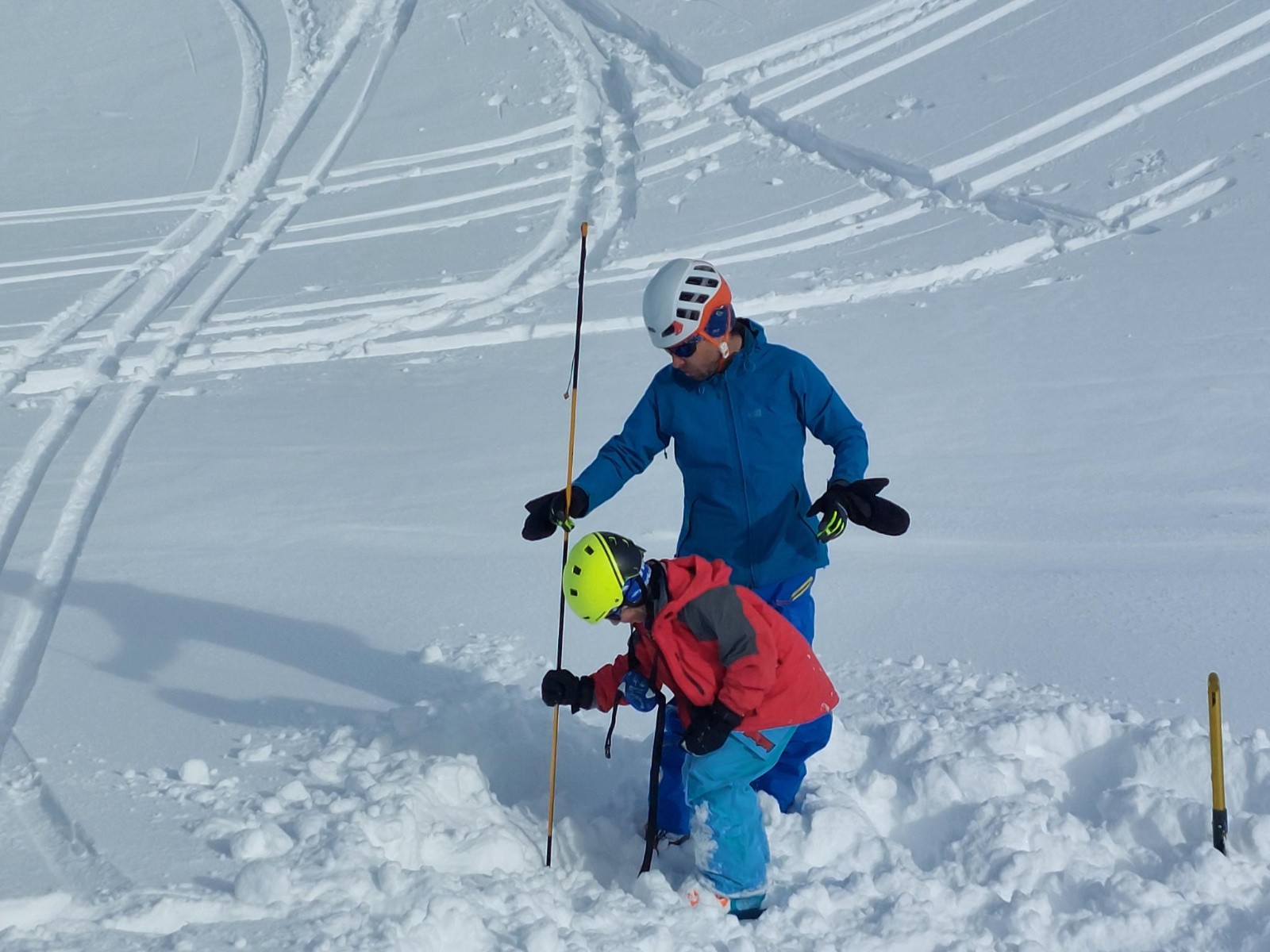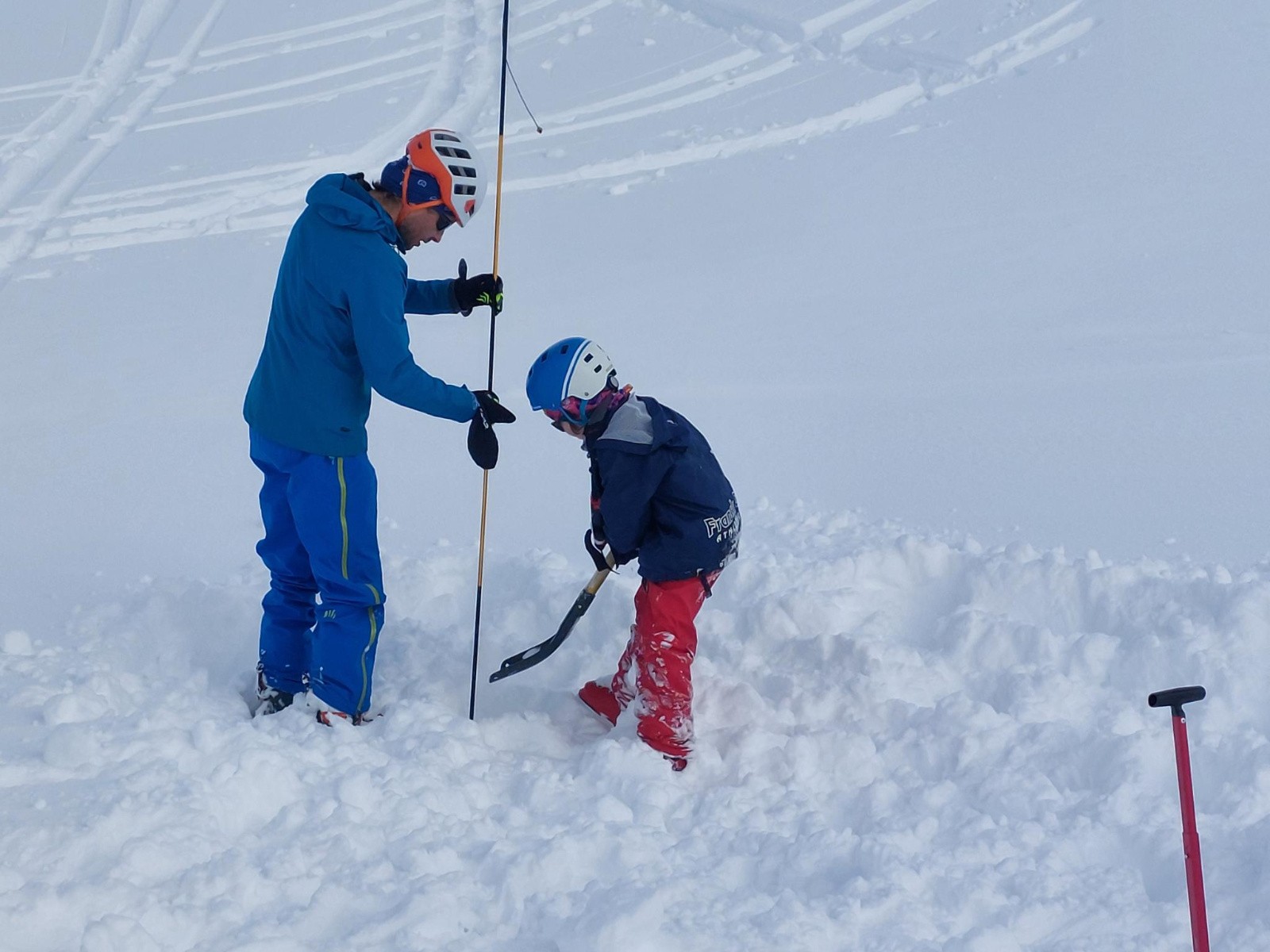 Après une pause au sommet, on fait un exercise DVA sur le replat vers le lac.