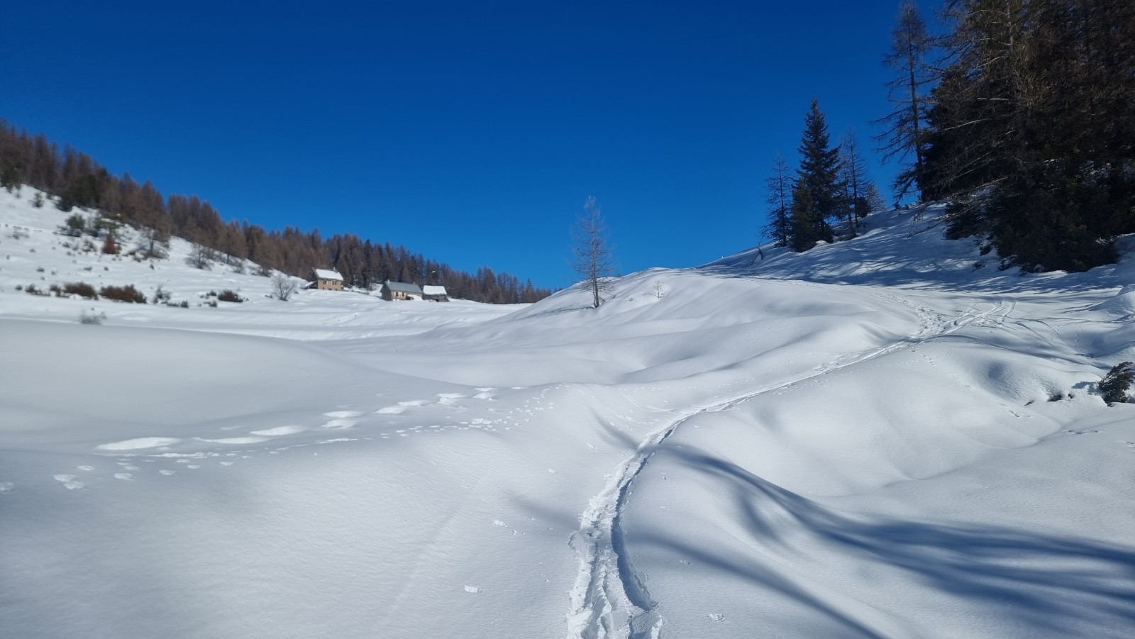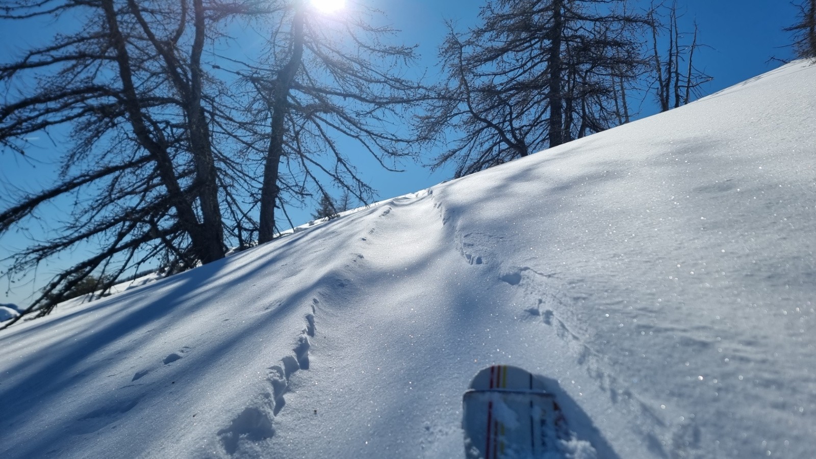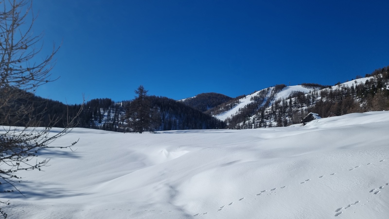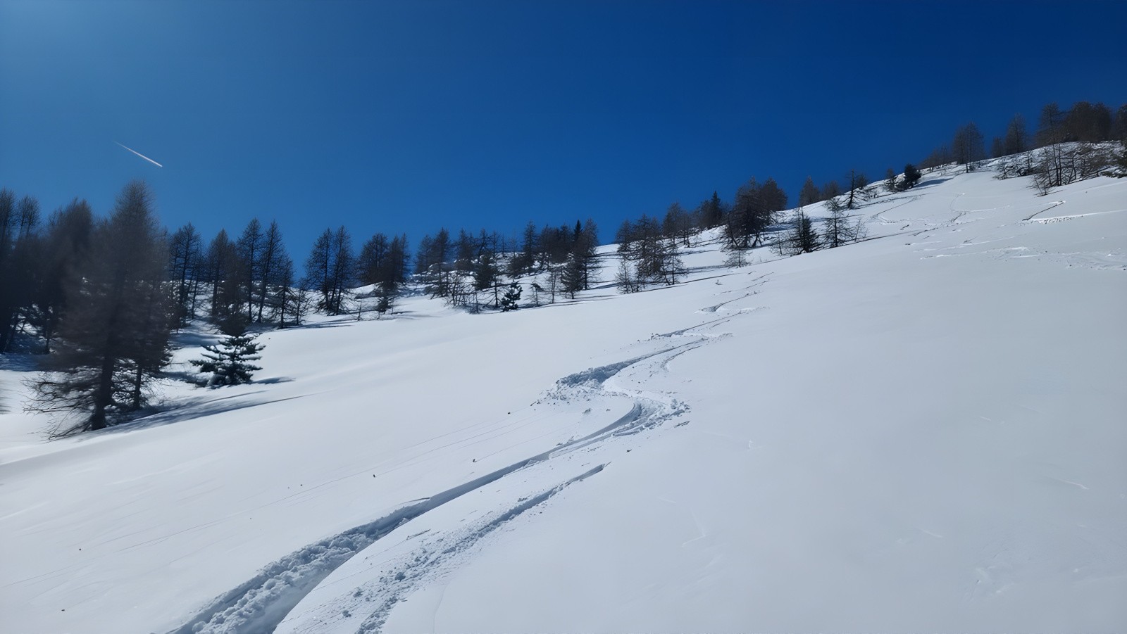 Sortie improvisée... En remontant vers le Mont Braissier je repère des champs vierges de poudreuse légère... Je me les garde pour la fin ! Je vais tricher et prendre les remontées mécaniques qui sont rarement (jamais) ouvertes : TS Pra Brulé et du Raton !!!! mais les pistes sont râpées... malgré la qualité exceptionnelle de la neige. Au second passage au Pra Brulé, je vais sortir des pistes pour mon grand plaisir !