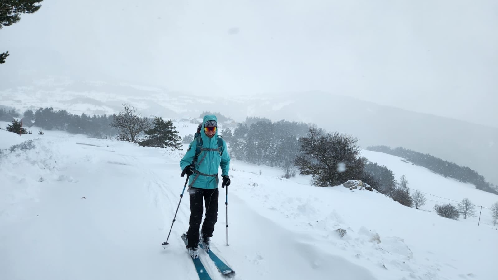 Fallait être motivés pour sortir aujourd'hui et trouver l'itinéraire safe (genre ski de fond !!) Bref on part du Collet ou on crèche, on prend la route toute blanche jusqu'à la ferme du Chastre ou le Bart se fait bouffer les mollets par les Patous 6 chiens autour de lui alors qu'ils m'ont royalement ignorés.... Faut croire qu'il est plus tendre que moi... On poursuit on trace tout du long a 1450 on sort de la forêt on voit pas à deux mètres ... on arrive tant bien que mal à la cabane puis on voit le Christ (le Bart est en plein rédemption !) on arrive au col (merci iphigénie) on dépote vite fait et on entame une descente ou on voit Nib , on retrouve un peu de visi en dessous de la cabane après dans la forêt c'est mieux mais pas de pente... Arrivés au point 1306 On remonte et on fait un détour pour éviter le clébards ! Le Bart tient à ses mollets visiblement ! on remonte un peu jusqu'en haut du Queyrou pour redescendre sur le collet. Tout petit dénivelé mais avec le traçage ça compense... on fera mieux demain ...