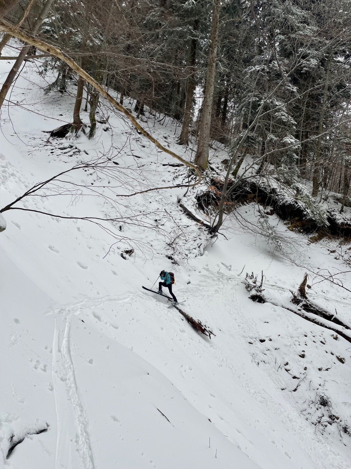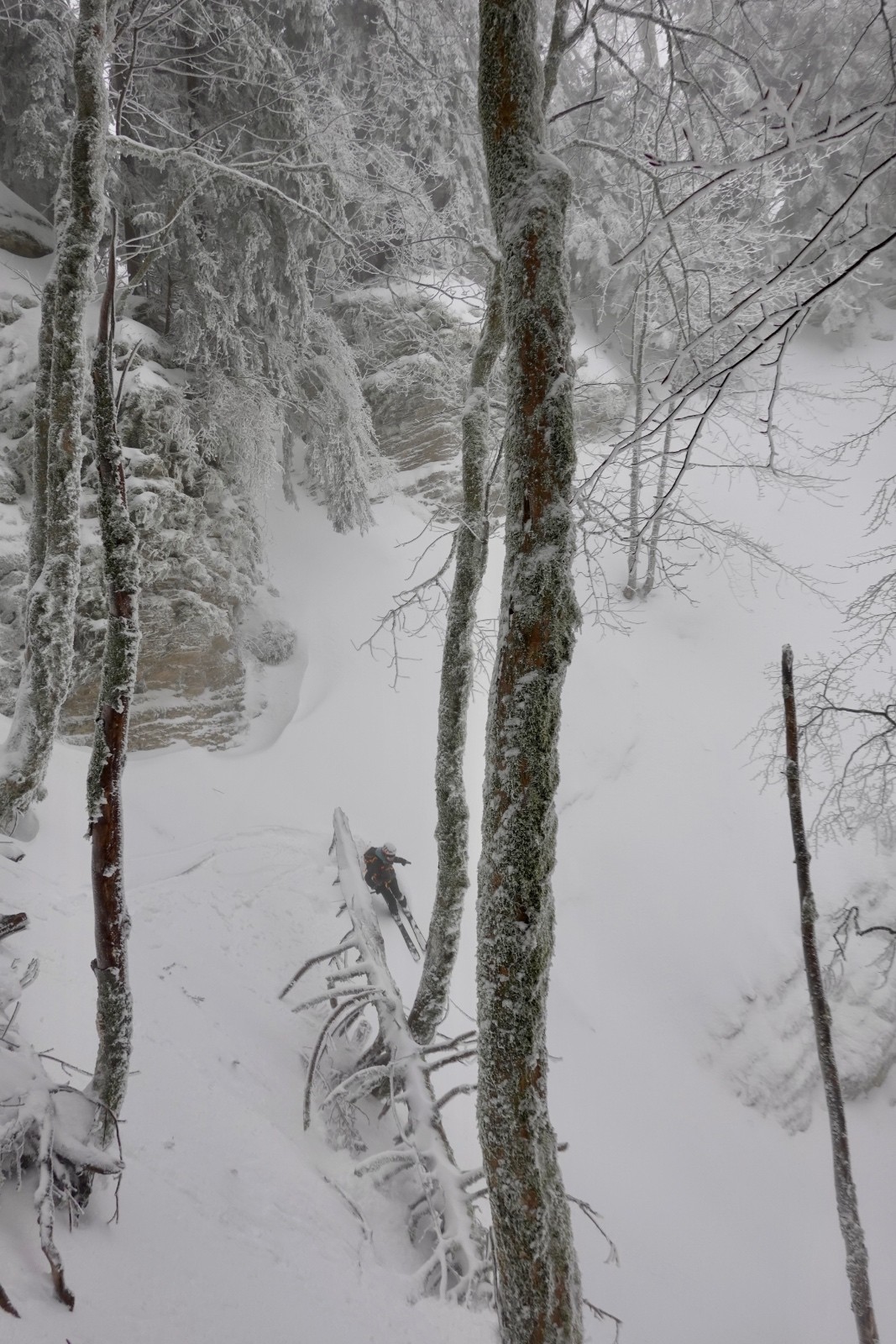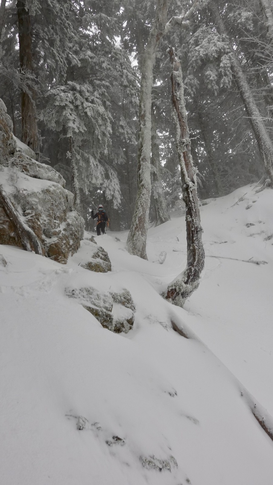 De toute manière, les sous-bois ne sont pas suffisamment enneigés pour sortir des chemins, on fait le tour dudit rocher puis on se laisse tenter par sa face ouest, jusqu'à butter sur un rognon rocheux avec un beau couloir, mais on n'a pas trop envie de gueniller si tôt matin, demi-tour direction le couloir de Corde.