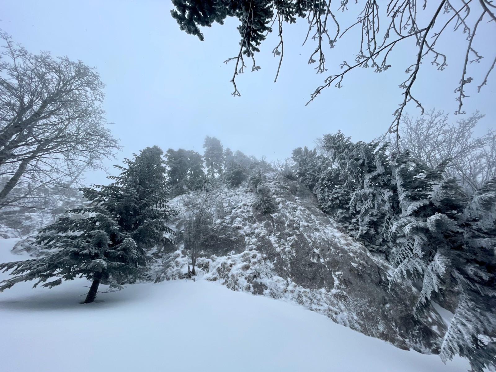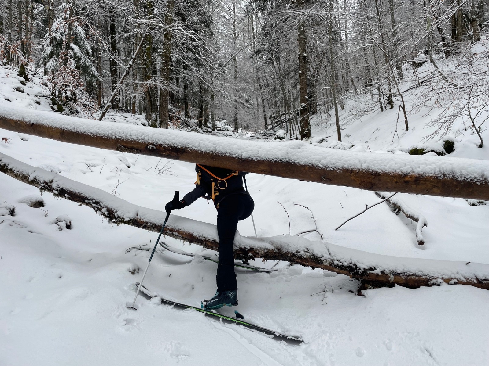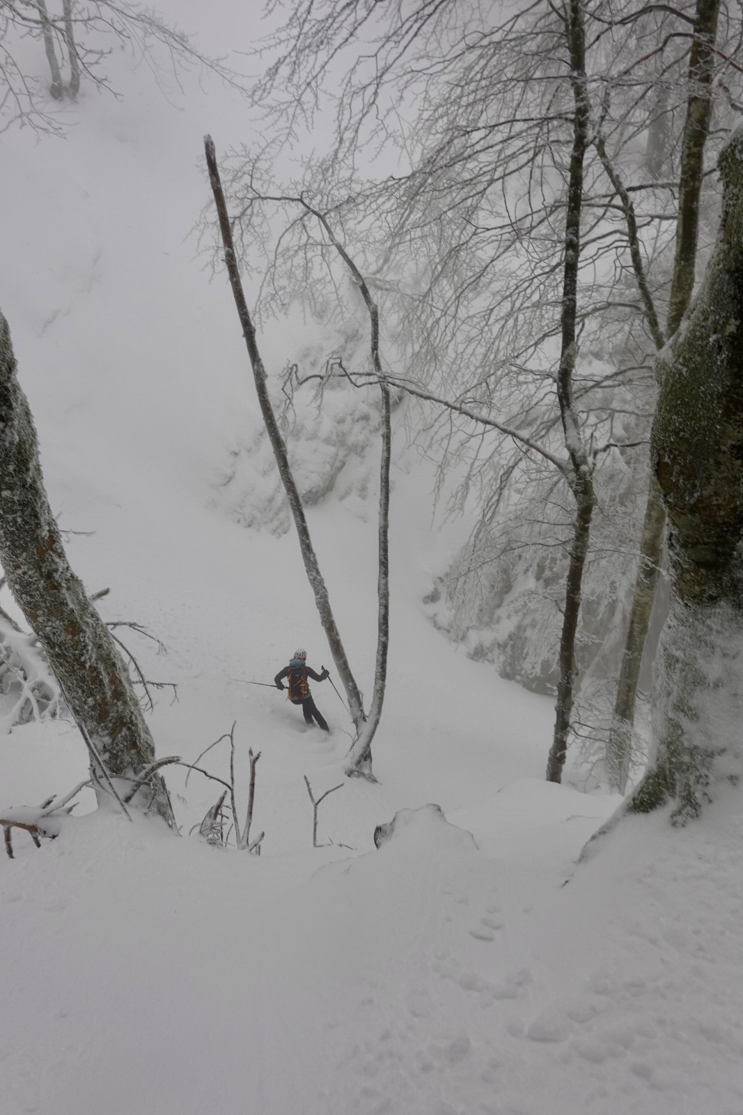 De toute manière, les sous-bois ne sont pas suffisamment enneigés pour sortir des chemins, on fait le tour dudit rocher puis on se laisse tenter par sa face ouest, jusqu'à butter sur un rognon rocheux avec un beau couloir, mais on n'a pas trop envie de gueniller si tôt matin, demi-tour direction le couloir de Corde.