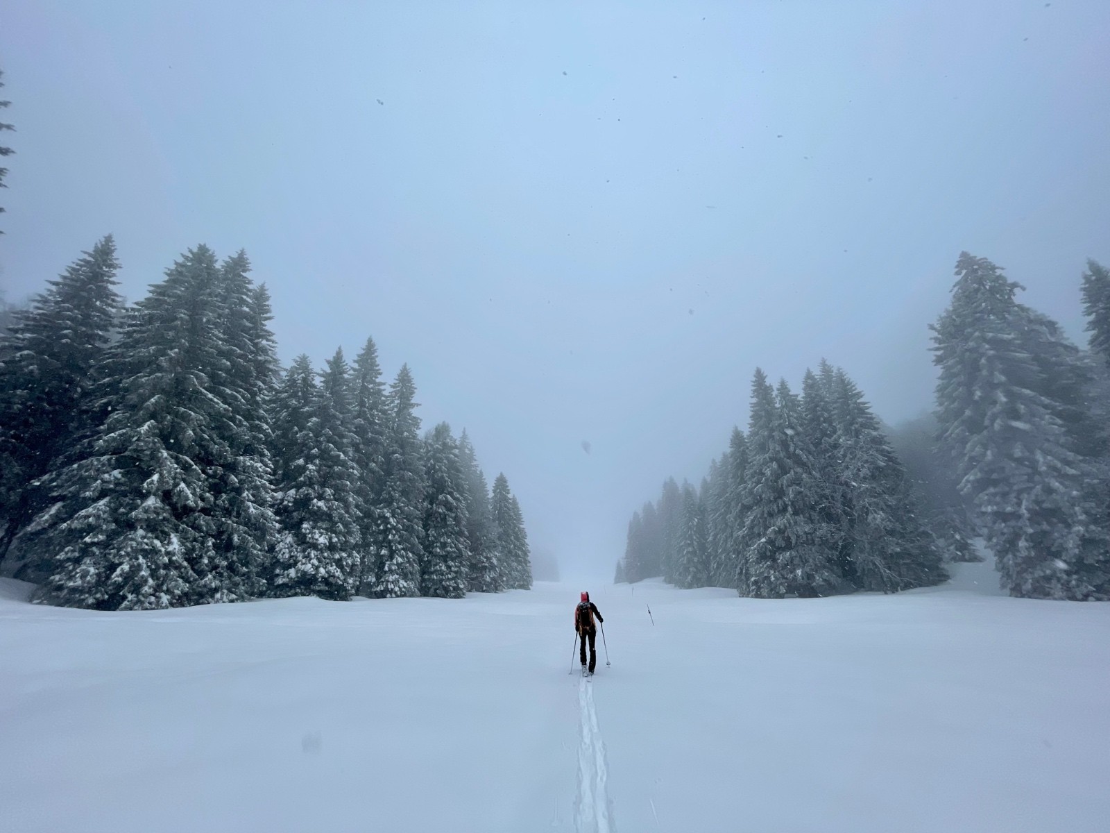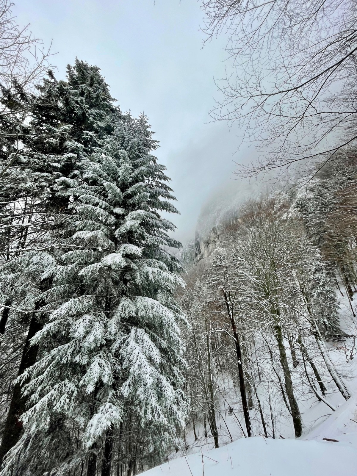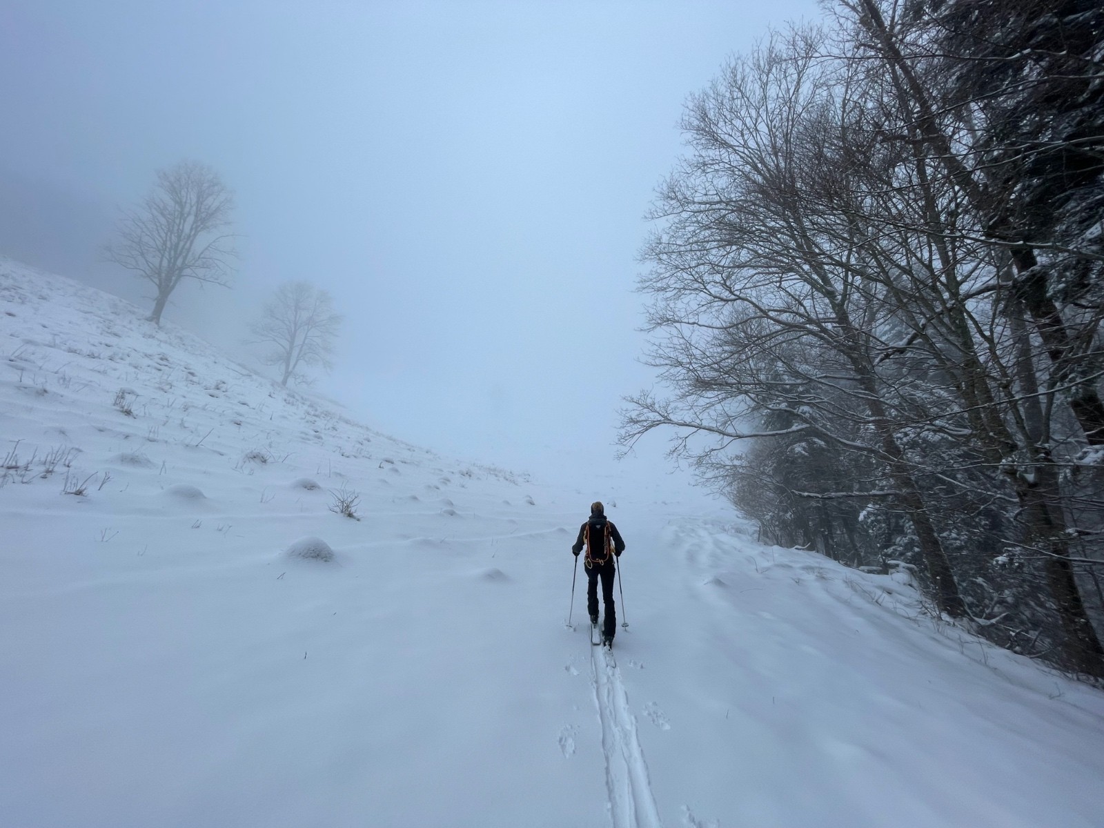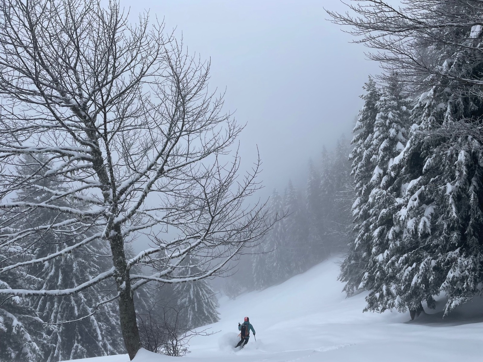 Alors pour ne pas prendre de risques, pour ne pas avoir le mal de mer à force de skier sans visibilité, j'opte pour une boucle en forêt. On pourra, comme la skitourienne qui a inspiré le titre, promener dans les zones de silence et s'émerveiller devant des couleurs qui n'en sont presque pas.