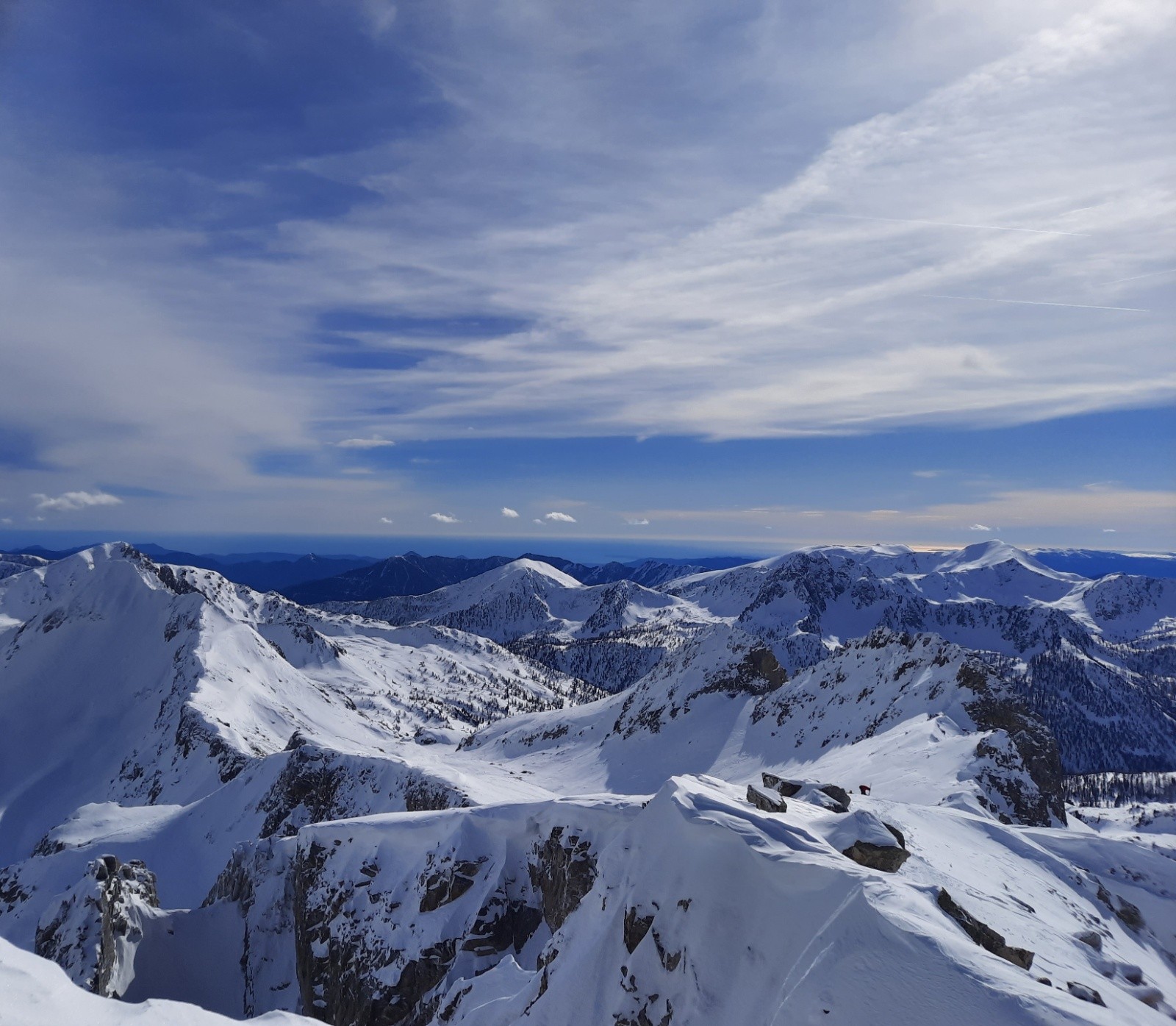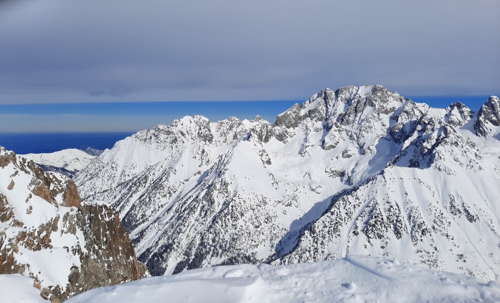 Conditions pour le ski :moyenne ,neige bonne à l'ombre dans la forêt le matin ,s'alourdissant à toutes altitudes par la suite .Bonne trace jusqu'au sommet. Descente sur de la neige un peu lourde et par endroits travaillé par le vent ,ce qui nous oblige à être vigilants..