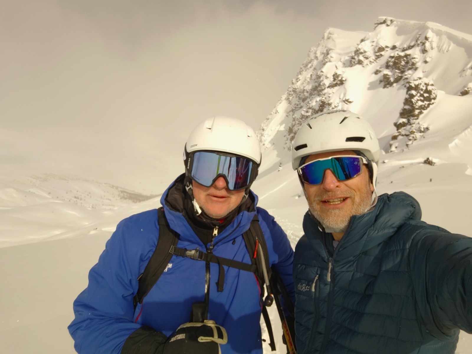 Après les derniers bosquets, dans la traversée, nous sommes relayés par nos poursuivants qui ont pu nous rattraper. Ils traceront jusqu'au col. Là haut, le soleil joue à cache-cache entre les bourrasques bien frisquettes. On se pose quand même un bon moment, car des amis sont supposés venir en partant un peu après nous ; mais ils ne figurent pas parmi les arrivants suivants, on décide alors de descendre. Ils ont finalement opté pour les pistes d'alpin ou de fond, ce qui n'était sûrement pas un mauvais choix vu les conditions.