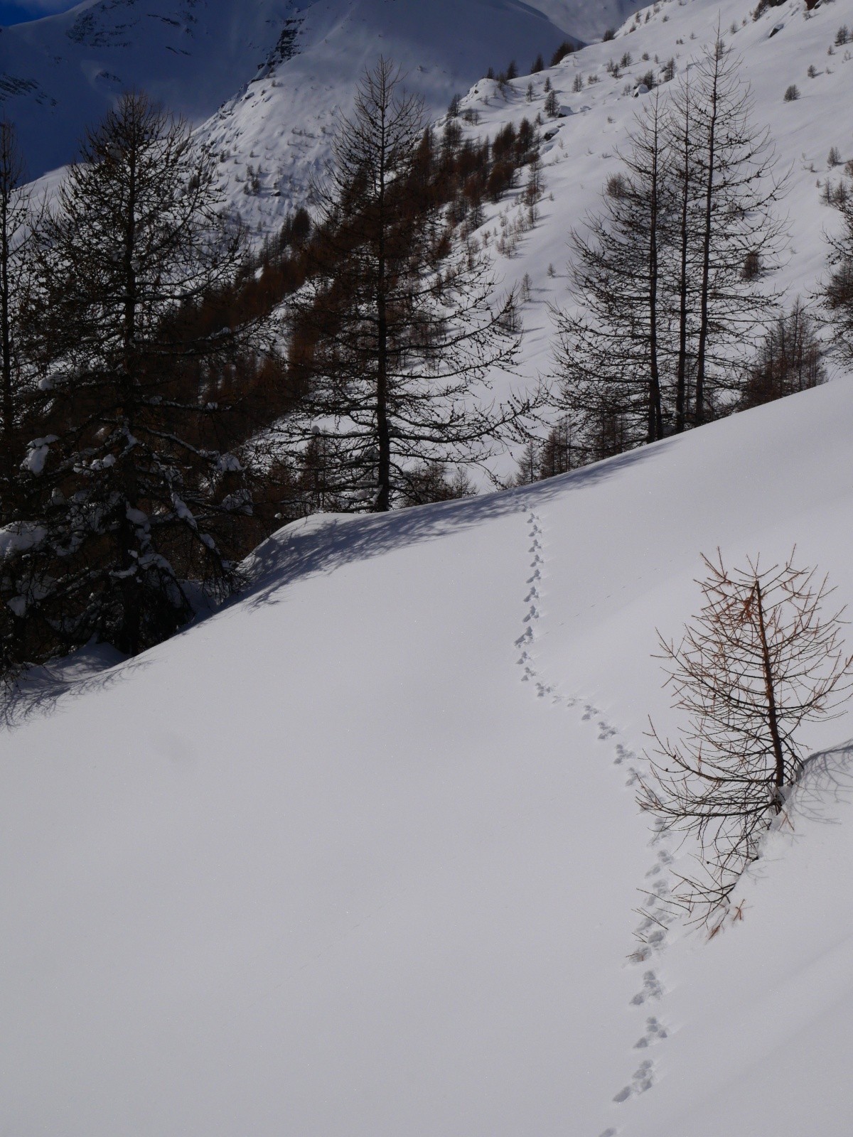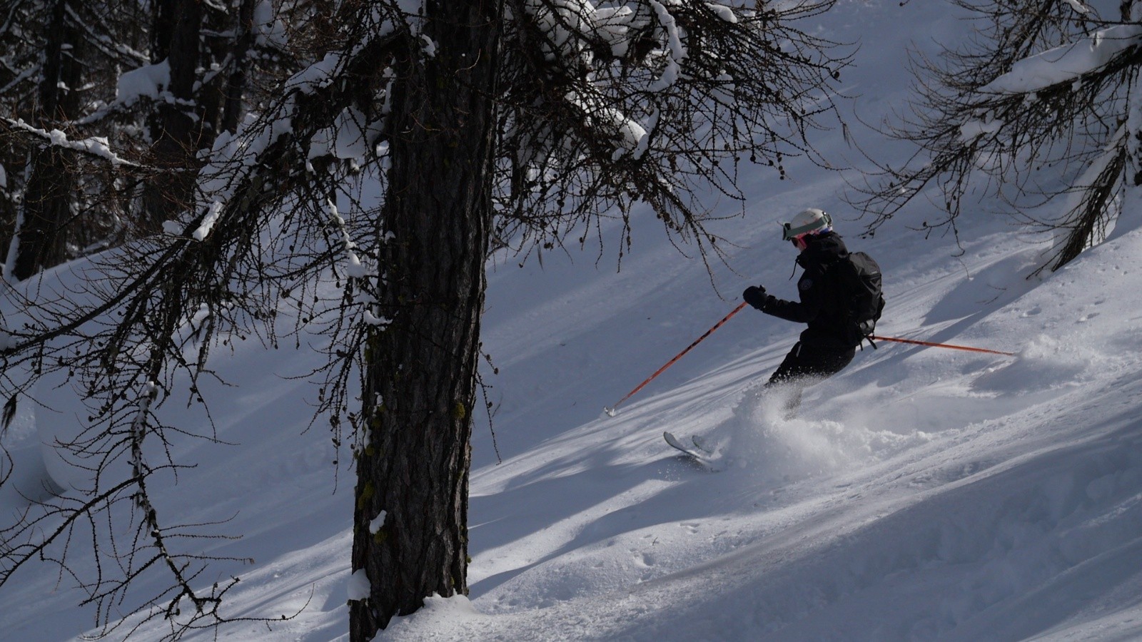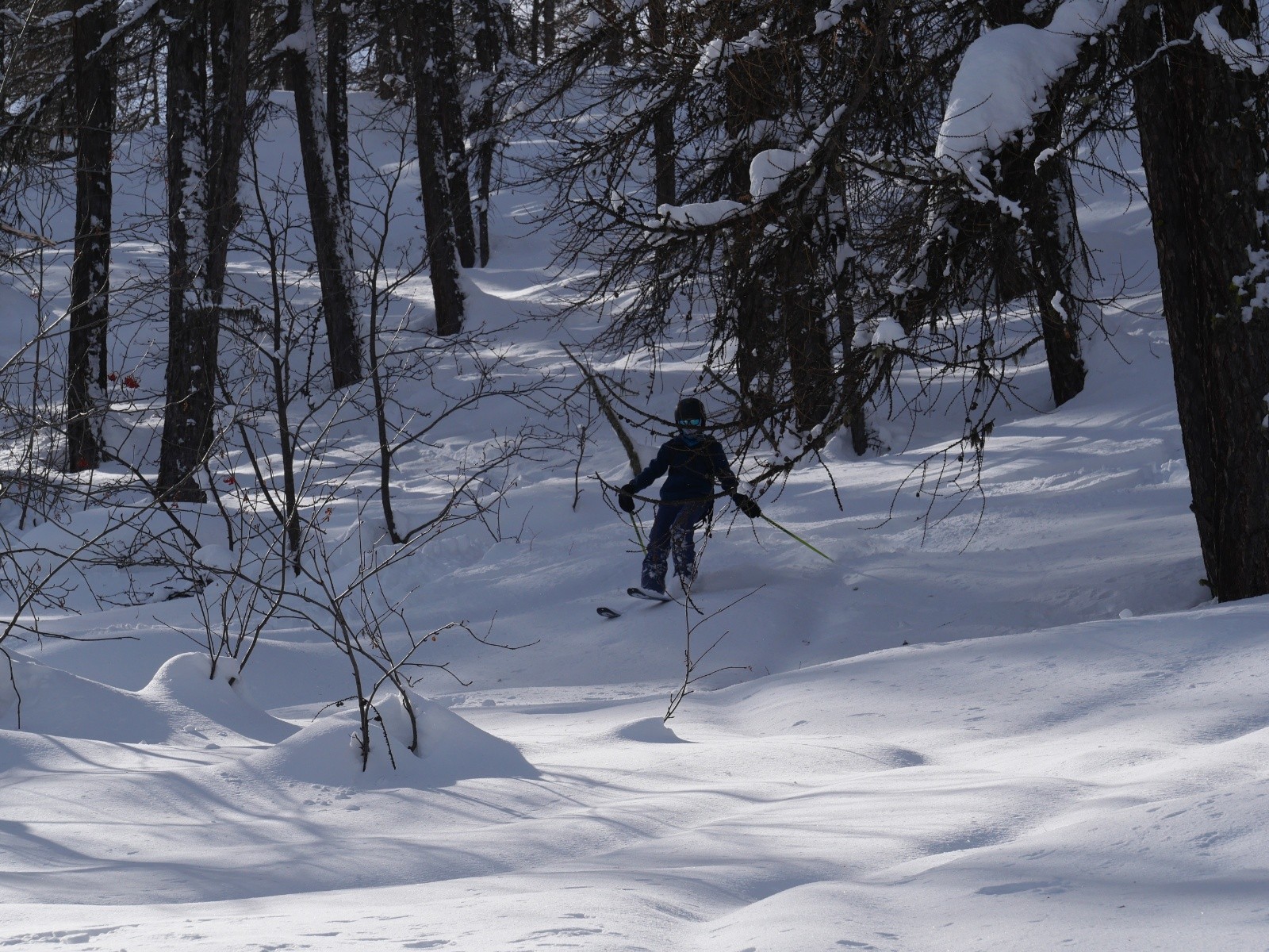 Toujours aussi chouette avec une belle lumière du sud entre les melézes enneigés et des souches à gogo pour jouer dans la grosse peuf.