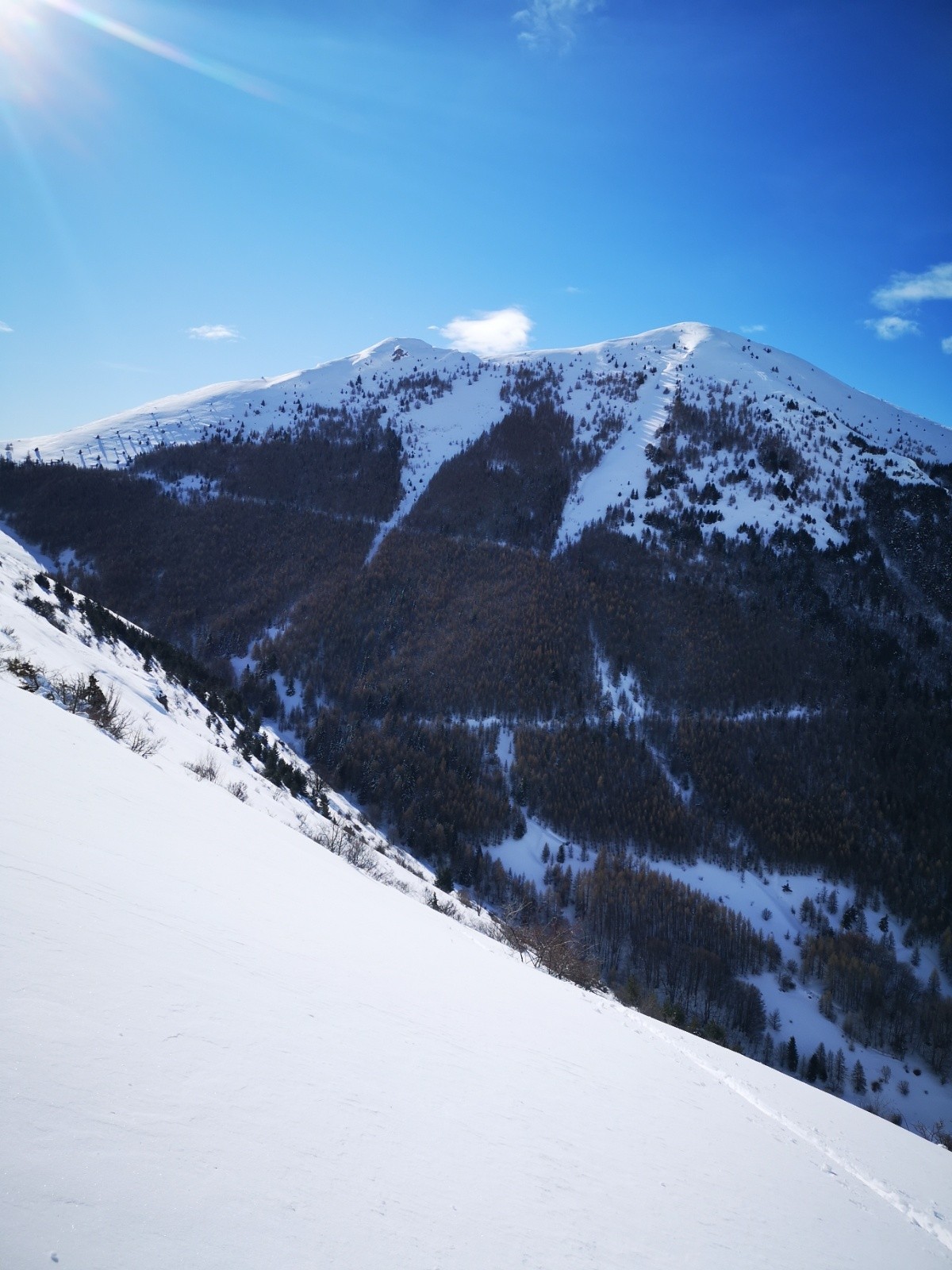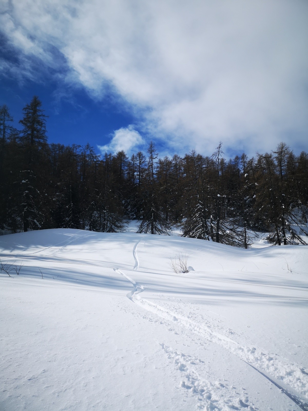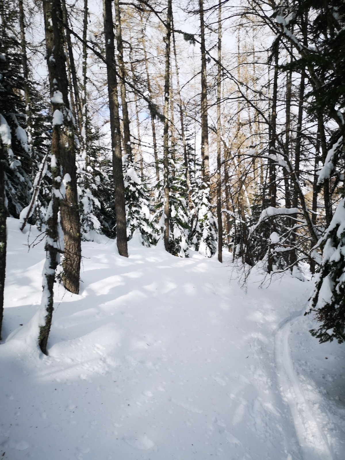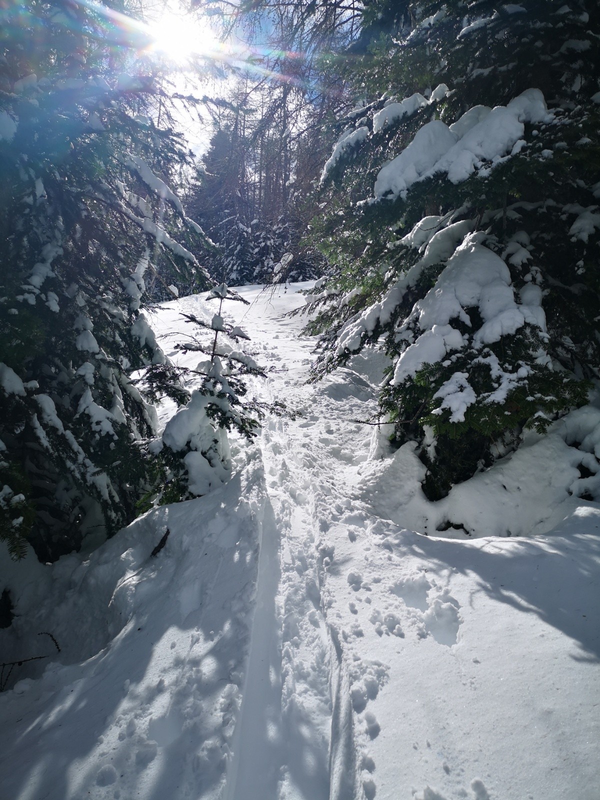 Conditions pour le ski : neige encore froide poudreuse lourde à l'ombre, transfo rapide en E et S. Grosse poudre lourde en forêt, ventee et lissée par le vent N mais rien de glacé. Pas ou peu de croûte sur ce parcours