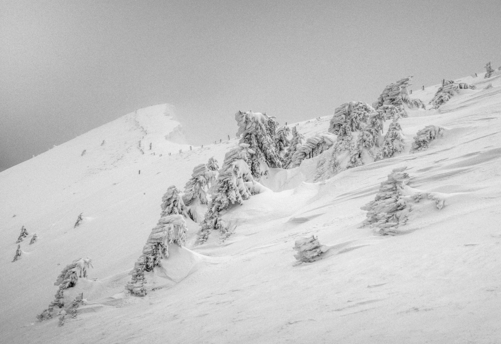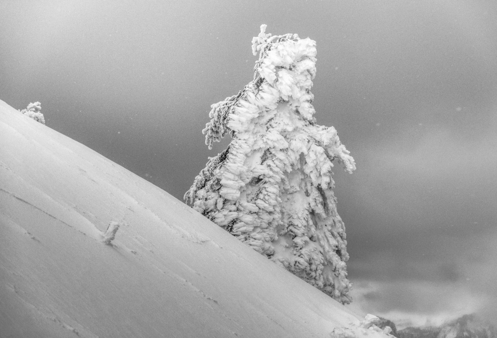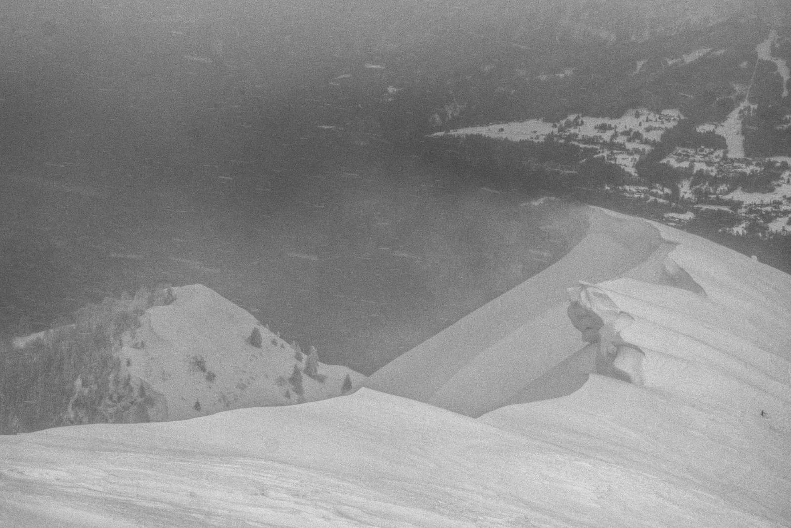 Des corniches énormes. Les arbres couchés par le vent et la neige. Des congères qui barrent le passage. Une couche épaisse et compacte posée sur de la glace.