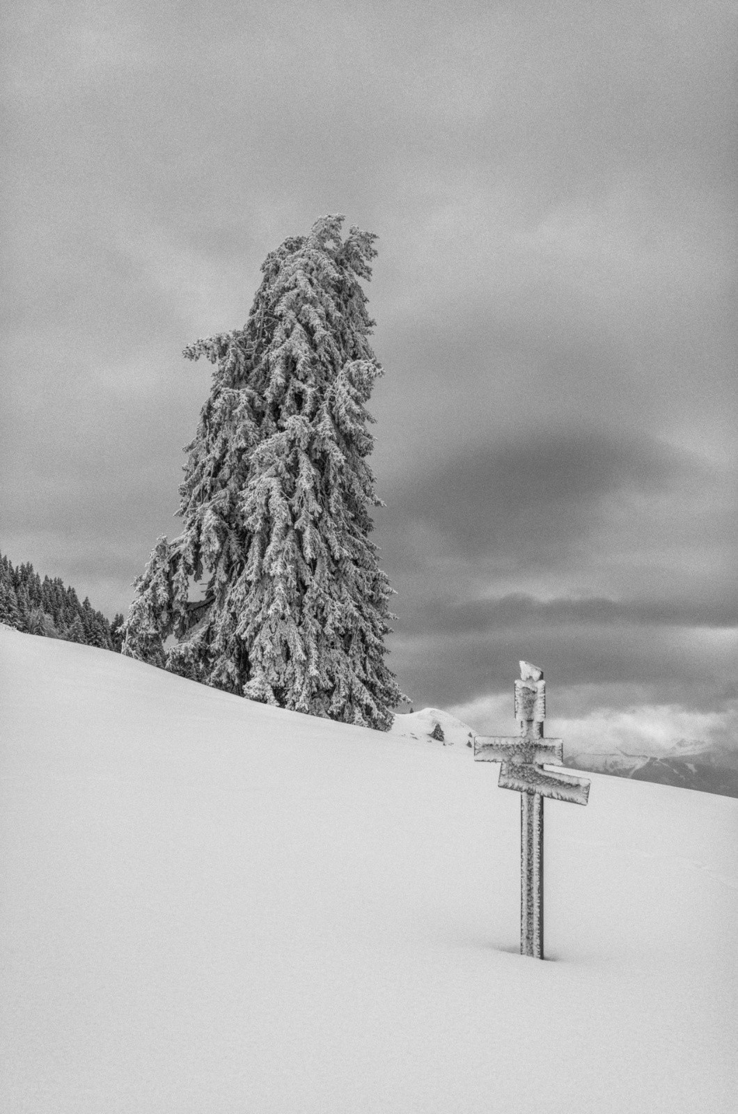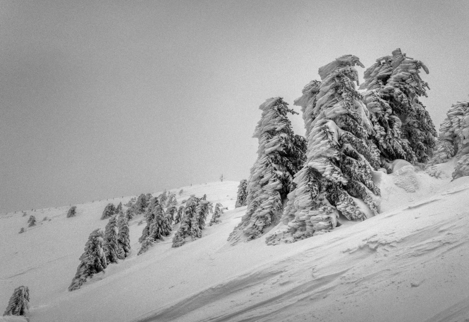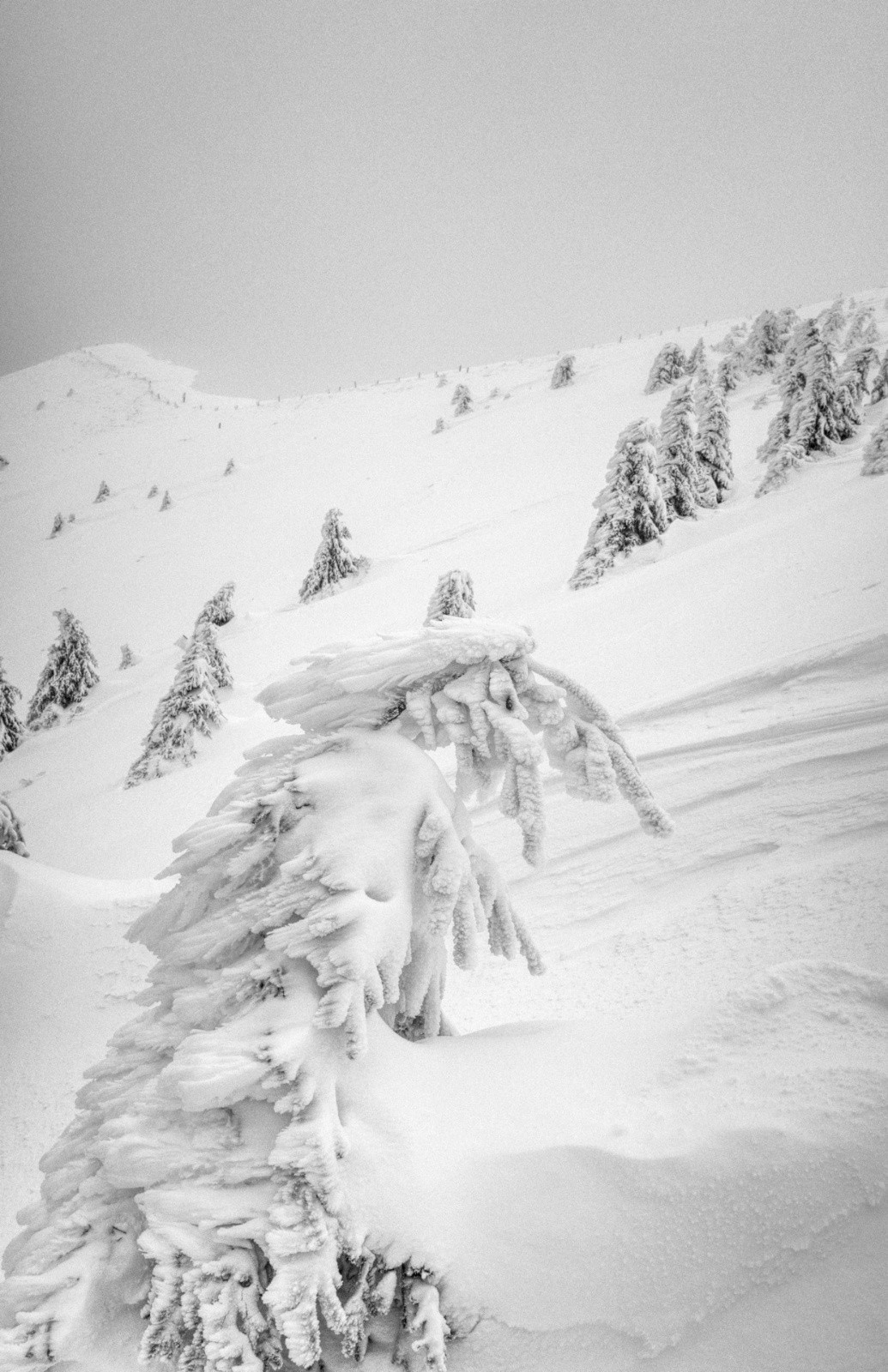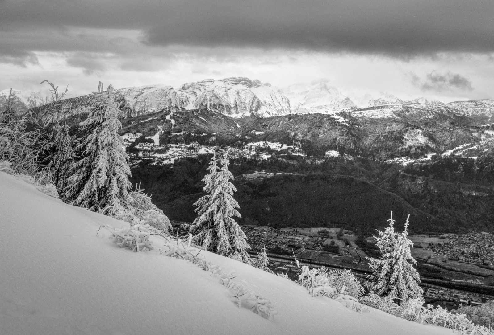 Des corniches énormes. Les arbres couchés par le vent et la neige. Des congères qui barrent le passage. Une couche épaisse et compacte posée sur de la glace.