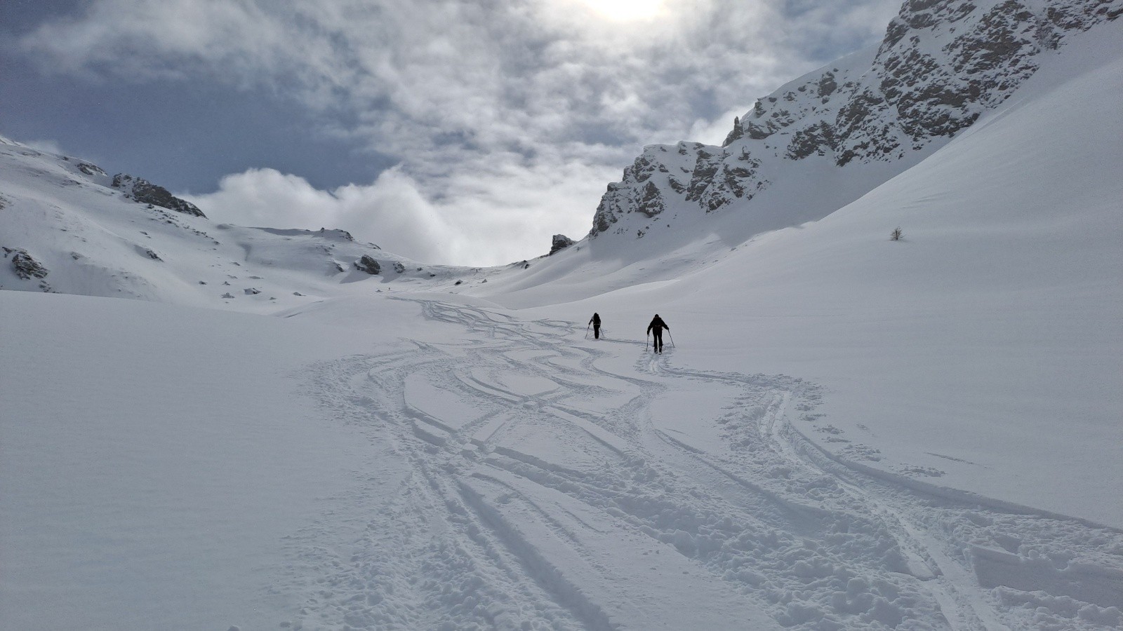 Itinéraire suivi : Nous sommes montés juste après l'arrêt des chutes de neige. D'autres avaient déjà fait la trace jusqu'au col, merci à eux. Il y a beaucoup de poudreuse et dans de nombreuses parties on peut descendre quasiment tout droit vu la pente. Nous avons vu une petite coulée d epurge un peu avant le col mais vraiment pas grand chose, juste un peu de neige en équilibre instable au dessus d'une petite falaise de château renard. Il y a également une petite coulée venat du pic juste avant le col. Rien n'a bougé dans le couloir nord.